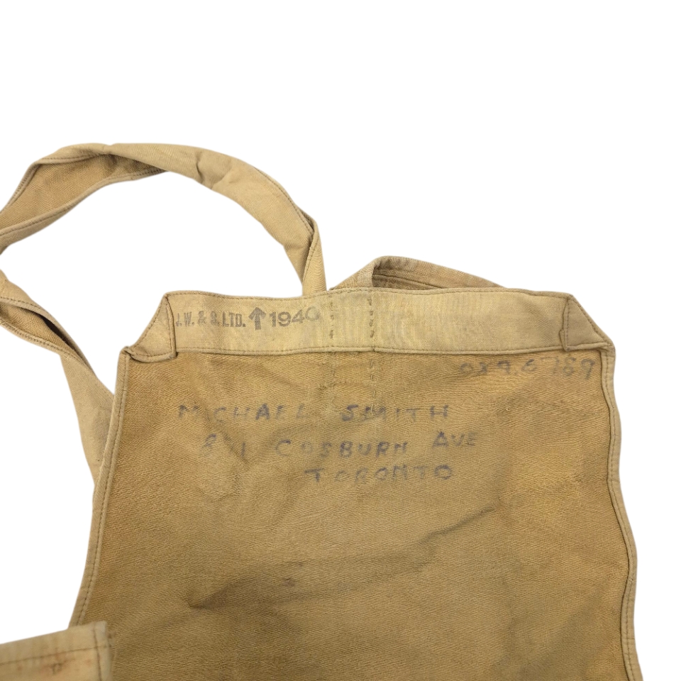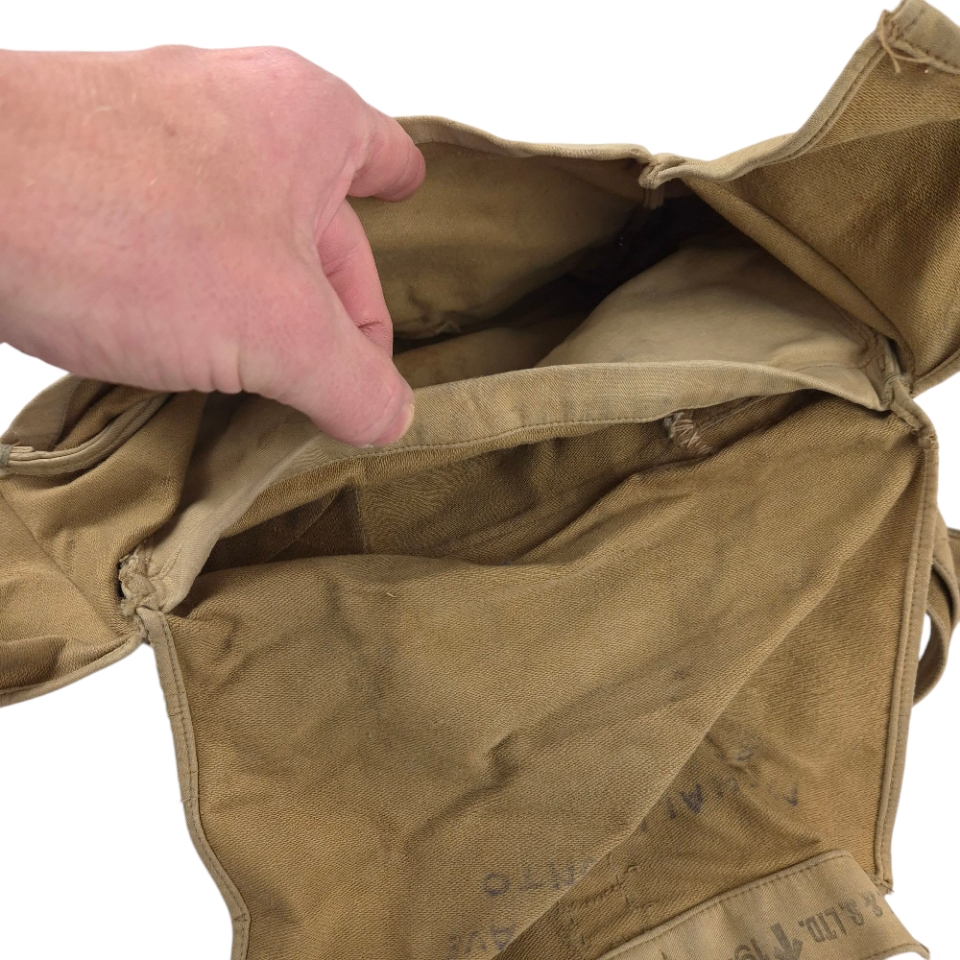 Original WWII British satchel signals bag with carrying strap. The bag is on the inside nicely maker marked J.W. & S Ltd. and dated 1940.
