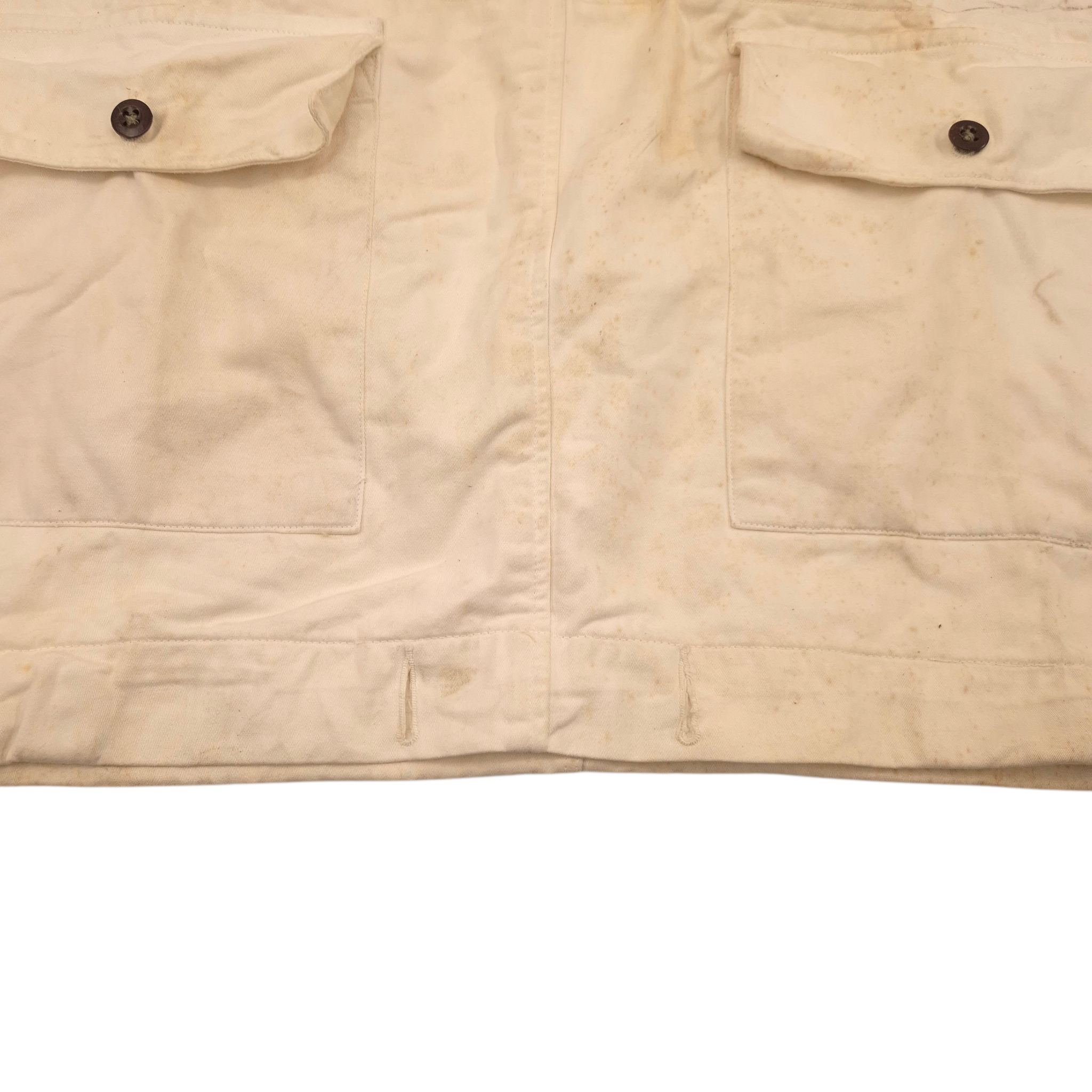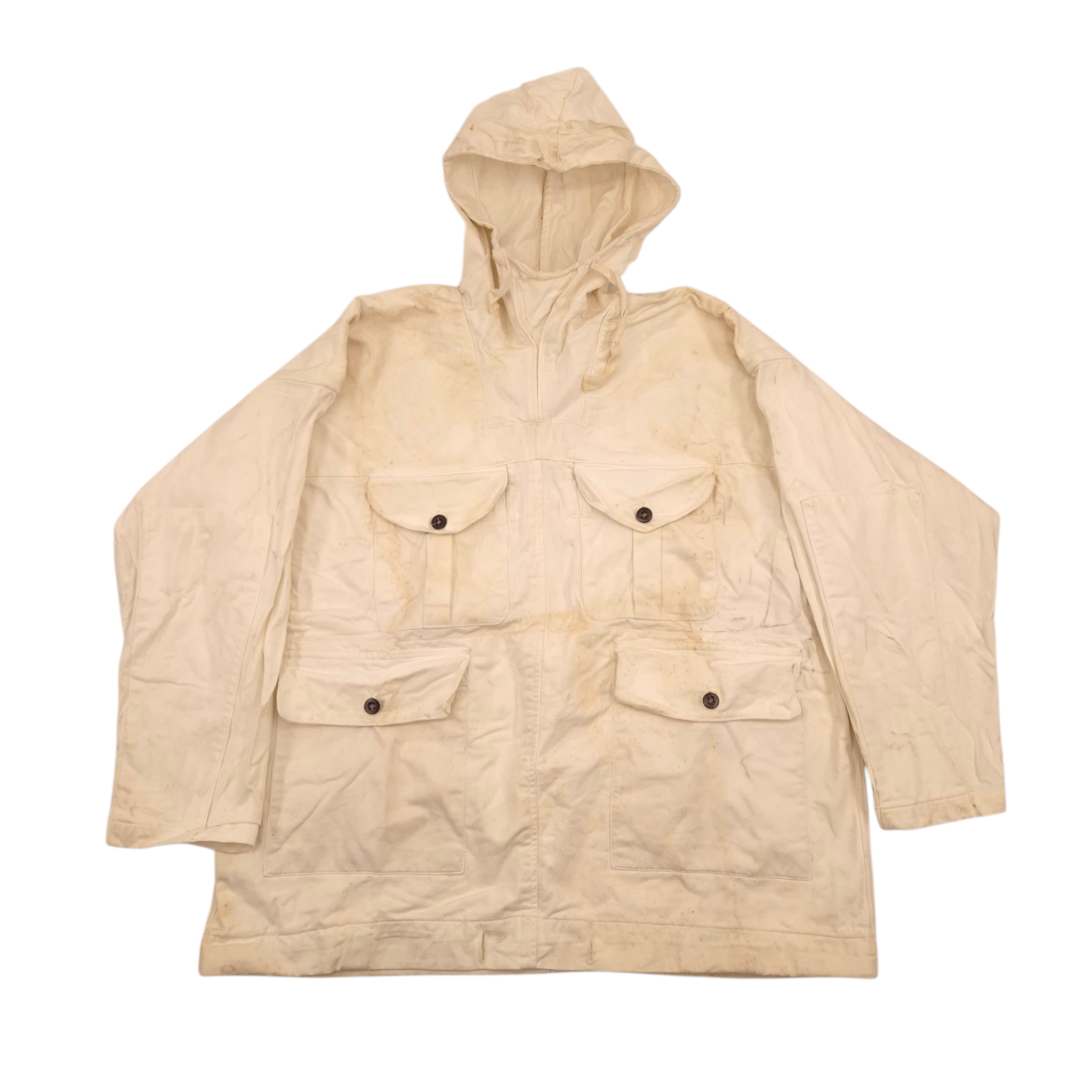 Original WWII British Snow Suit. The snow suits were heavy-weight white coloured cotton garments that were issued to be worn during periods of cold weather while the terrain was covered in snows. The jacket remains in good used condition, with staining in areas where equipment was worn, a cut to the lower back, and the lower drawstring is not full length. The original label is no longer present. These were also worn by American troops.