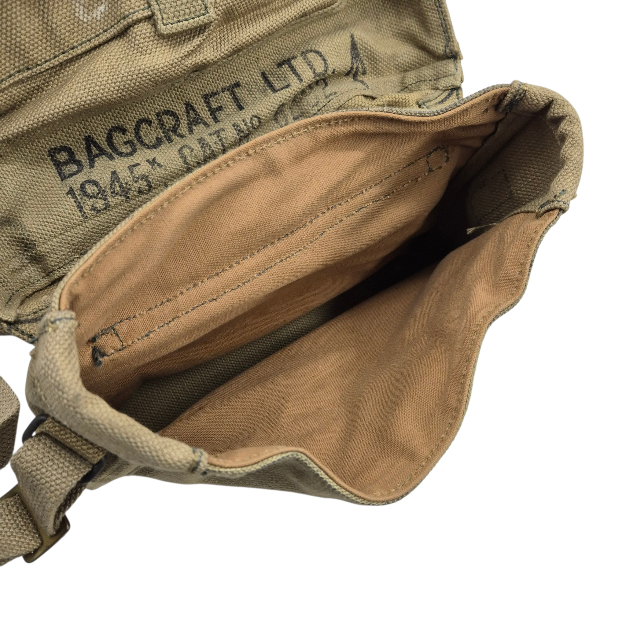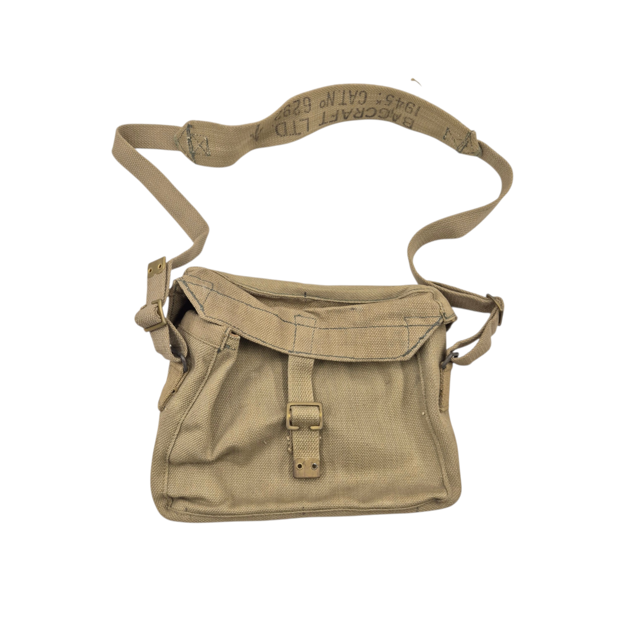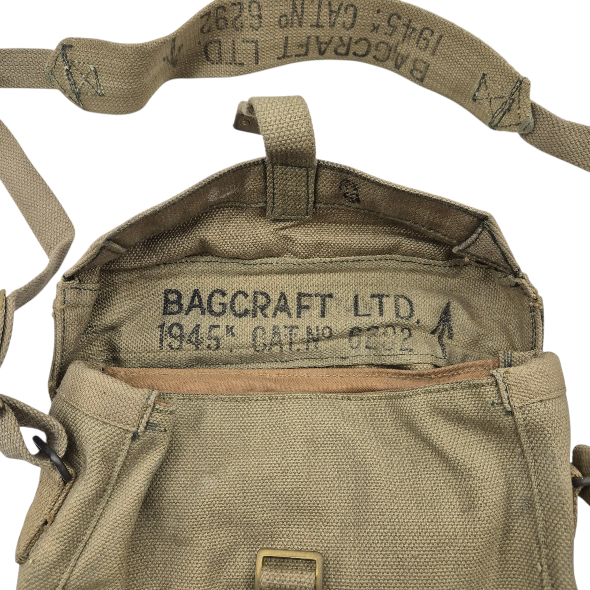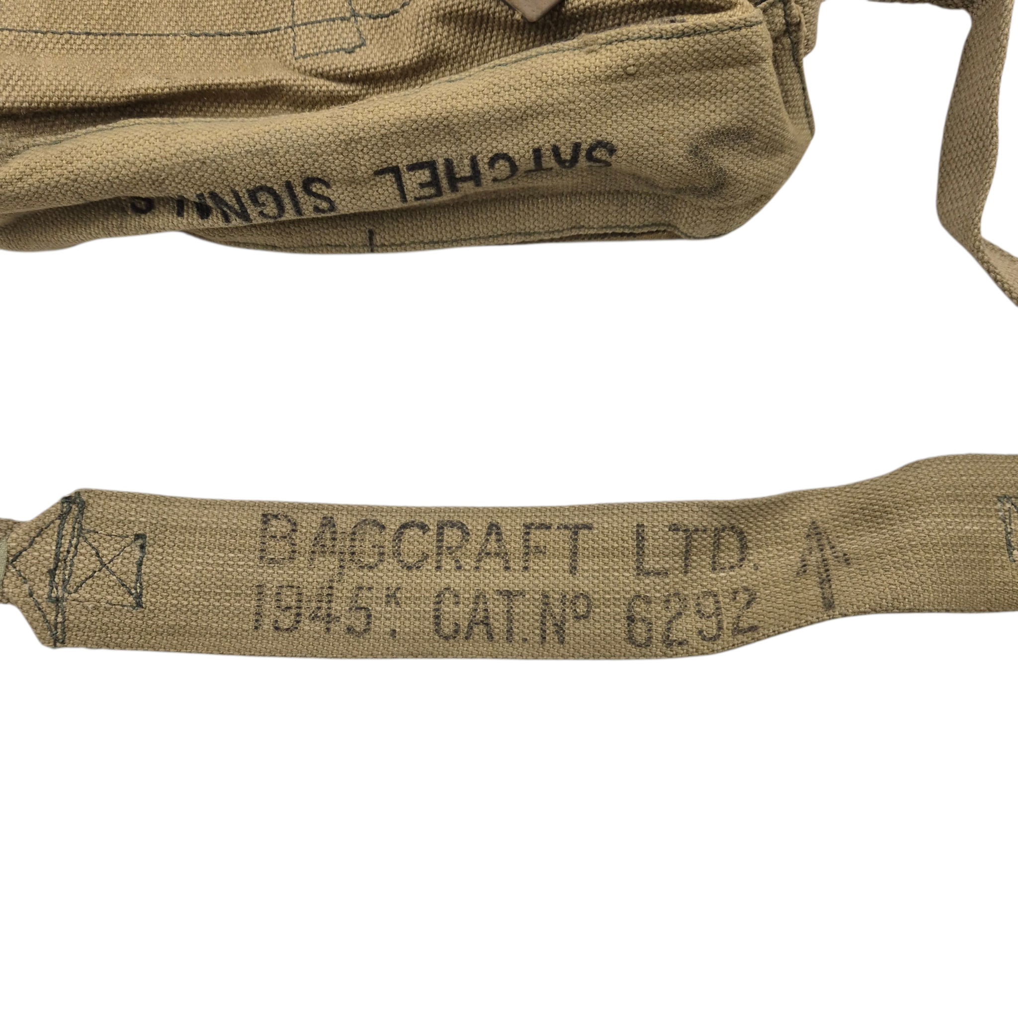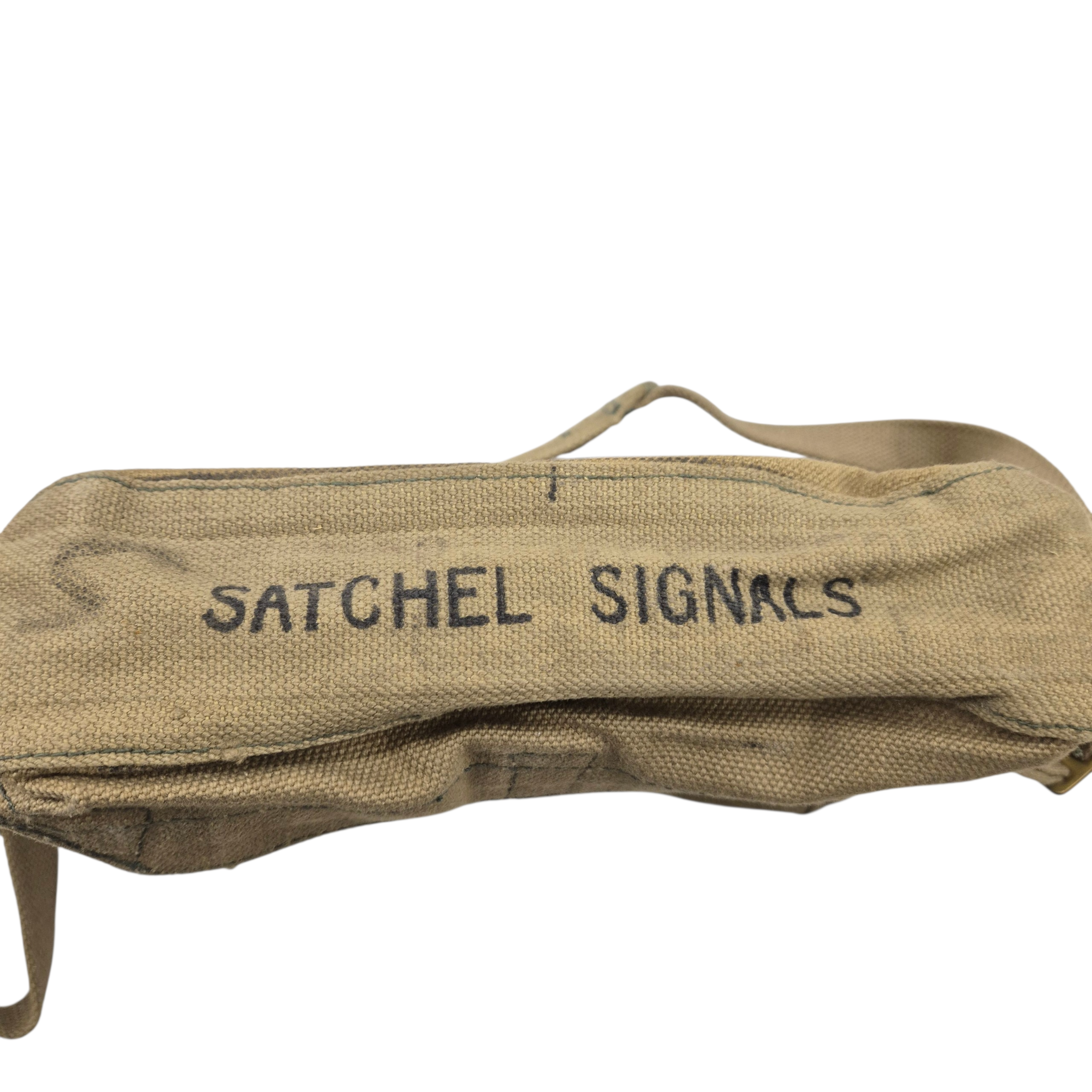 Original WWII British webbing Signals Satchel, stamped on the top flap “Satchel Signals.” The bag is in unused condition and is complete with its matching carrying strap, maker marked Bagcraft dated 1945. This bag is beautifully stamped!