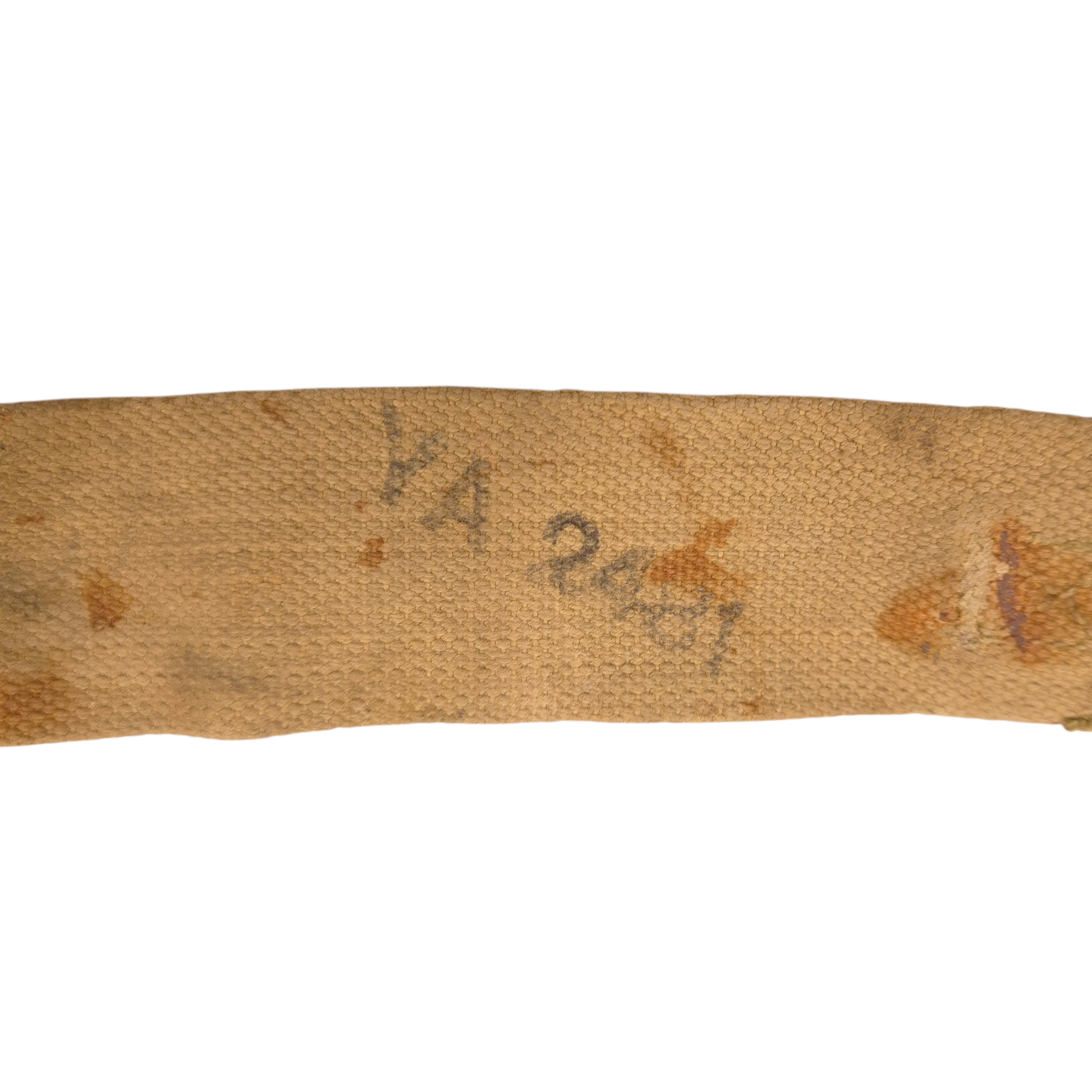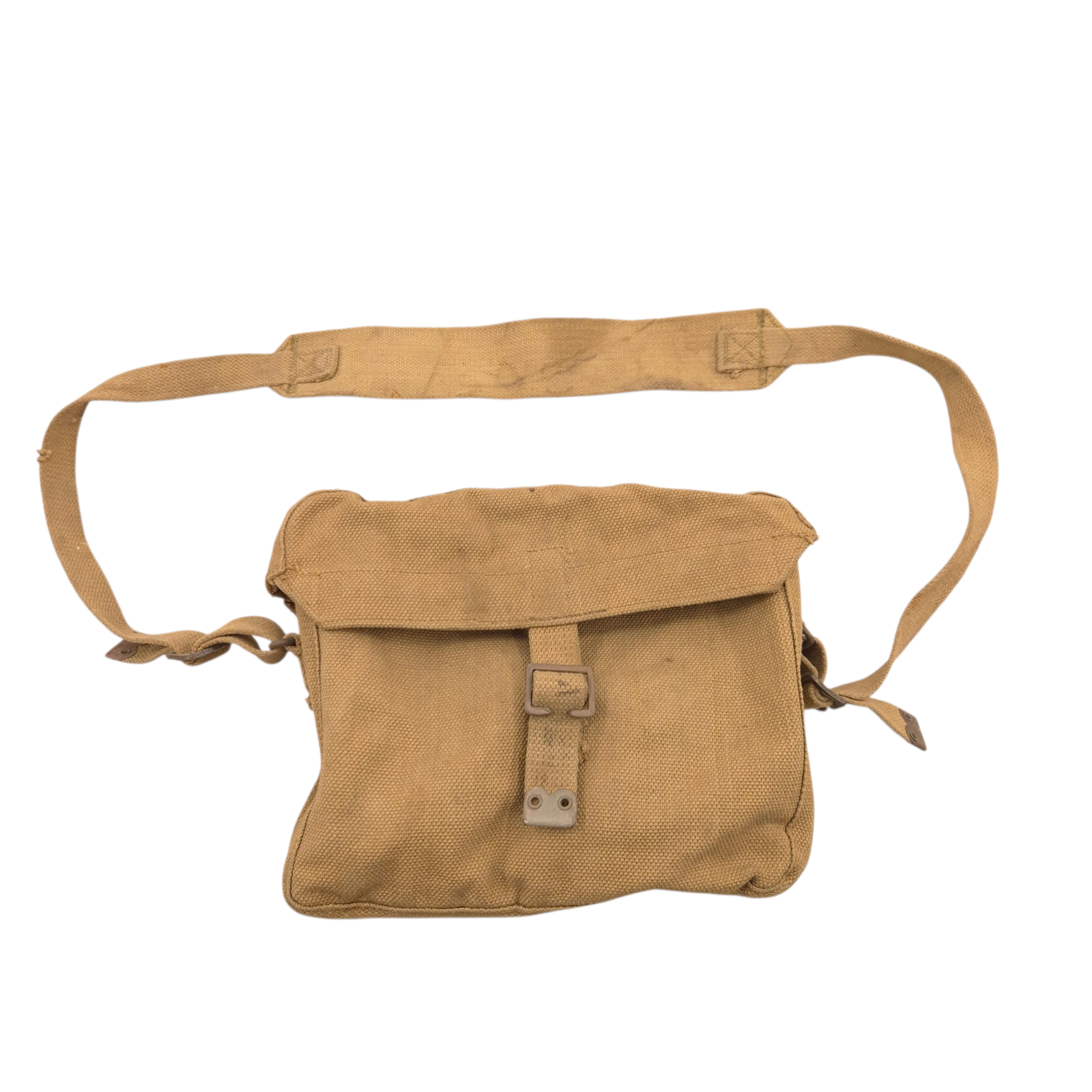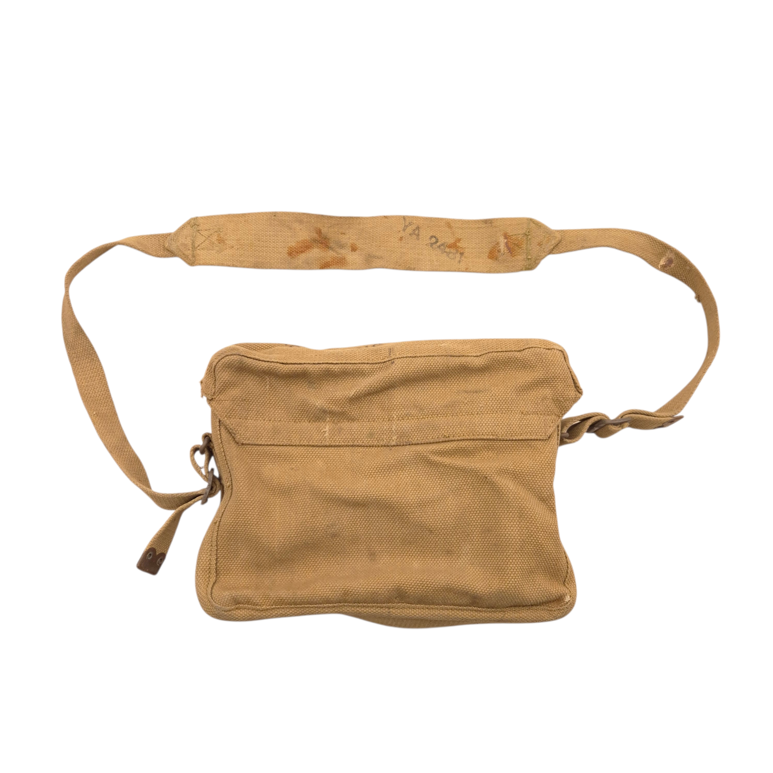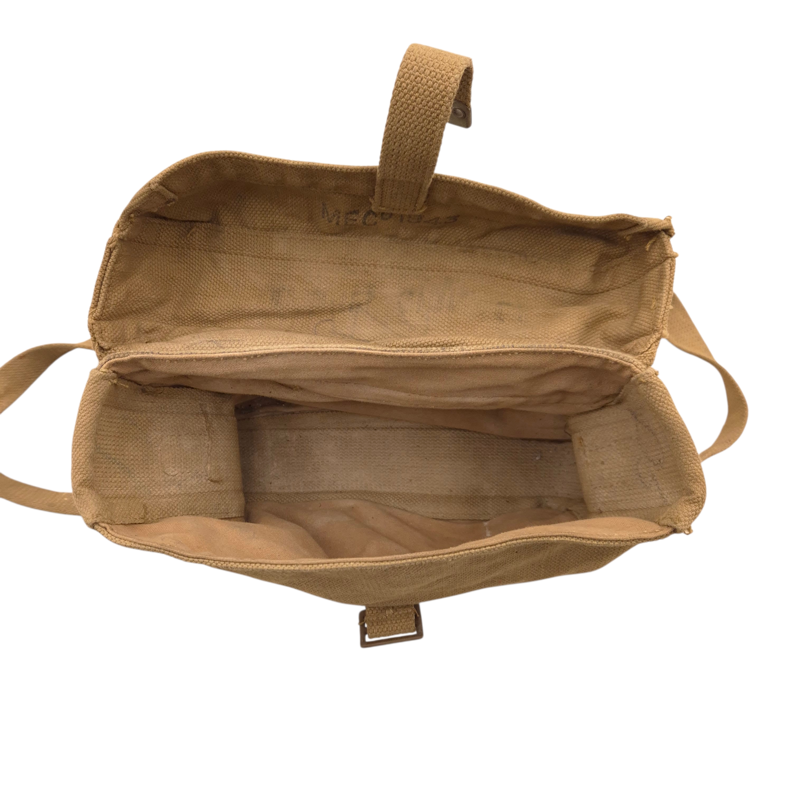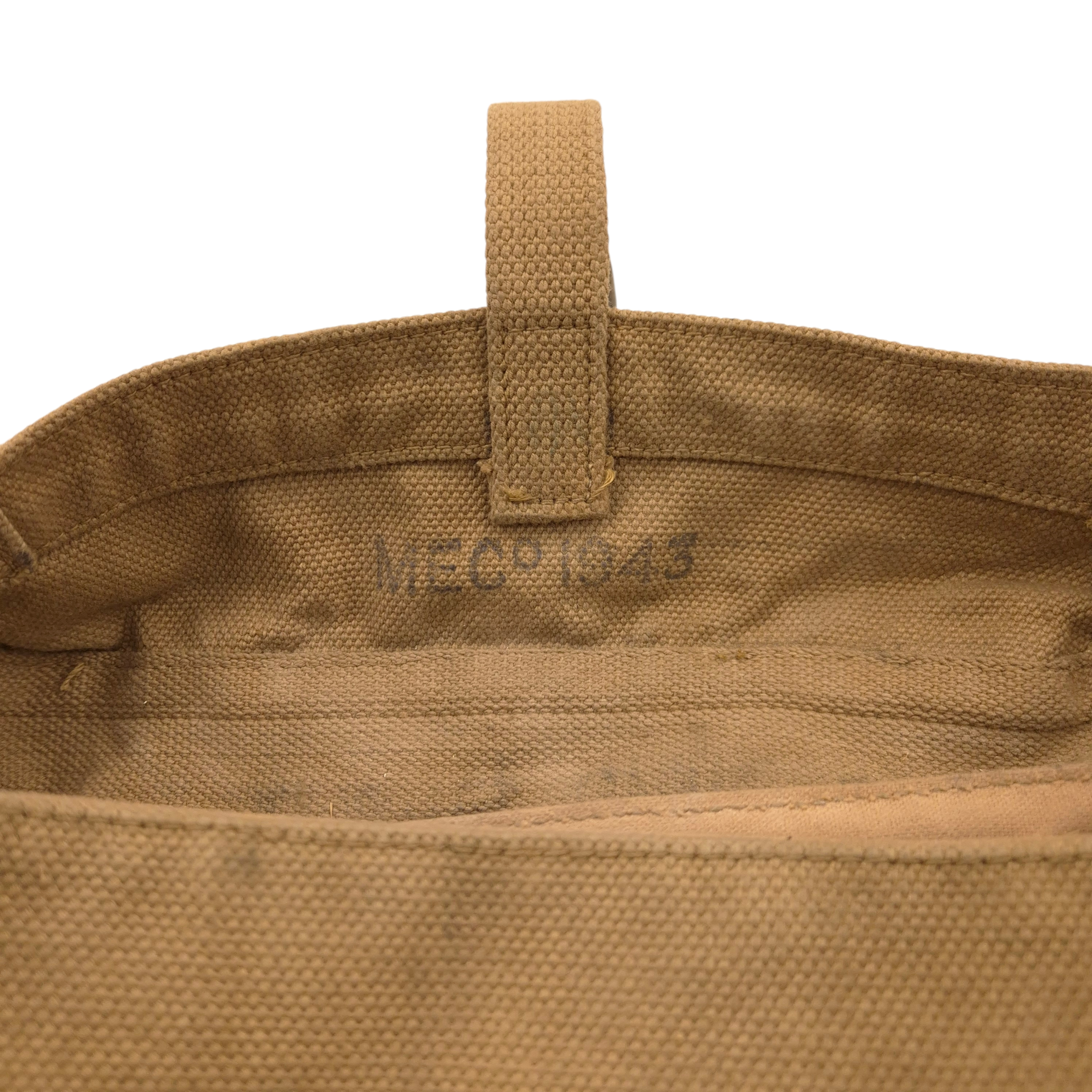 Original WWII British webbing Signals Satchel, stamped on the top flap “Satchel Signals.” The bag is in good condition and is complete with its original carrying strap, marked YA-2481, intended for radio equipment. Maker marked MECo, dated 1943.