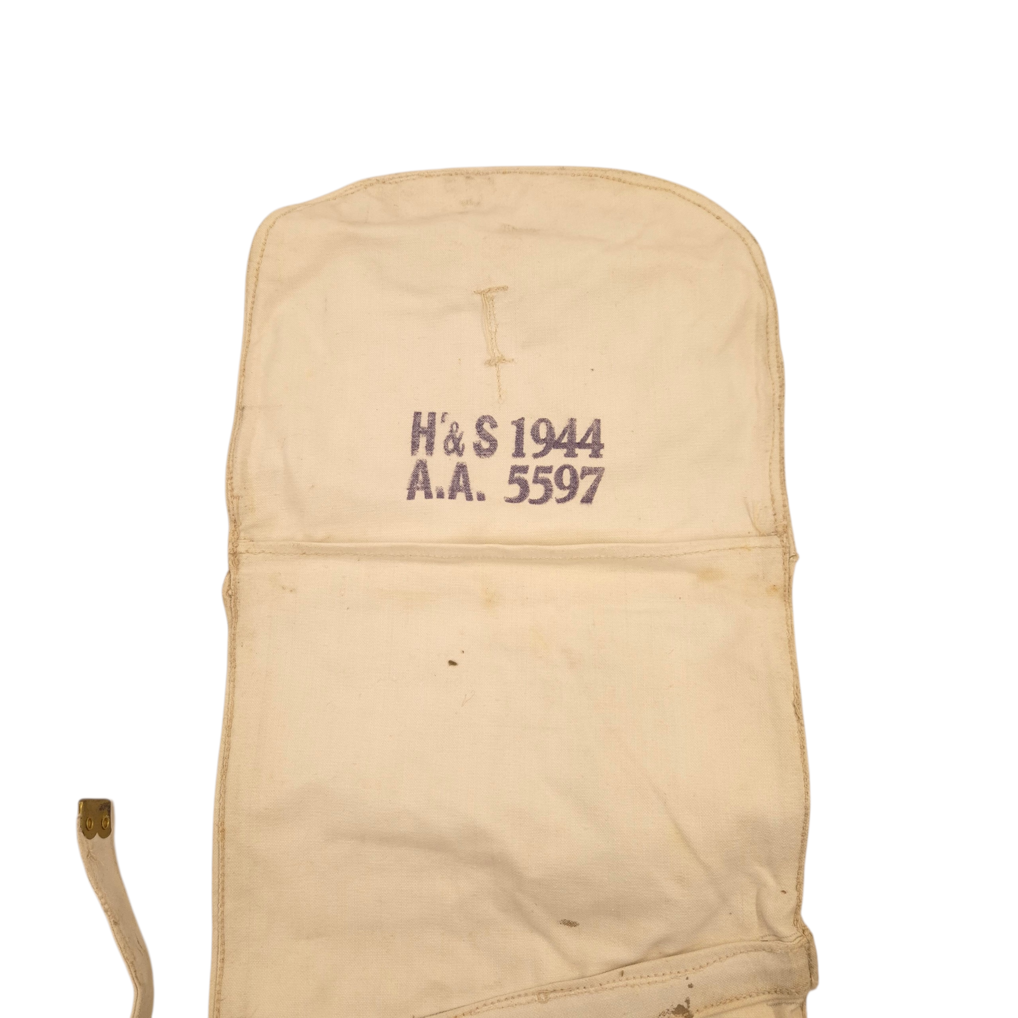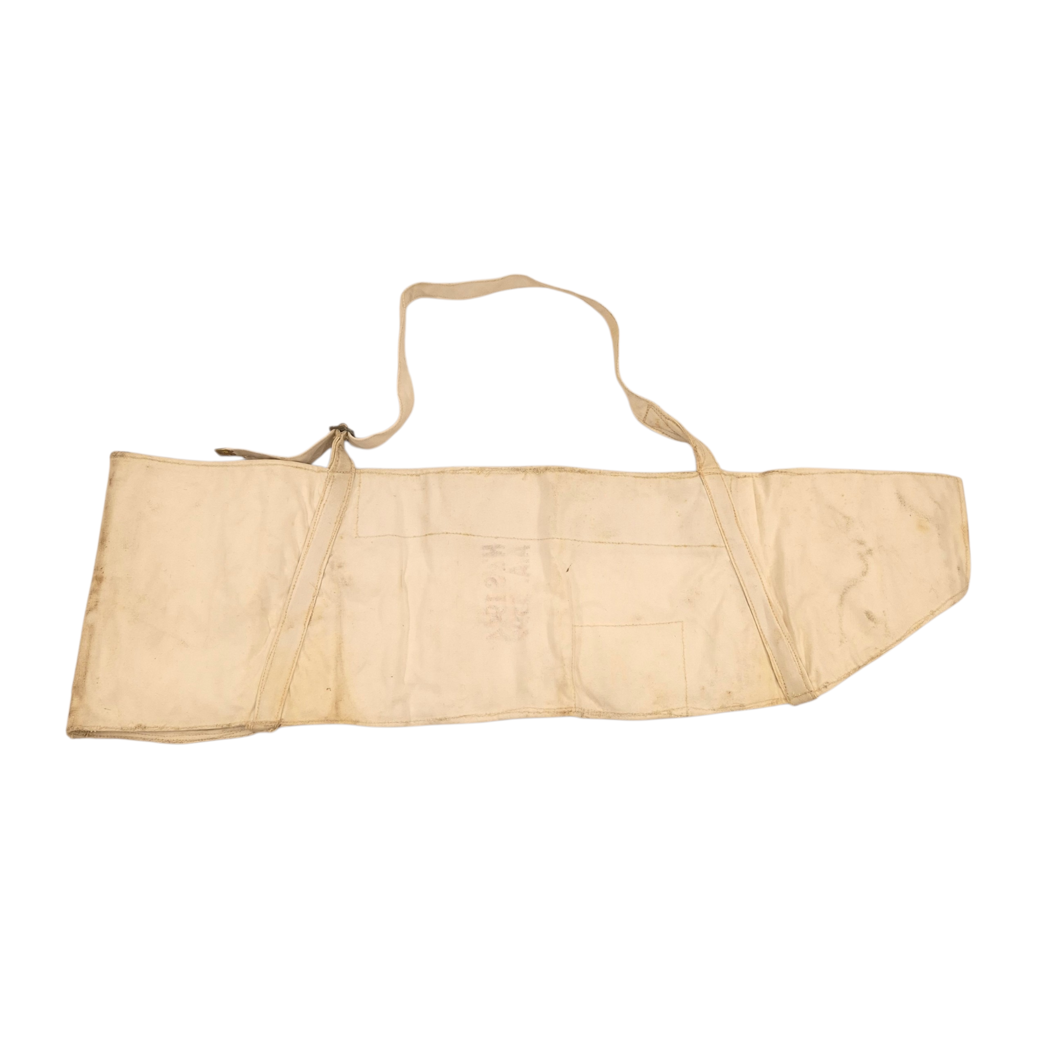 Original WWII British White Bren Gun Cover. This is a white gun cover use with the Bren gun. This example is maker marked “H&S” and dated 1944. The cover would fit the Bren when it is broken down and the barrel was removed and carried in a separate barrel carrier. Nice item for display with the Bren gun.