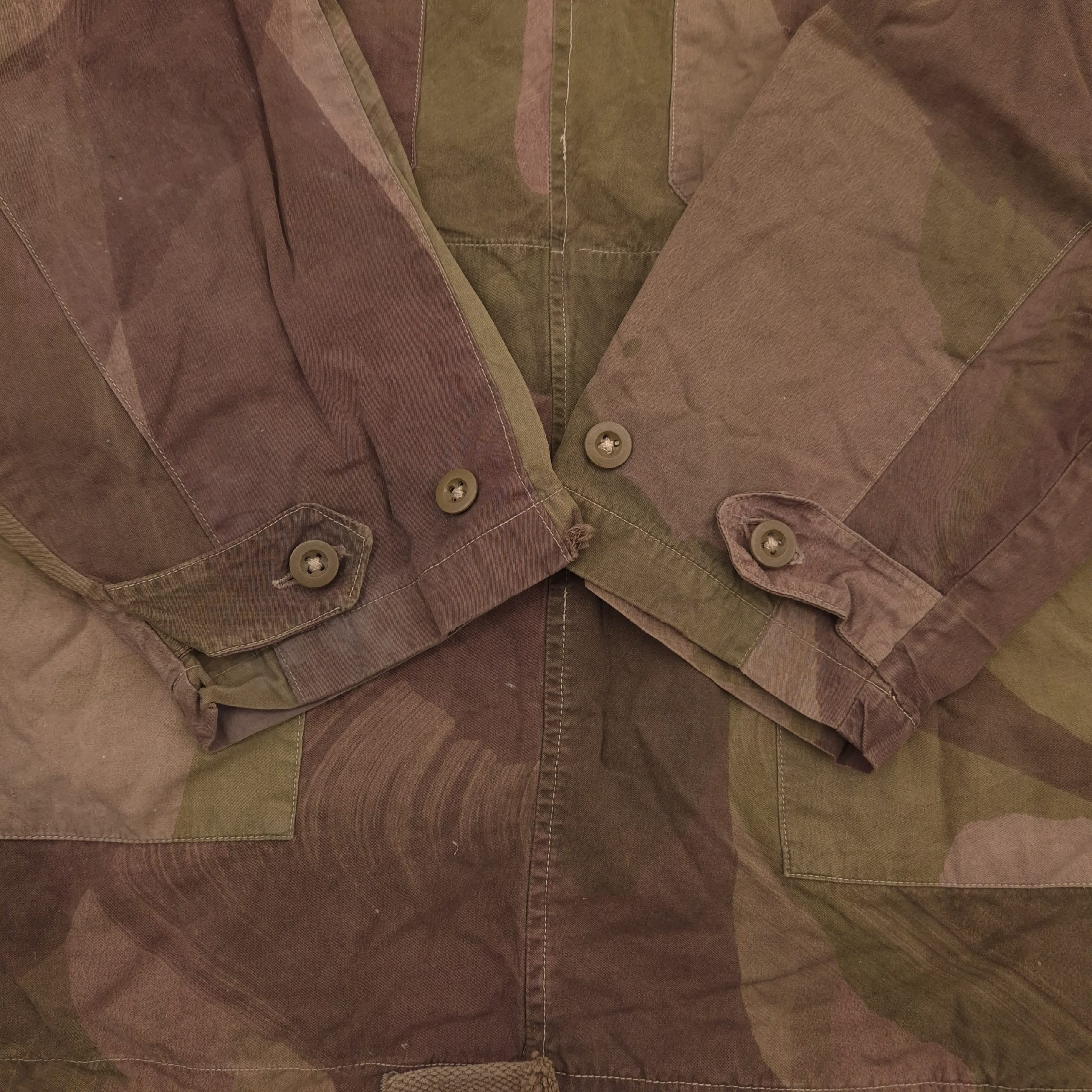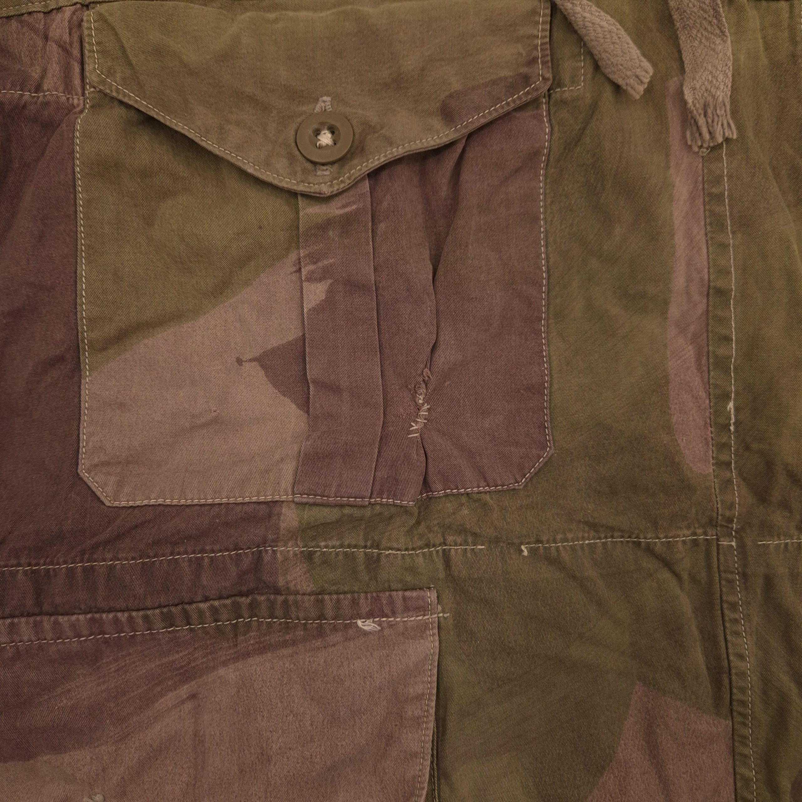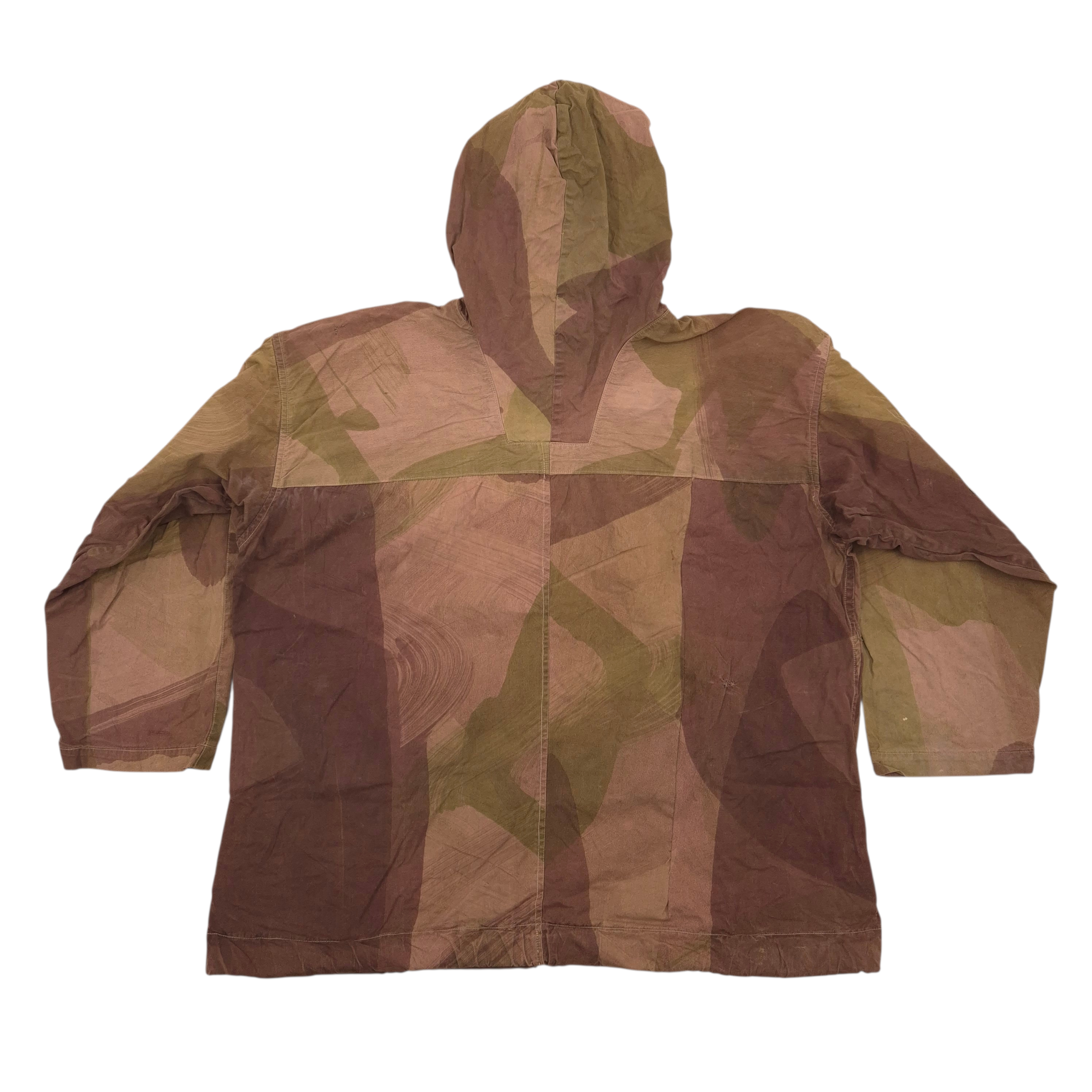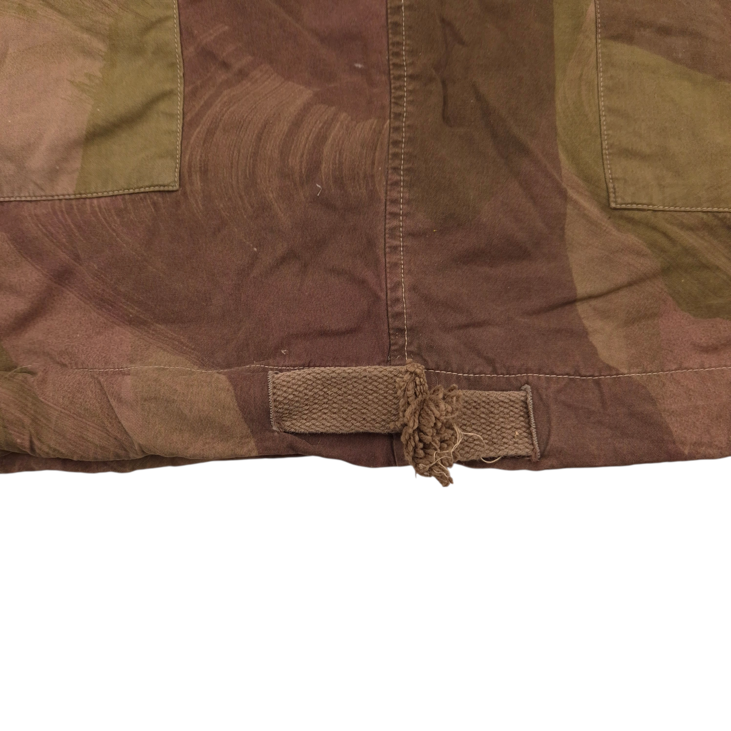 Original WWII British Windproof Camouflaged Smock. The camouflage windproof suits were made from the same lightweight, windproofed cotton material used for the drab tan sets. The camouflage pattern is similar to that of the Denison smock, sharing the same base colours and brushstroke style. This smock is in good, worn condition, showing only some staining and a large repair on the back that is barely visible unless pointed out. The original maker’s label is present: Miller & Co. Ltd., size 5, dated 1944. Draw tapes are present.