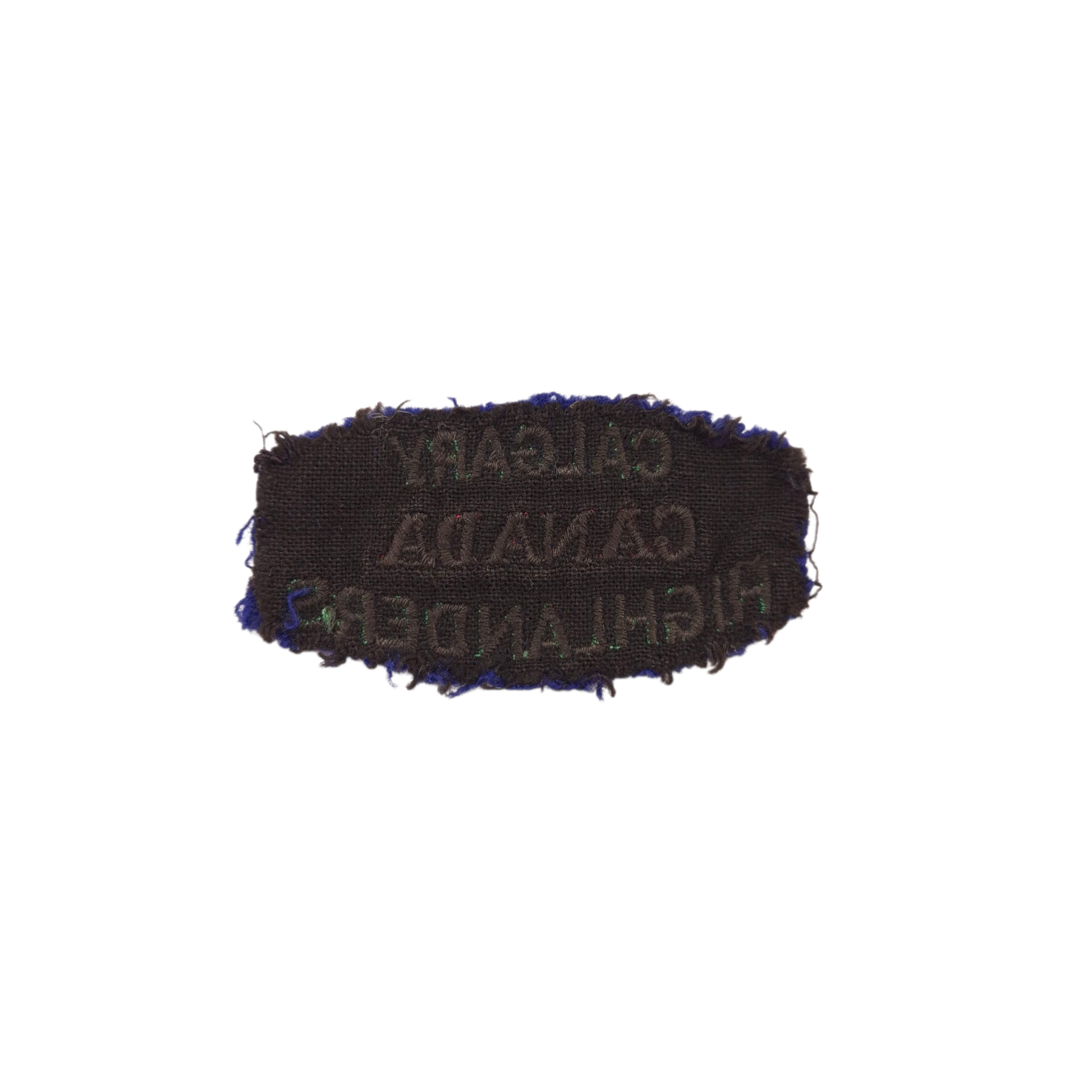 Original WWII Calgary Highlanders of Canada embroidered shoulder title in uniform removed condition. This is a nice wartime Canadian made shoulder title. The Calgary Highlanders of Canada were part of the 2nd Canadian Infantry Division.