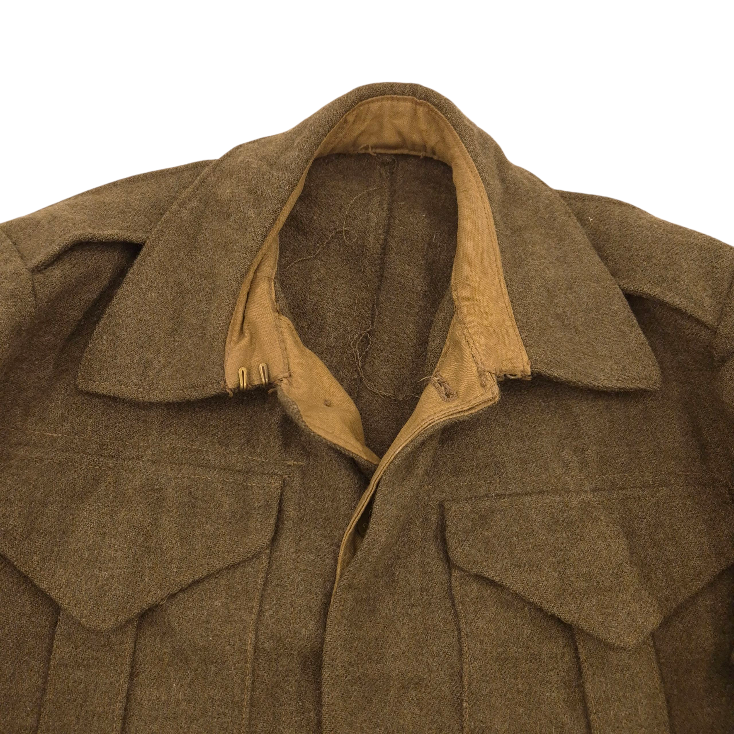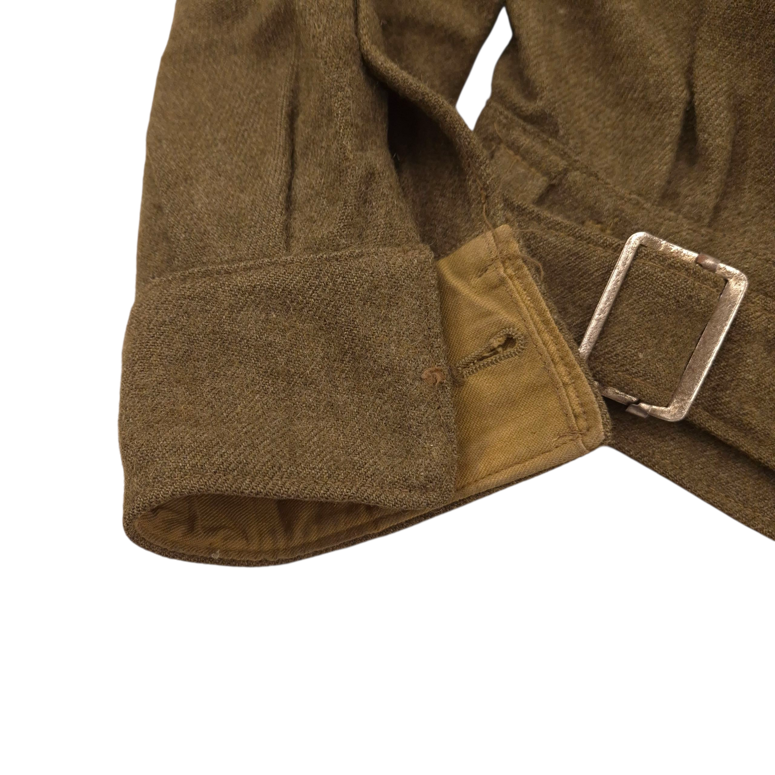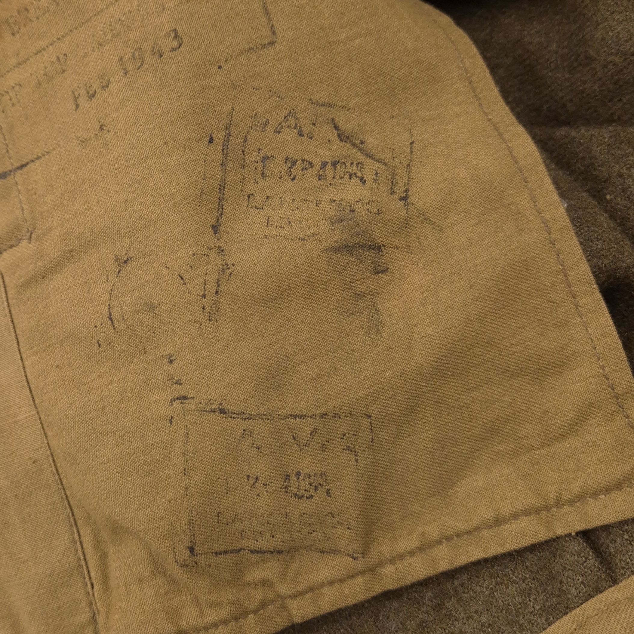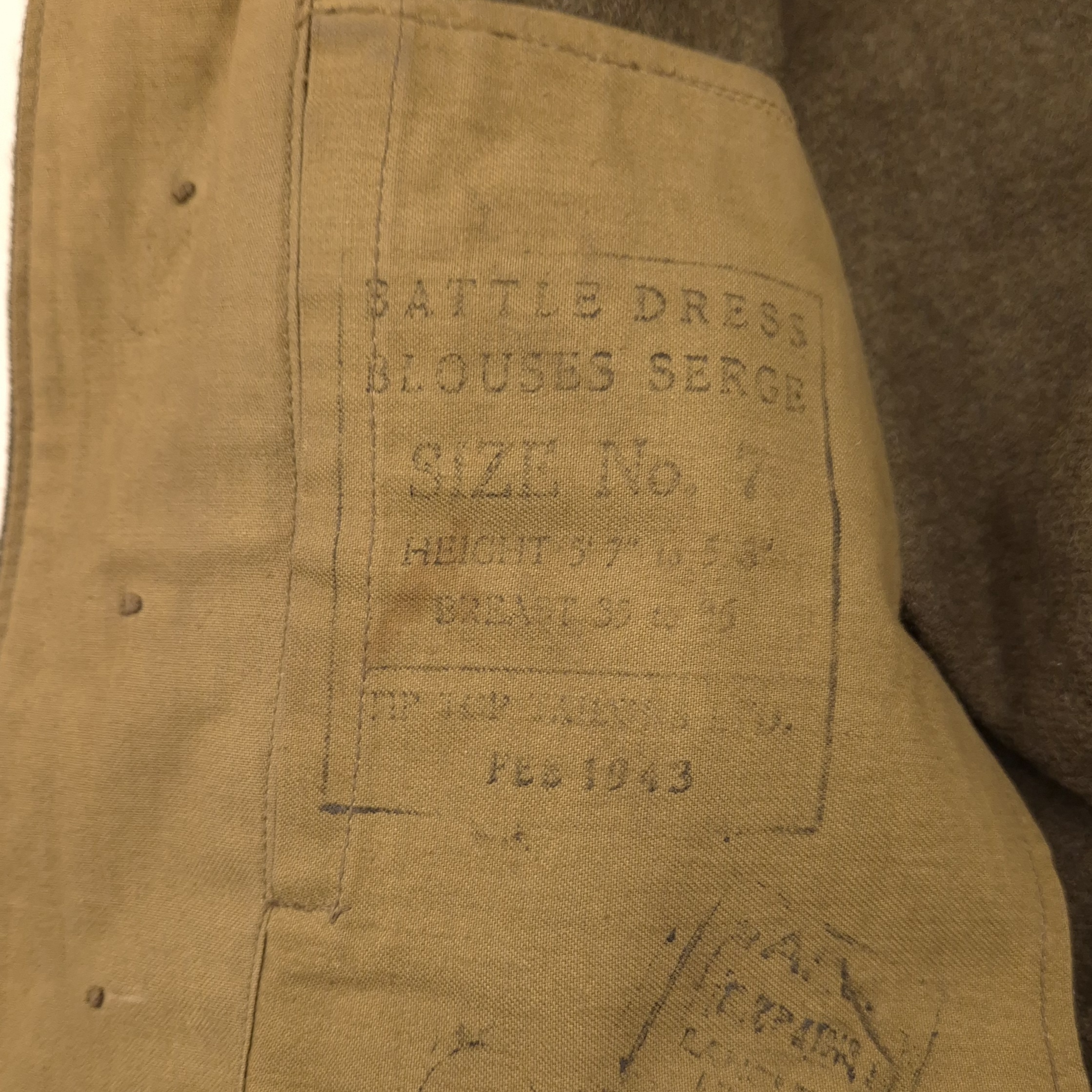 Original WWII Canadian Battle Dress Jacket. The jacket is in good used condition. Manufactured by Tip Top Tailors, dated February 1943 in size 7. The jacket was treated to provide the wearer additional protection if subjected to a gas attack and therefore marked with A.V. (Anti-Vesicant) 1943 dated. The jacket has a British manufactured waist belt buckle, a nice period modification, one sleeve button is missing. A nice jacket!