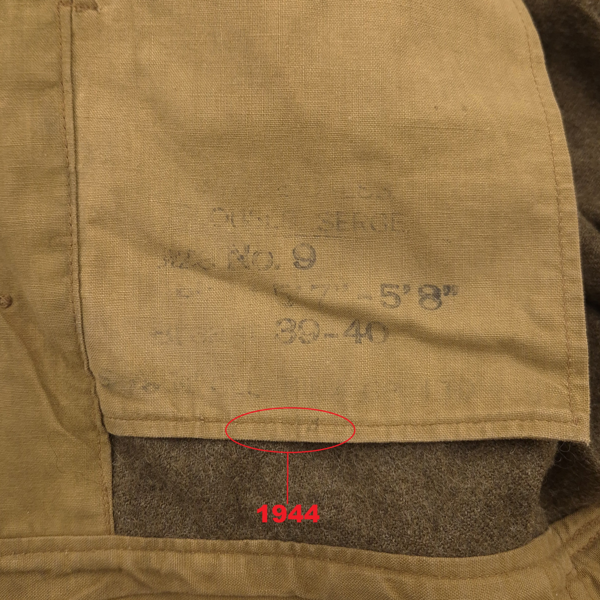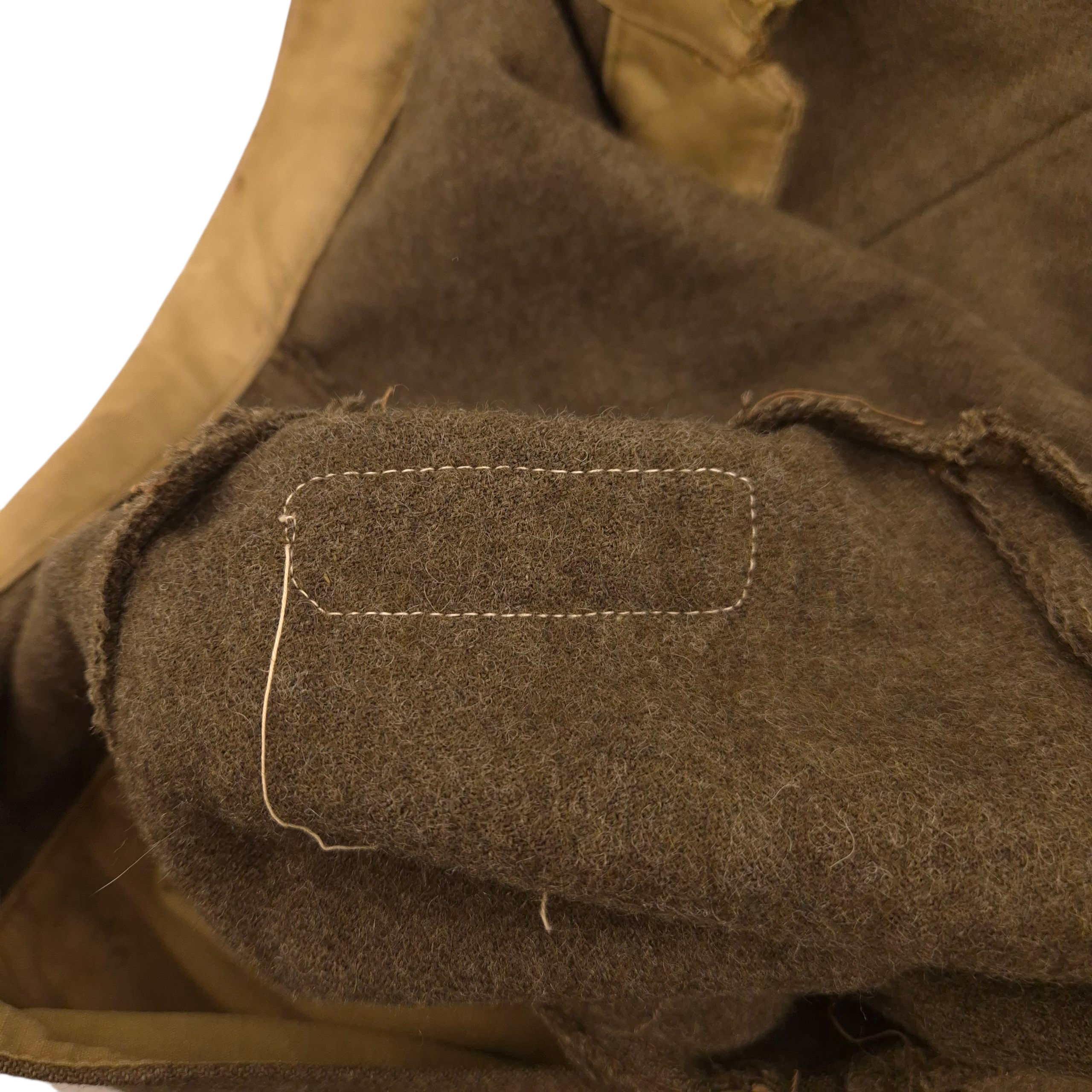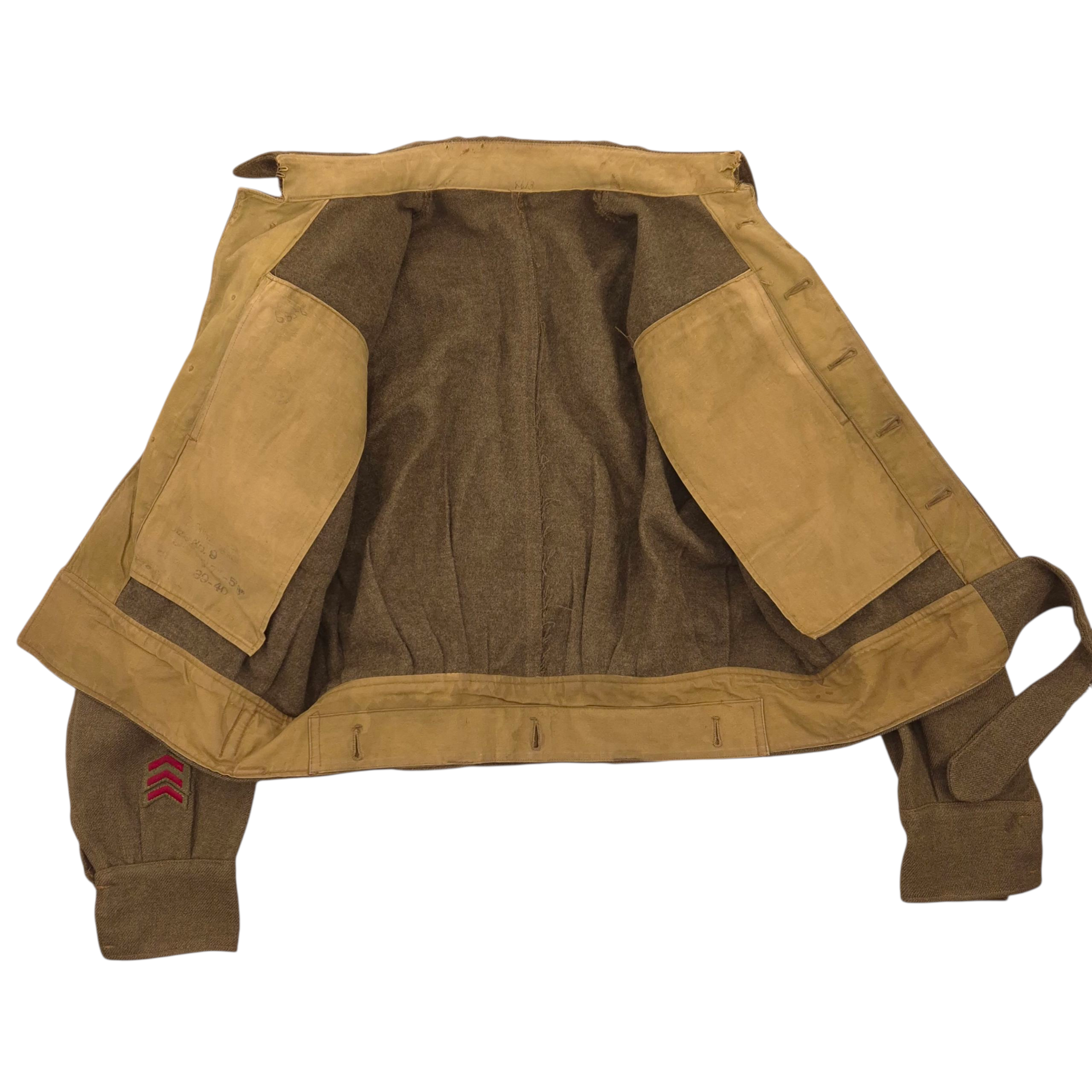 Original WWII Canadian Battle Dress Jacket. Original, period-badged example featuring embroidered “CANADA” shoulder titles, Lance-Corporal chevrons, and service year chevrons. The maker’s markings are faded, but the date appears to be 1944. Size 9. Good used condition overall; one breast pocket button is loose but present.