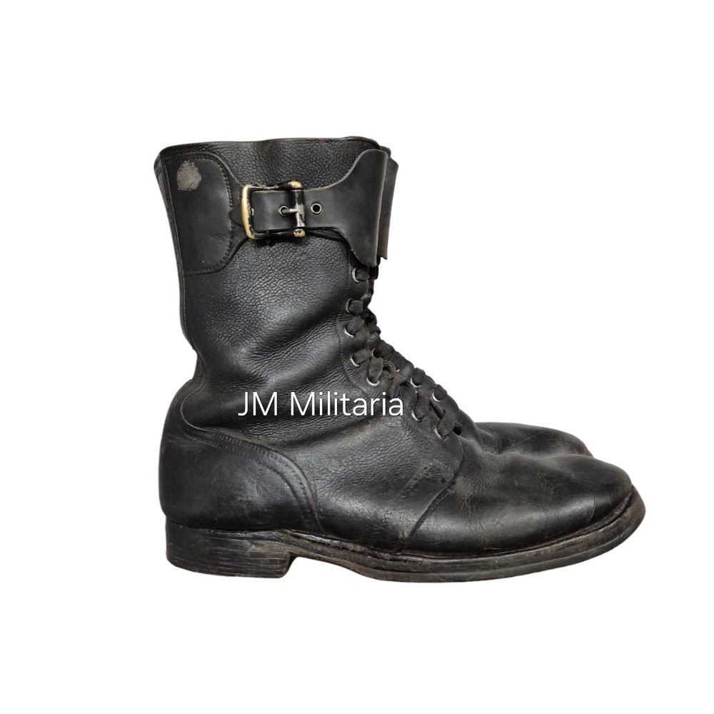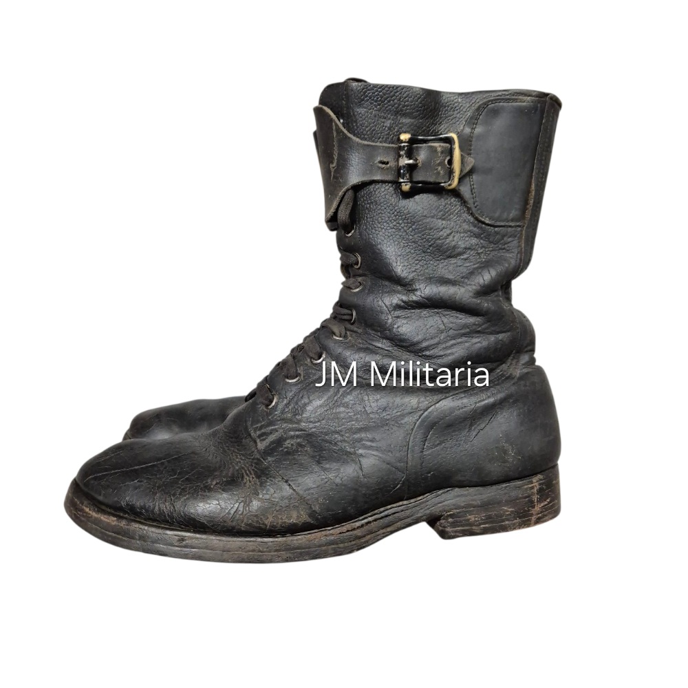 The boots are in field-worn condition, showing clear signs of use. There is a field repair on the back side. The soles shows some damage, and the middle part of the soles is slightly loose (this can be repaired if the buyer wishes). No hobnails or horseshoes are present. The leather remains supple and the boots still have their original laces. The two closing straps were period-shortened, most likely because the last hole was not in use. The lower stitching is loose (see photos for details). The boots are marked inside, size 8. The boots are dated 1943. A nice pair in used condition.
