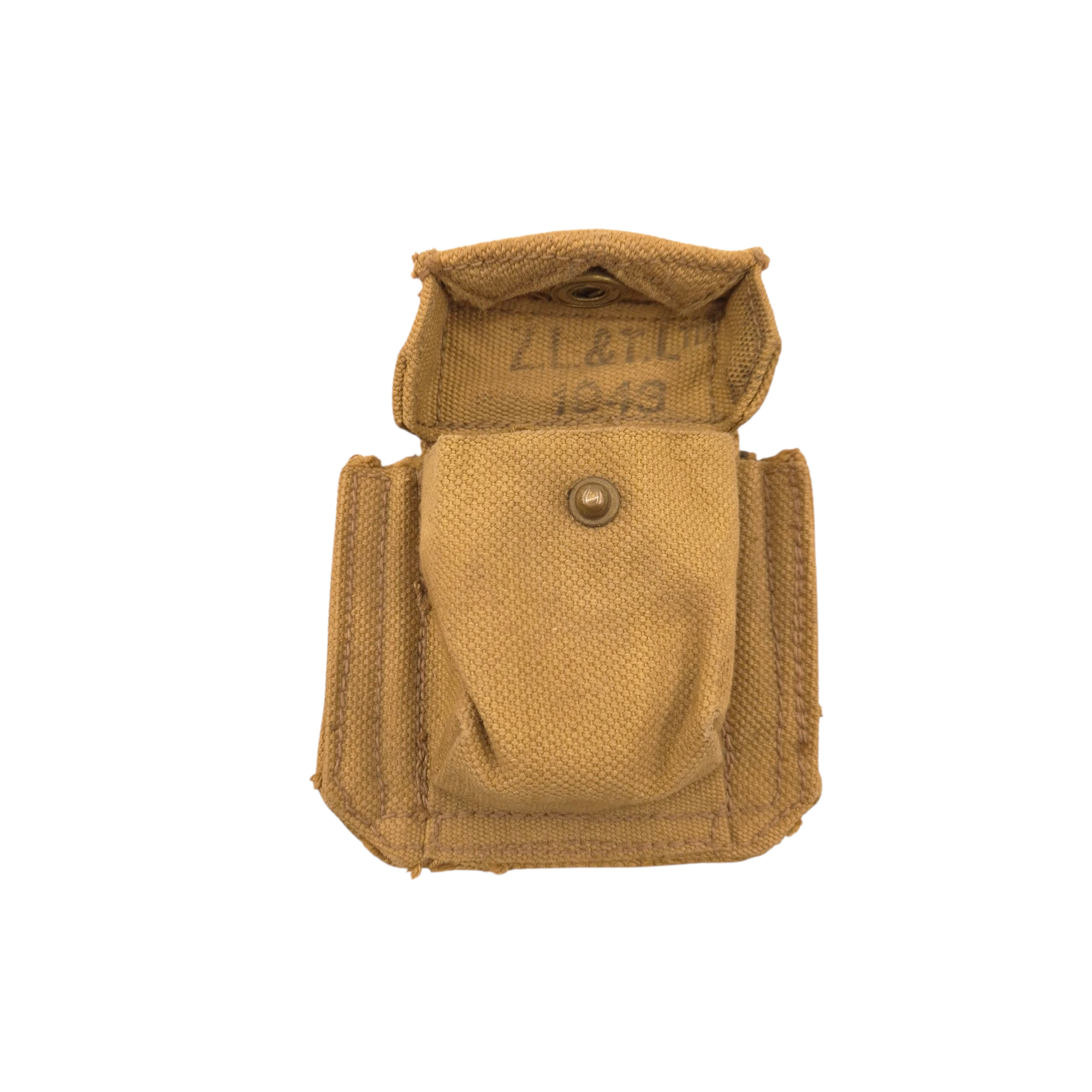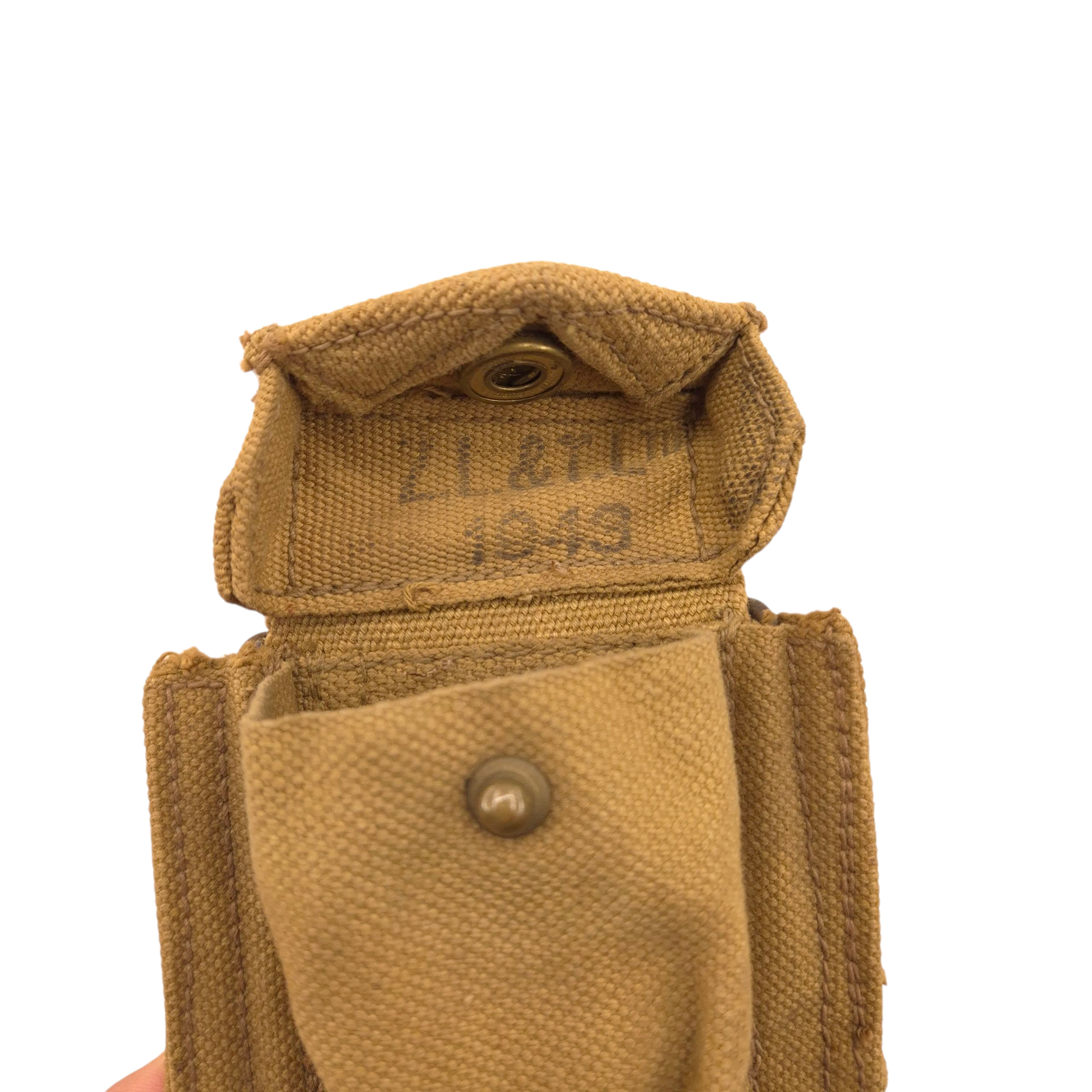 Original WWII Canadian P37 ammunition pouch intended for pistol and revolver ammunition. Maker marked ZL&T Ltd, dated 1943 and C broad arrow stamped.