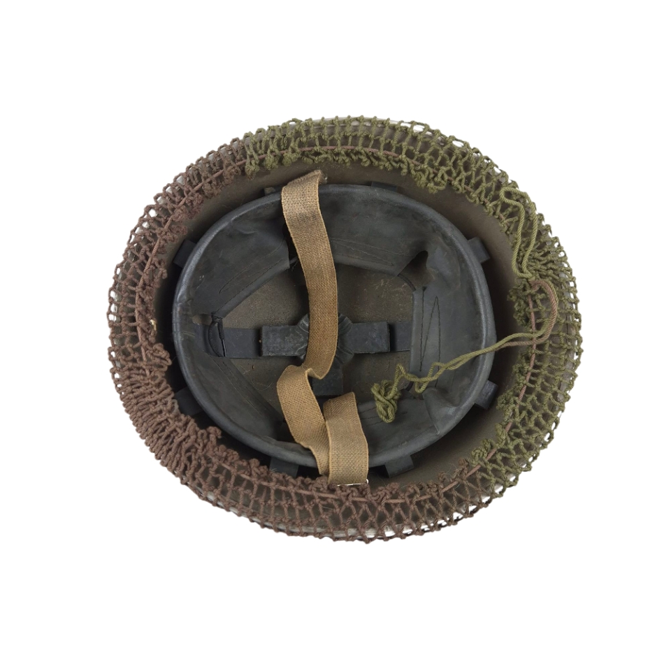 Original WWII Canadian two-tone camouflage net for helmet. The brown green camouflage net is in good condition, complete with string, fits an MkII and MkIII helmet.