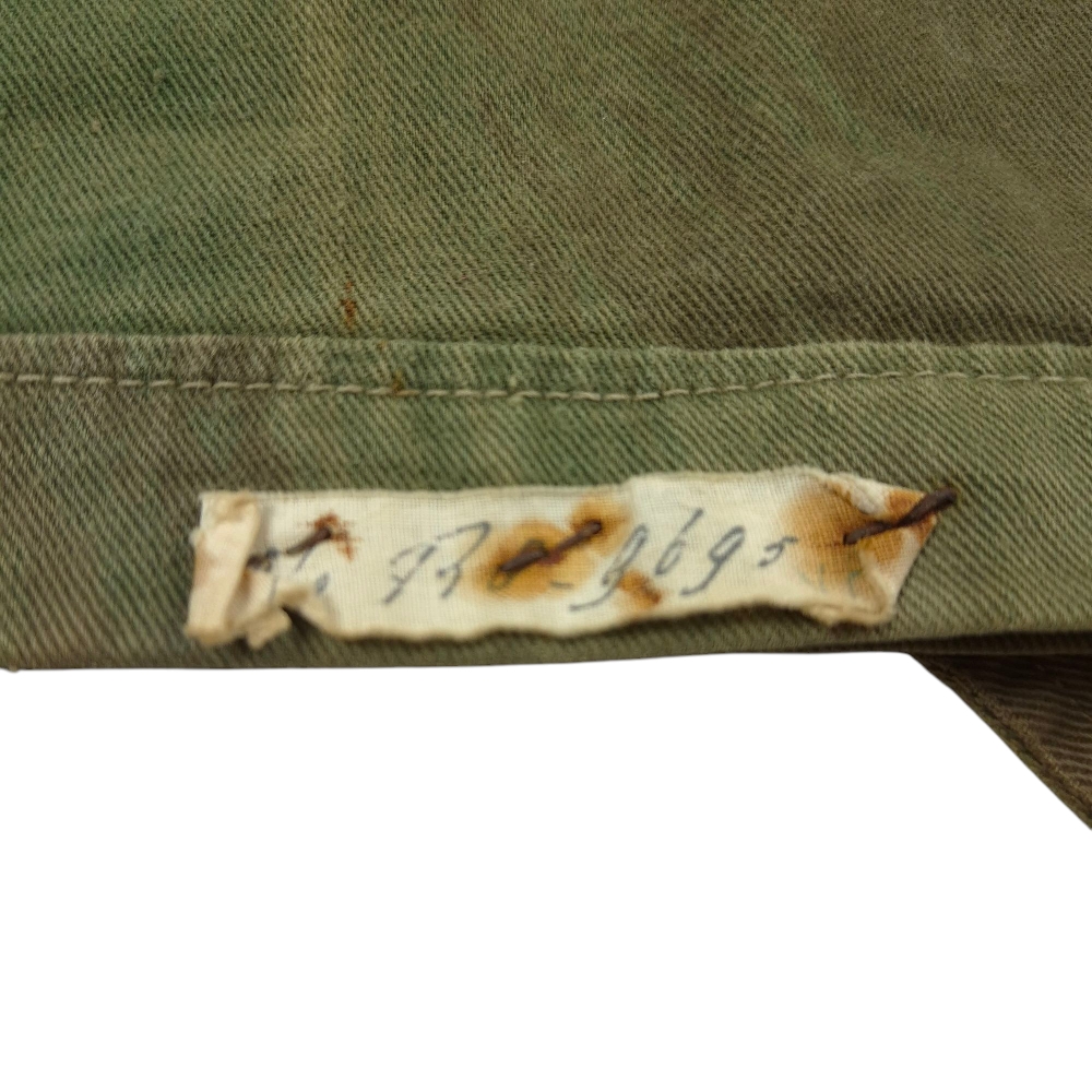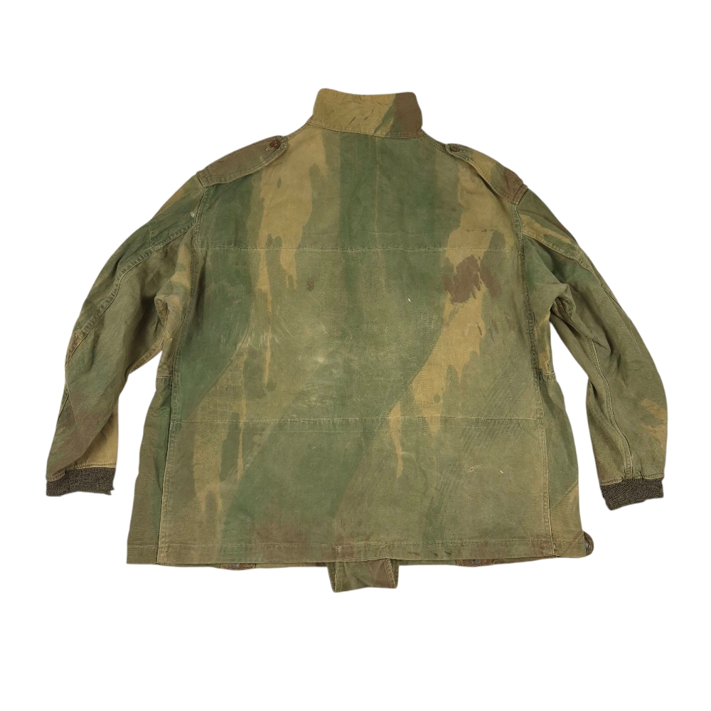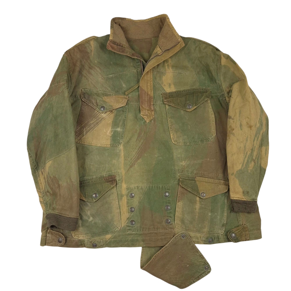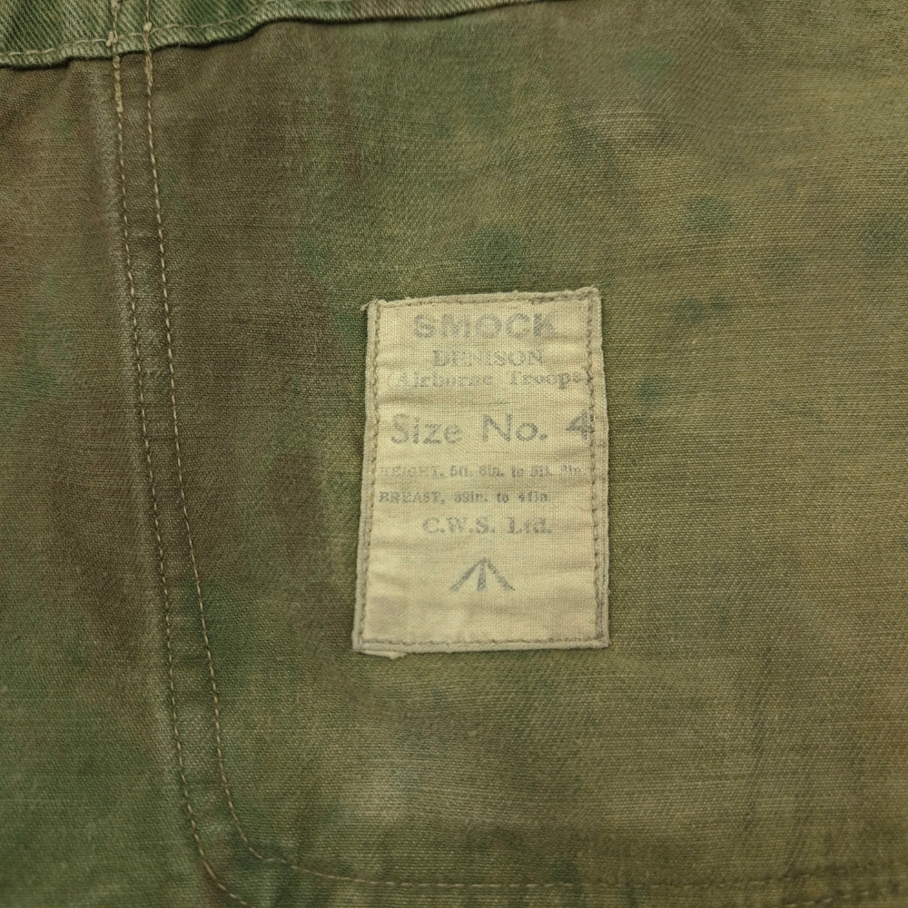 Original WWII British ‘Airborne Troops’ 1st pattern Denison Smock. This 1st Pattern Denison Smock, dated 1942, is in good used condition with expected signs of wear. It features hand-painted camouflage, complemented by printed camouflage fabric on the pocket flaps and inside pockets, making it a particularly interesting example. The smock retains its readable maker’s label: C.W.S. Ltd. Marked as size 4, which is considered one of the most desirable sizes for a Denison smock. The half-zip is fully functional and marked “N”. The knitted cuffs are nice, show some small damages. The tail is still present. All brass press-studs are marked NEWEY. The brass parts exhibit some signs of erosion, consistent with age and use.