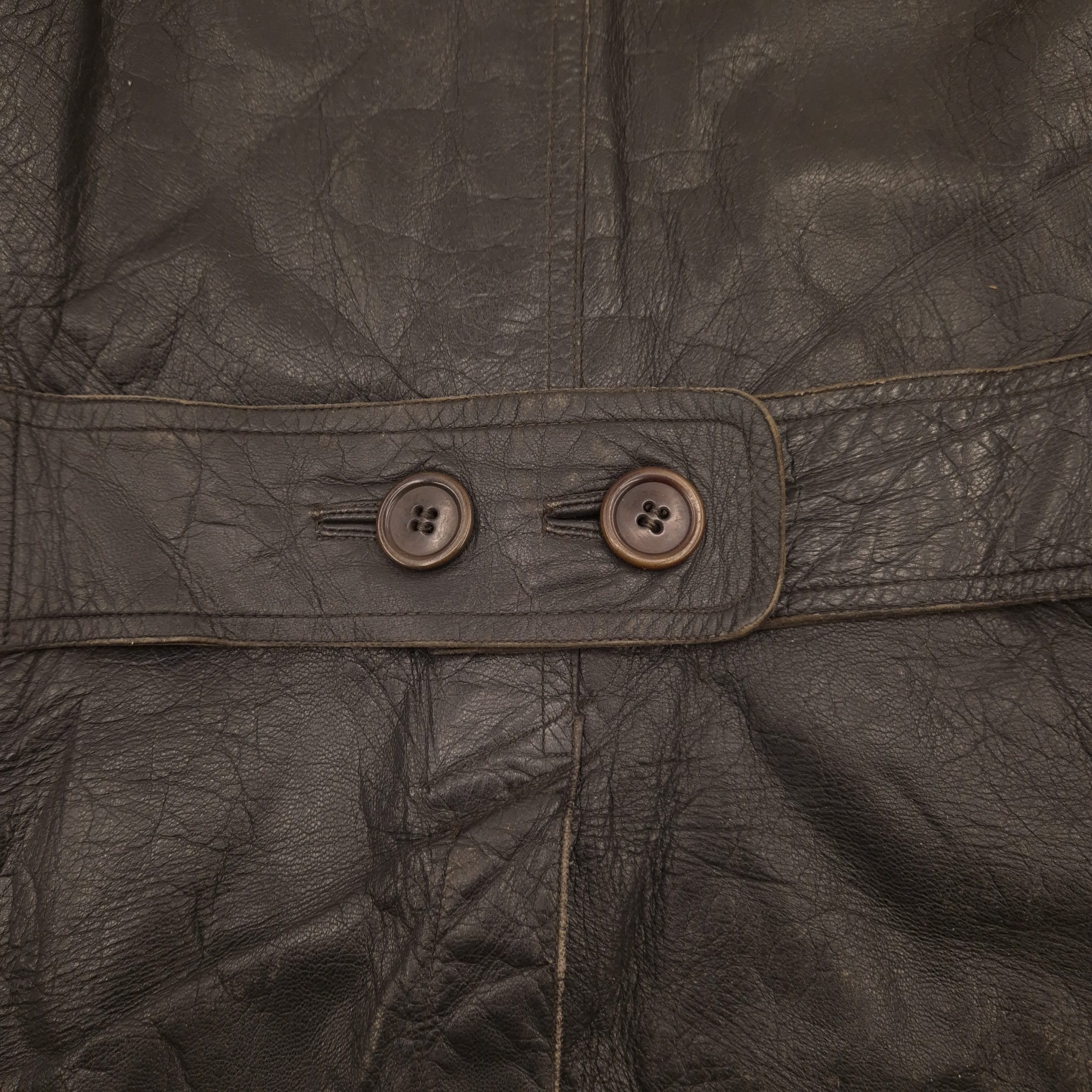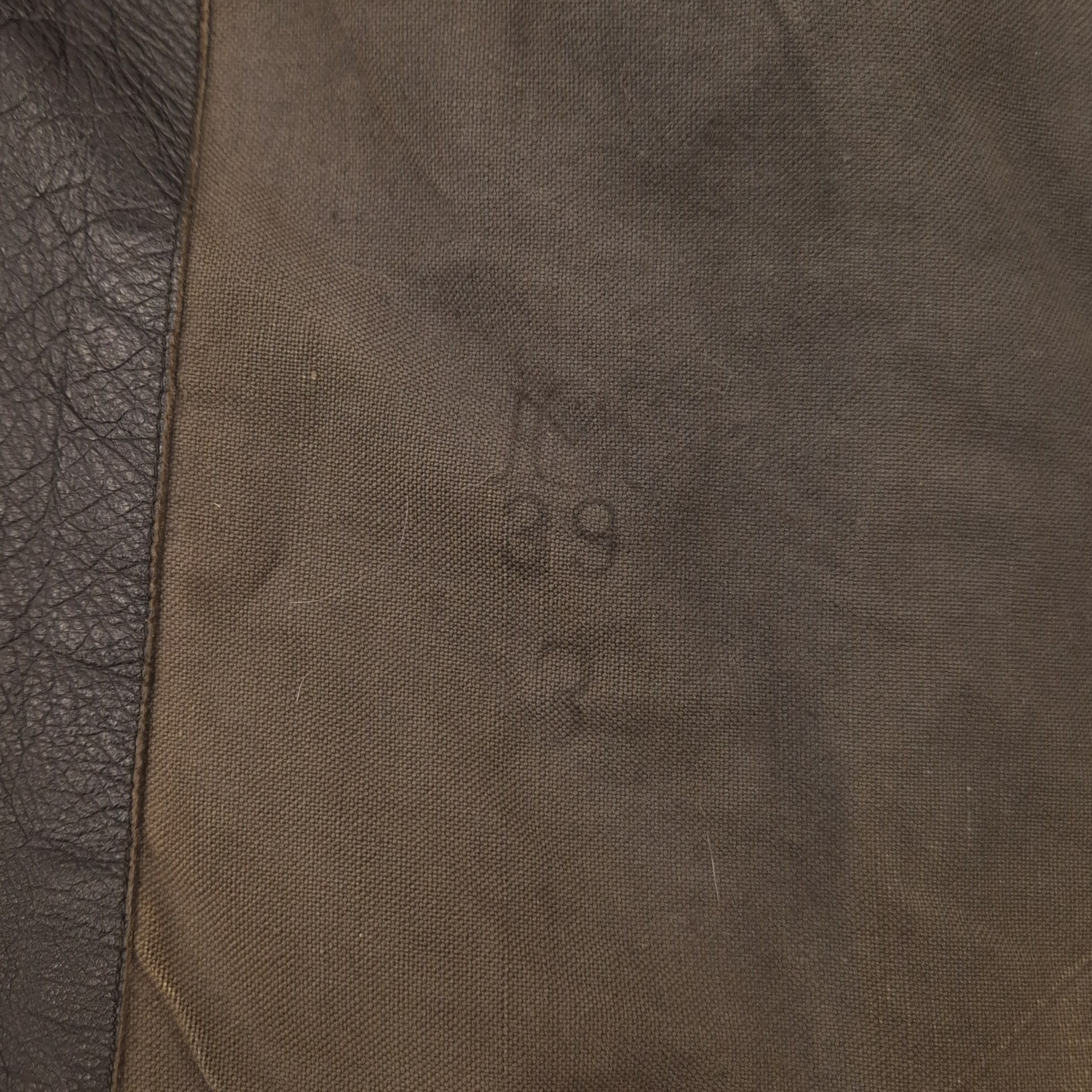 Original Pre-1940 Dutch Motorcyclist’s Leather Jacket. Protective leather jackets, trousers, and helmets were classified as special clothing and issued to Dutch motorcyclist personnel. This jacket is made from high-quality, supple, blackened leather. It is clearly marked “CM” (Centraal Magazijn) and dated 1939. All original press studs for the wool lining are still present; the lining itself is missing. The jacket is in good, used condition with normal signs of wear consistent with age. The leather remains very supple. One button is loose but included with the jacket.