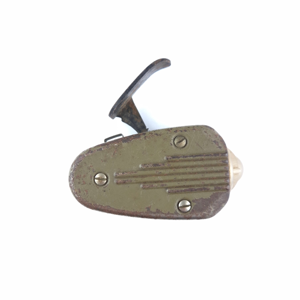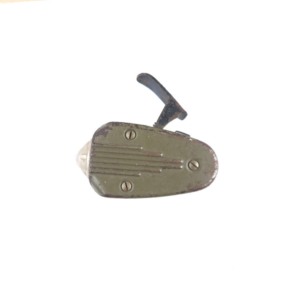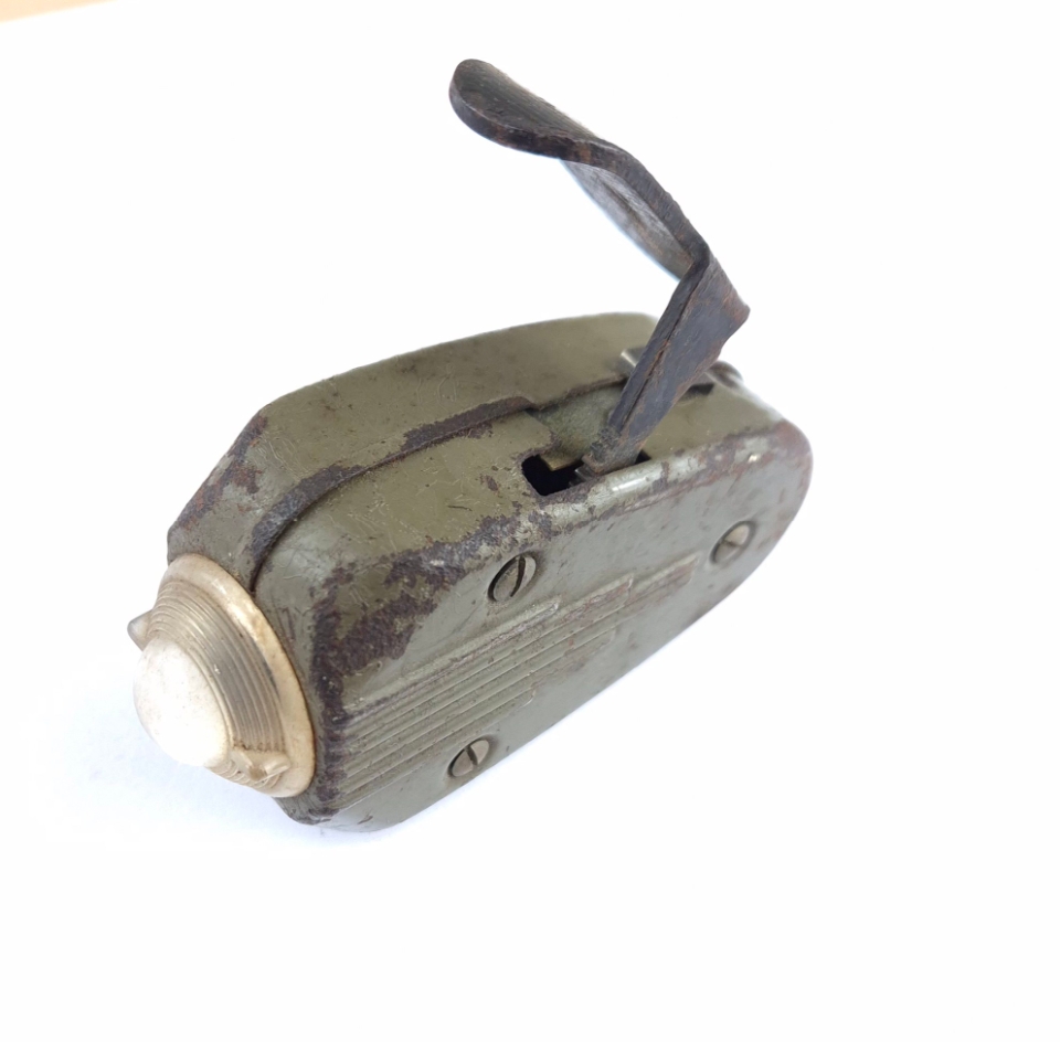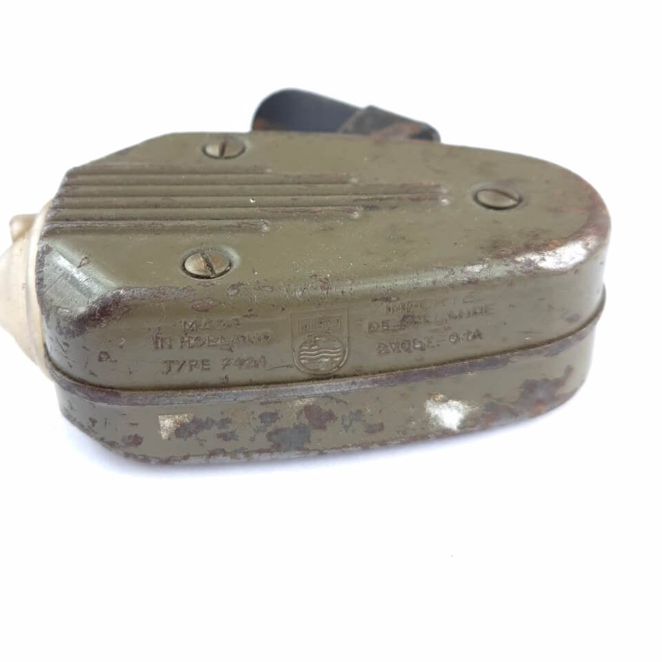 WWII Dutch ‘Knijpkat’ Flashlight. The ‘Knijpkat’ was a flashlight without batteries, the required electricity is generated by means of a built-in generator which is driven by pinching the handle on top. The fieldgrey coloured flashlight is nicely maker marked by the ‘Philips’ company. Flashlight in good only slightly used and still functional condition.