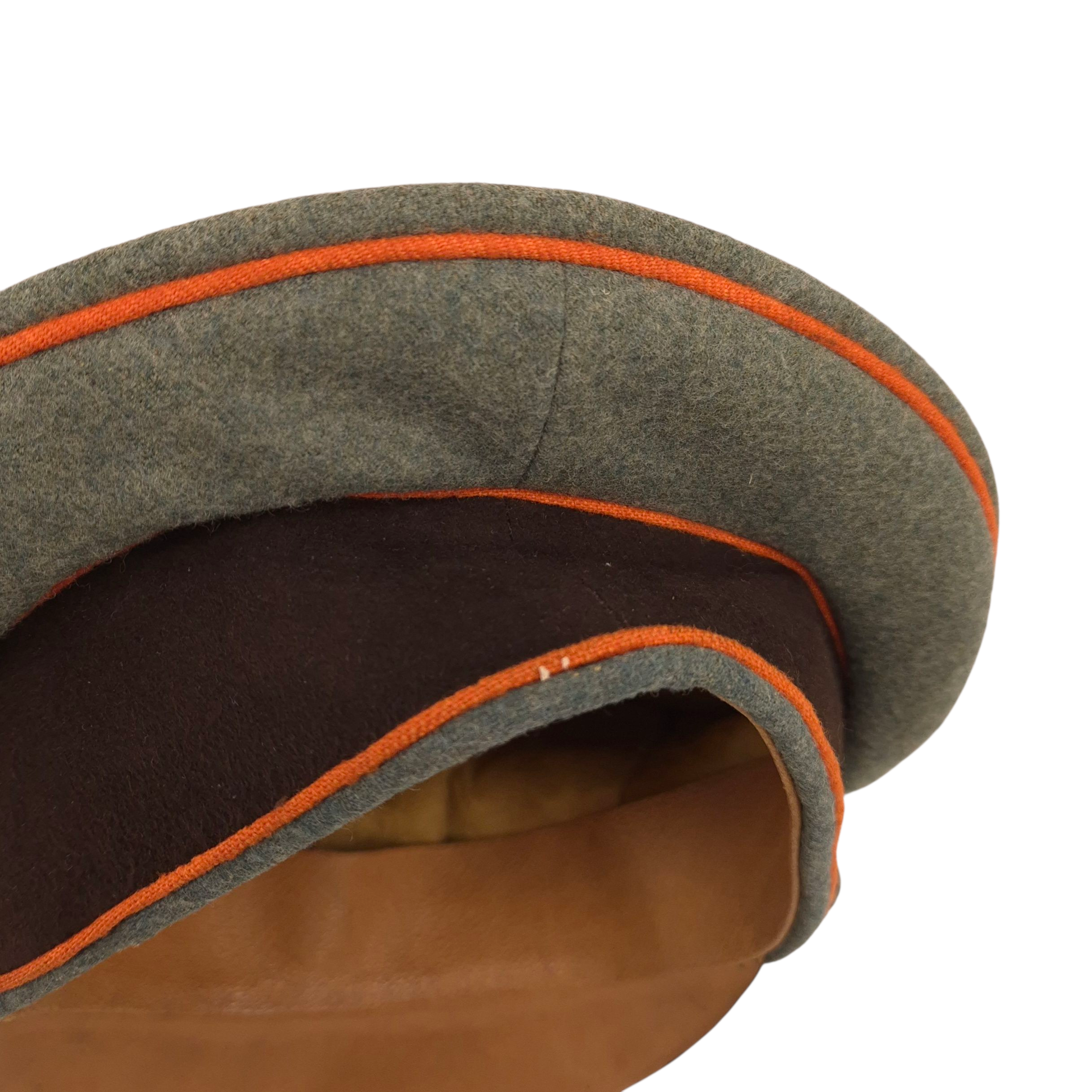 Original WWII WH ‘Heer’ Feldgendarmerie officer’s visor cap, featuring the correct orange piping for Feldgendarmerie units. The cap retains its Wehrmacht eagle insignia and aluminum national cockade. The silver twisted bullion chin cord is secured by silver pebbled buttons and sits above the black lacquered leather peak. The interior is clean and well-preserved, with no visible damage. Size 58 stamped. Overall, the visor cap is in excellent condition, hard to upgrade.