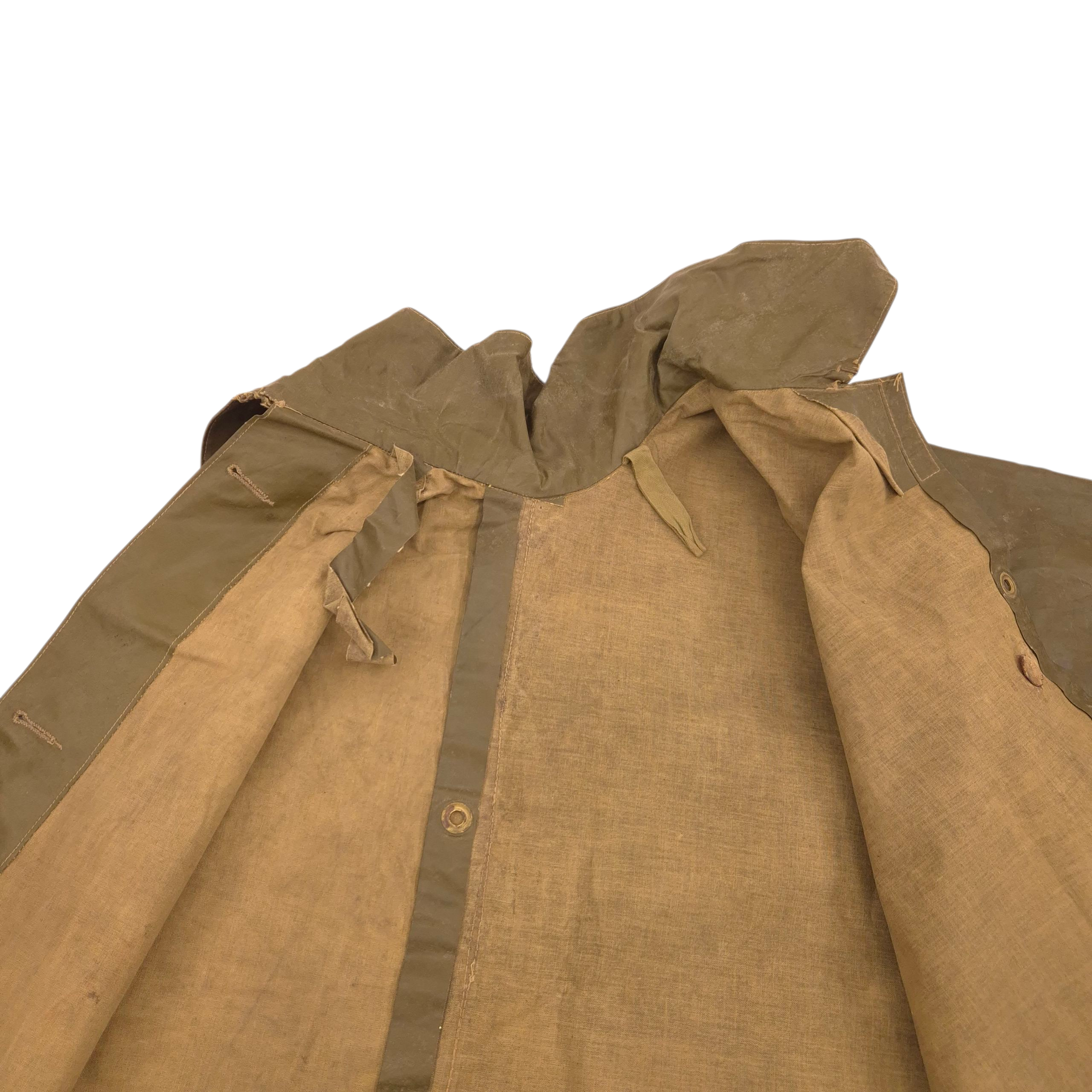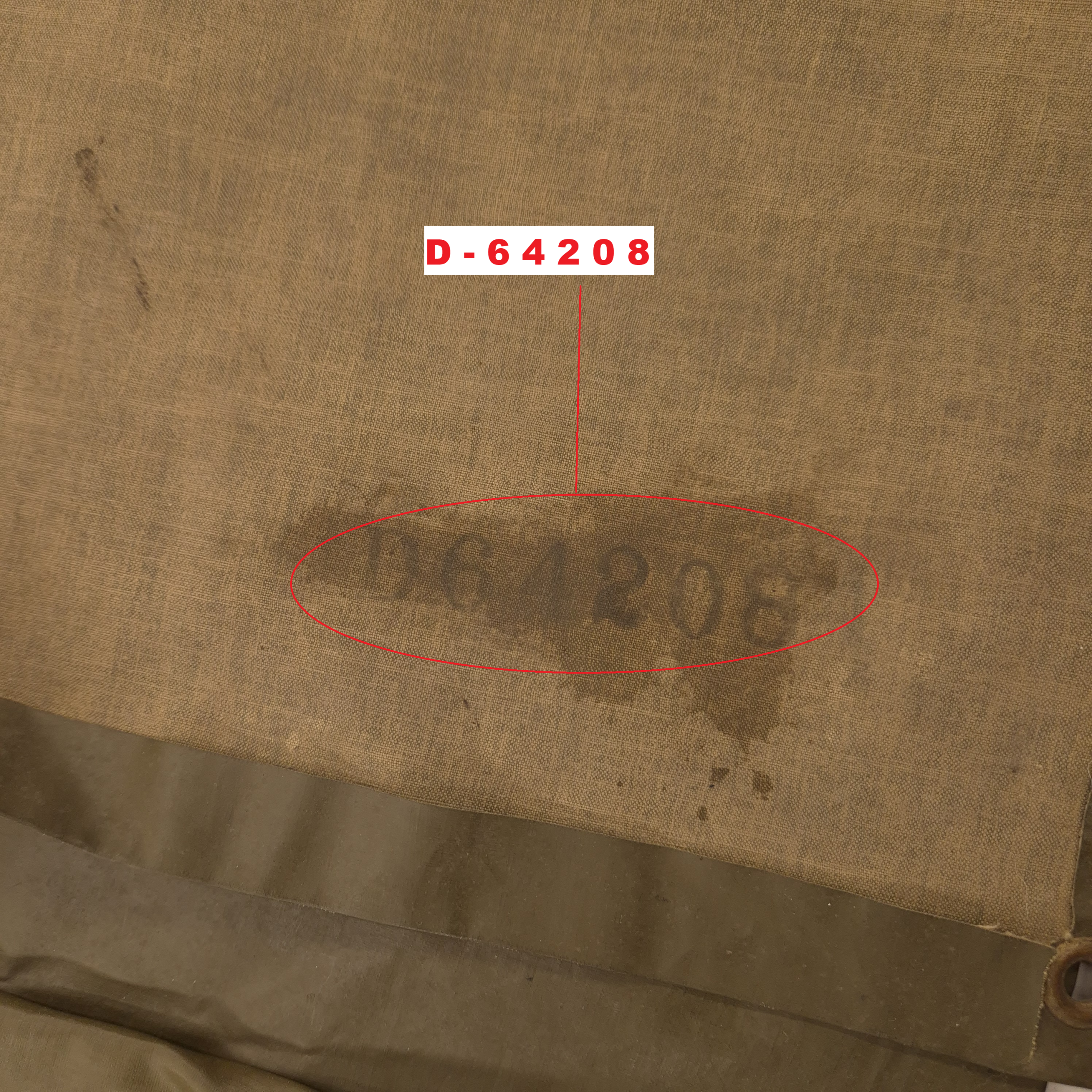 Original WWII Canadian raincape/poncho, bearing the service number D-64208, attributed to a member of the Fusiliers de Mont-Royal. This example represents the rare green-coloured pattern, seldom encountered today. Constructed from heavy canvas with a rubberized waterproof coating on the exterior, the piece remains remarkably supple and well-preserved, showing normal traces of field use, one damage and a missing button. Clearly maker-marked “B.F.G.” and dated 1942, it also bears the Canadian Broad Arrow acceptance mark. No research has been conducted into the original owner, leaving an appealing opportunity for further historical investigation into this Fusiliers de Mont-Royal soldier. The poncho was basic equipment for every soldier, the cape was stored in the small-pack.