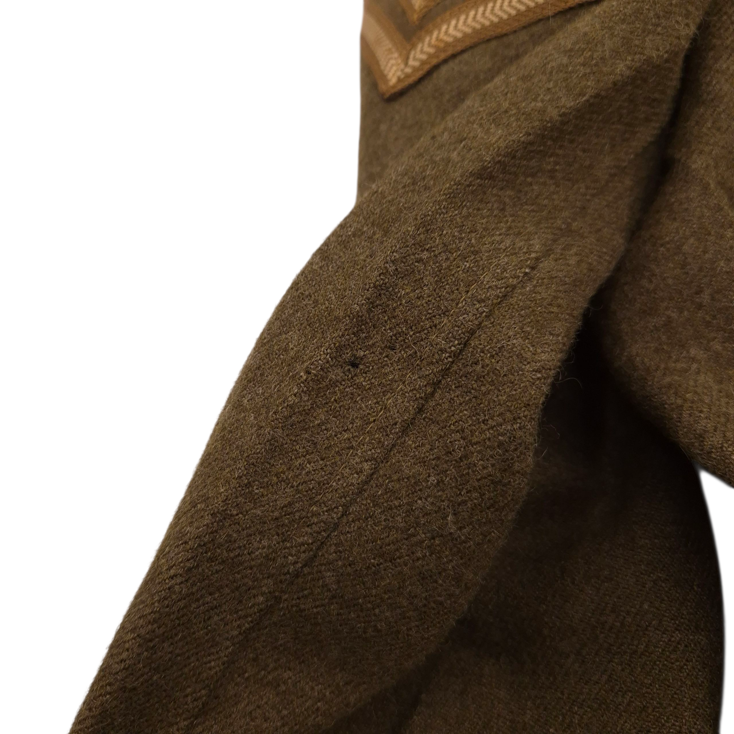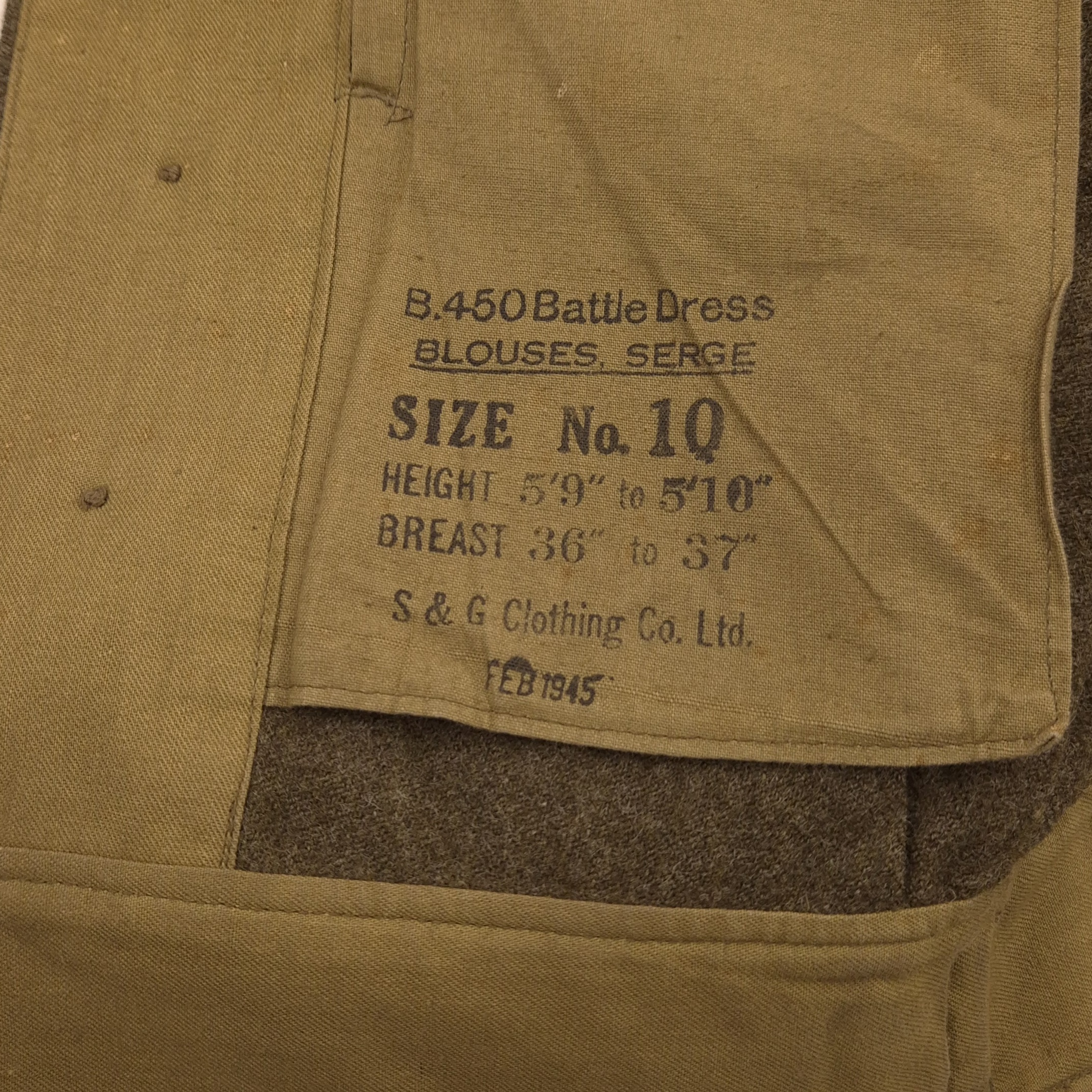 Original WWII Highland Light Infantry of Canada (HLI of C) Battle Dress Jacket. Original, period-badged example featuring embroidered “Highland Light Infantry of Canada” shoulder titles, melton 3rd Canadian Infantry Division formation patches, Sergeant rank chevrons, service year chevrons, and a ribbon bar. The jacket shows some period tailoring, the back panel has been modified for a more desirable straight cut, and the collar has been opened up for a more stylish appearance. Good used condition overall, showing only a few small moth holes. Manufactured by S&G Clothing Co. Ltd., dated February 1945, size 10.