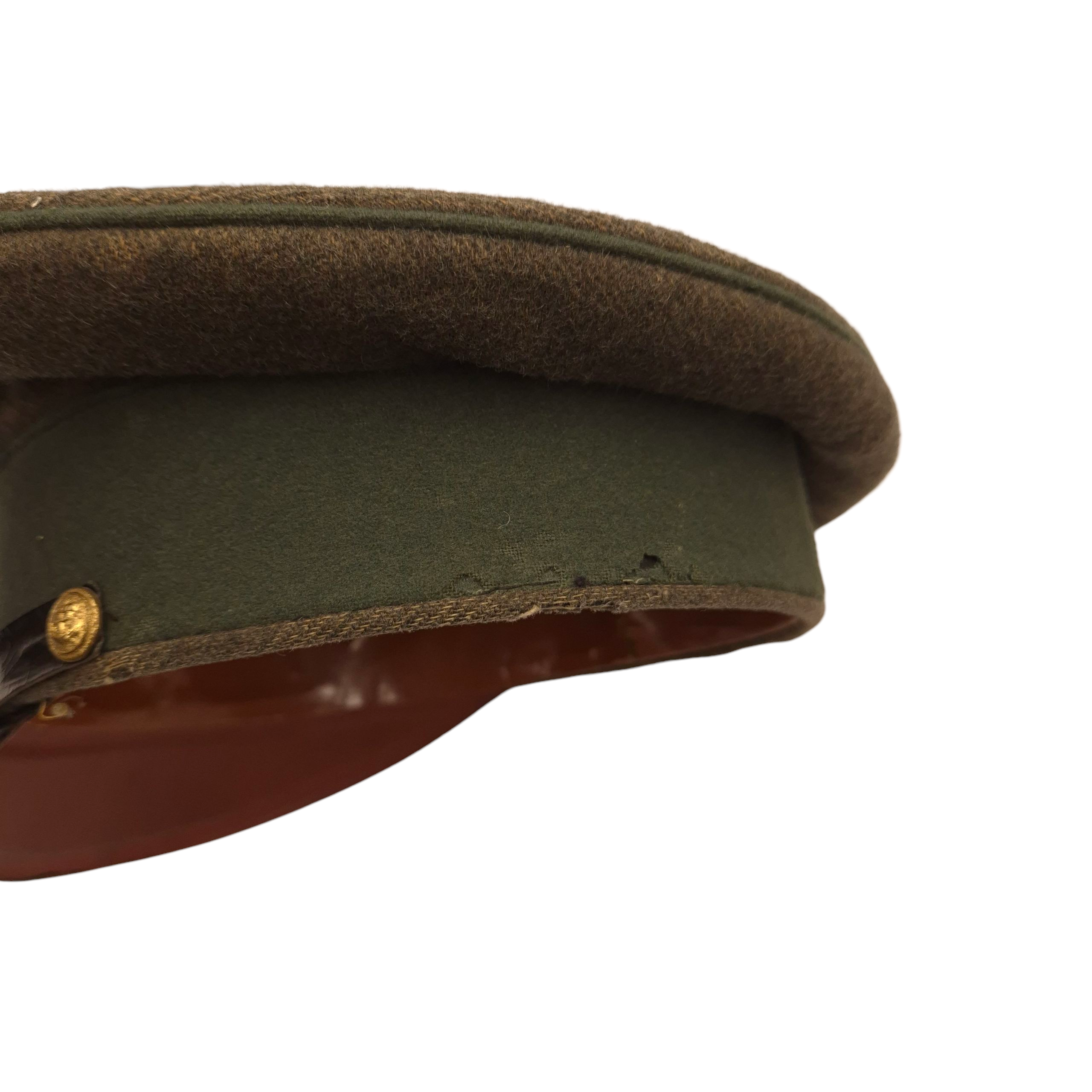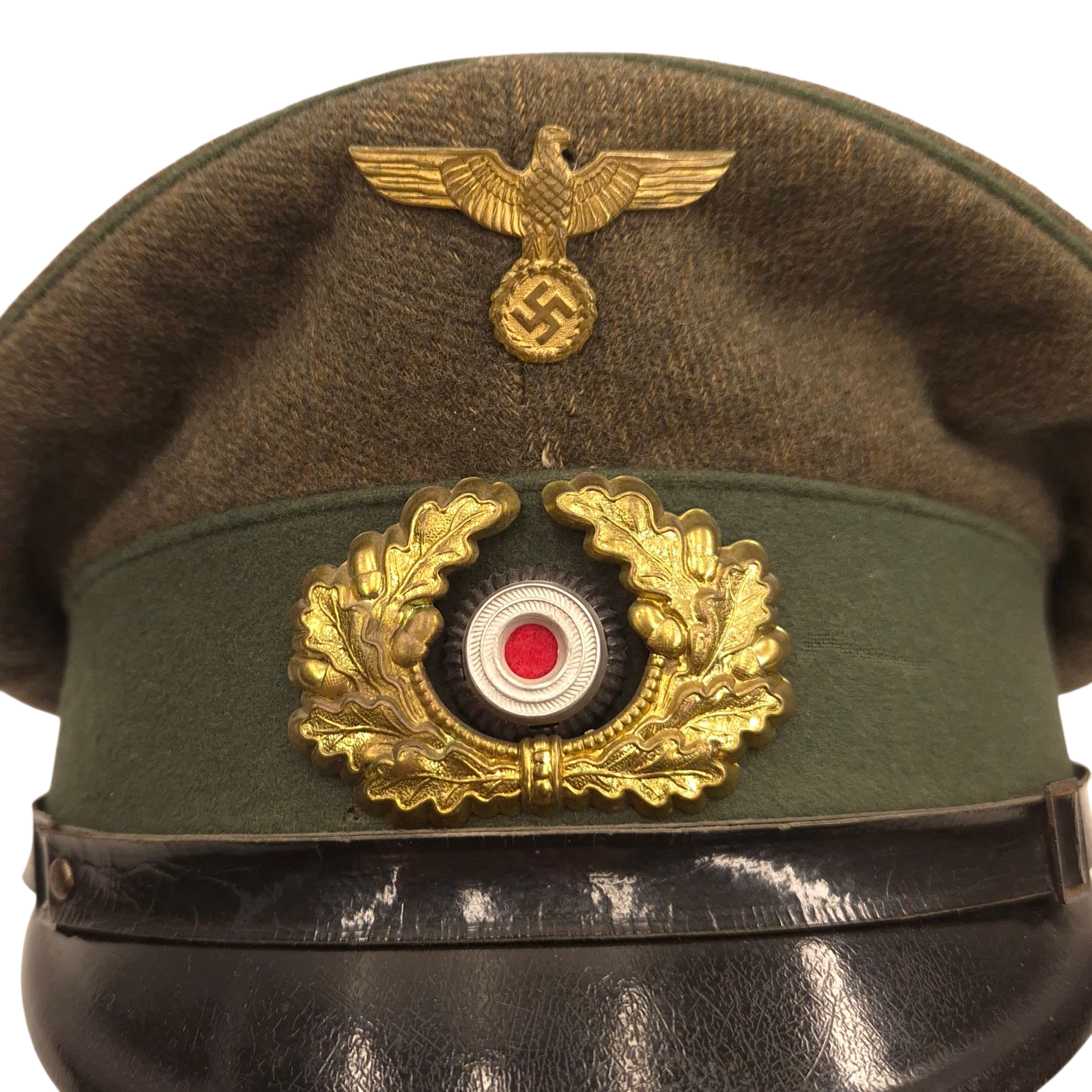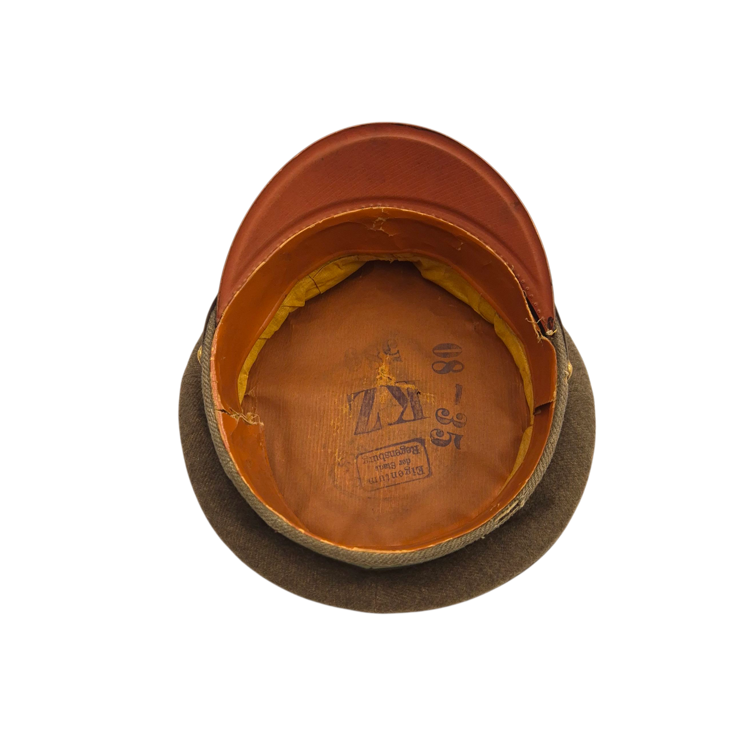 Original WWII Kriegsmarine Coastal Artillery ‘Küsten-Artillerie’ Visor Cap. This pre-war example is complete with original insignia and leather band buttons in place. The interior shows use; the sweatband has some loose stitching and small areas of damage. The wool exterior also shows minor mothing and wear consistent with age.