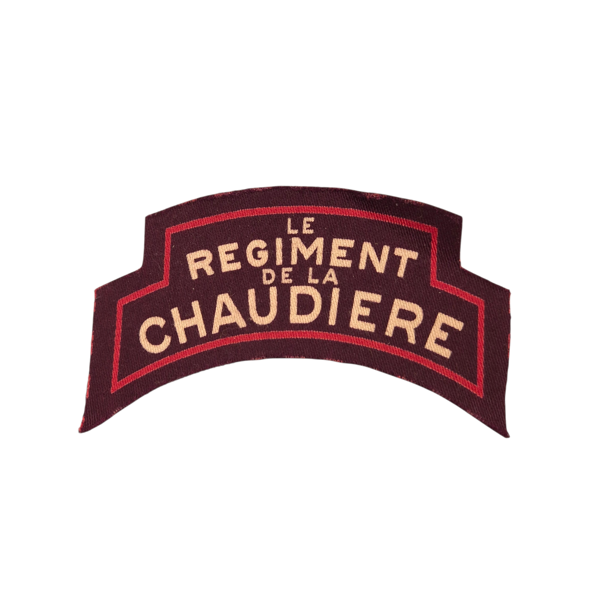 Original WWII Le Regiment de la Chaudiere shoulder title. English-made printed shoulder title for Canadian troops serving overseas. The title is in very good condition.