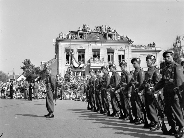 Pircture information: 9 July 1945. Photo of Guard of Honour from the Lornes drawn up in front of the Hotel de Wereld, Wageningen,