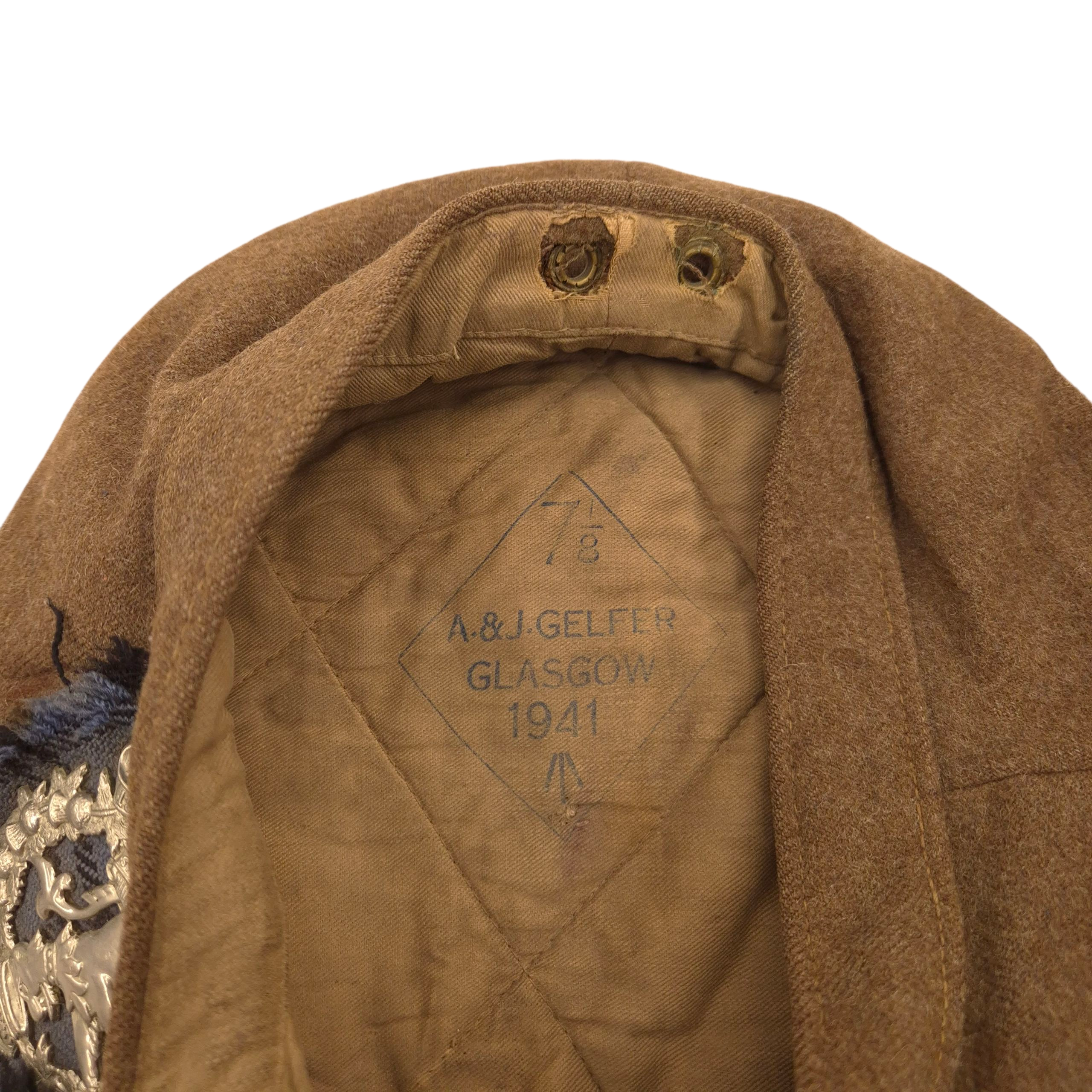 The Tam O’Shanter is English-made by A & J Gelfer of Glasgow, dated 1941, size 7 1/8. It retains its original tartan and original cap badge, though the toorie is no longer present.