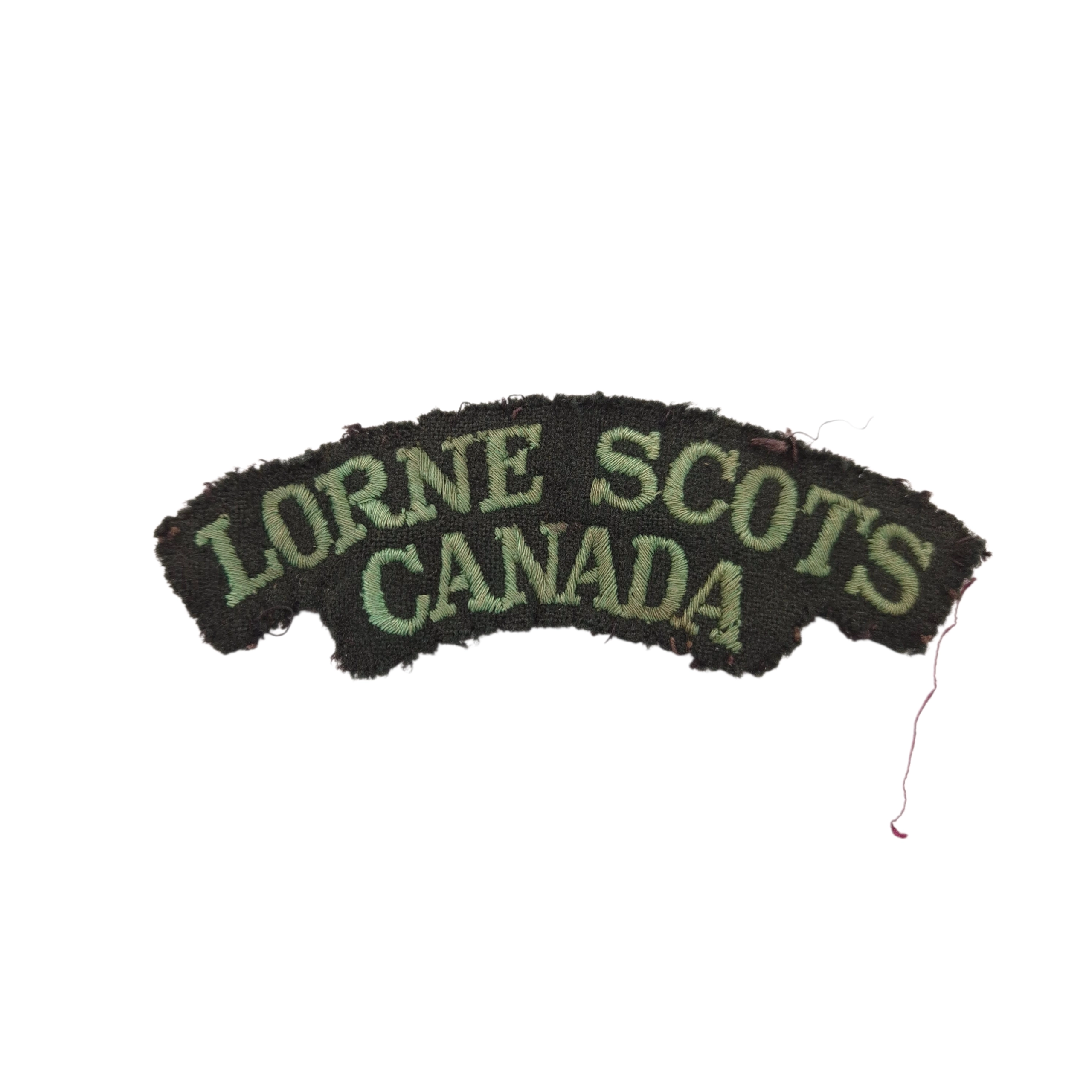 Original WWII Lorne Scots embroidered shoulder title in uniform removed condition. This is a nice English-made shoulder title for Canadian troops overseas.