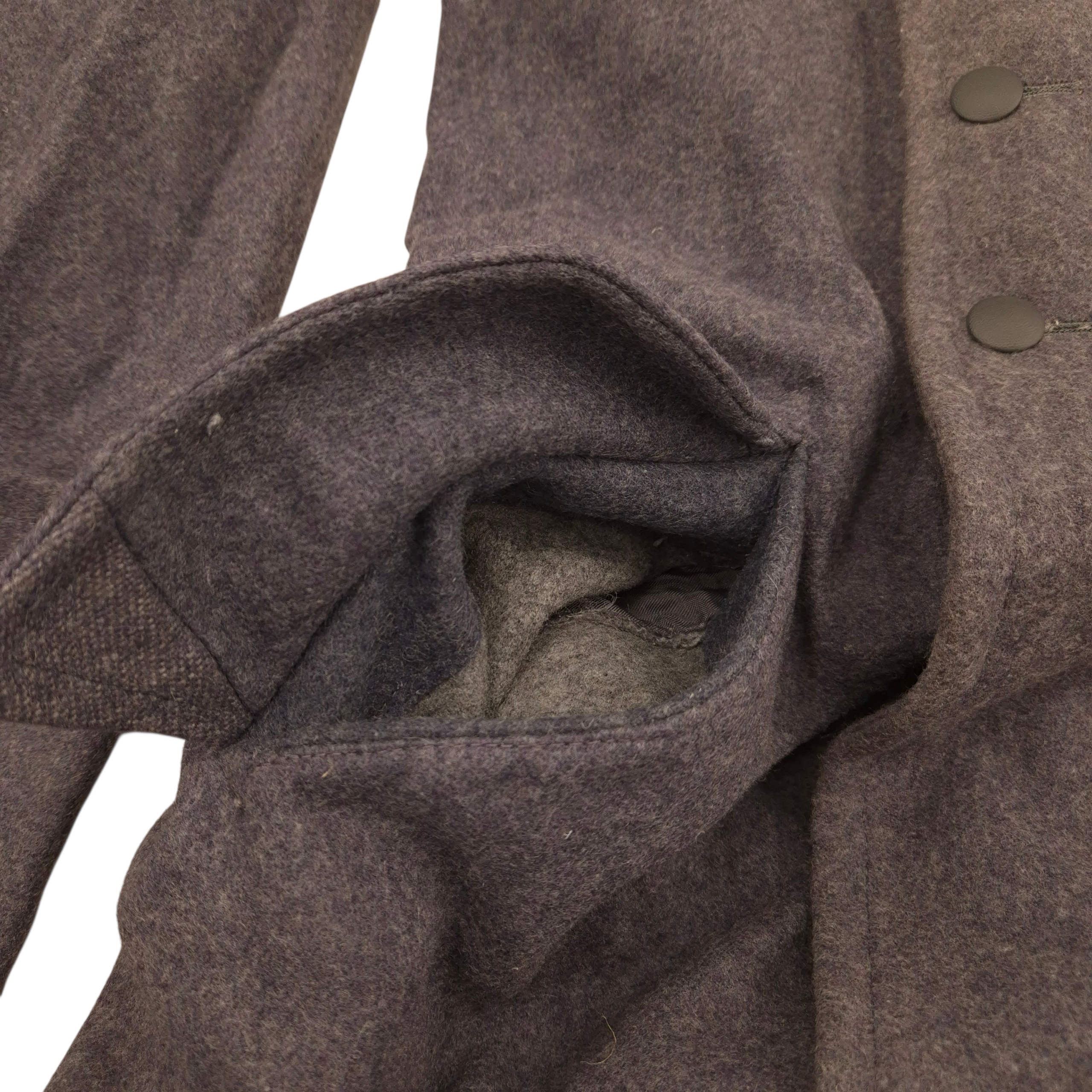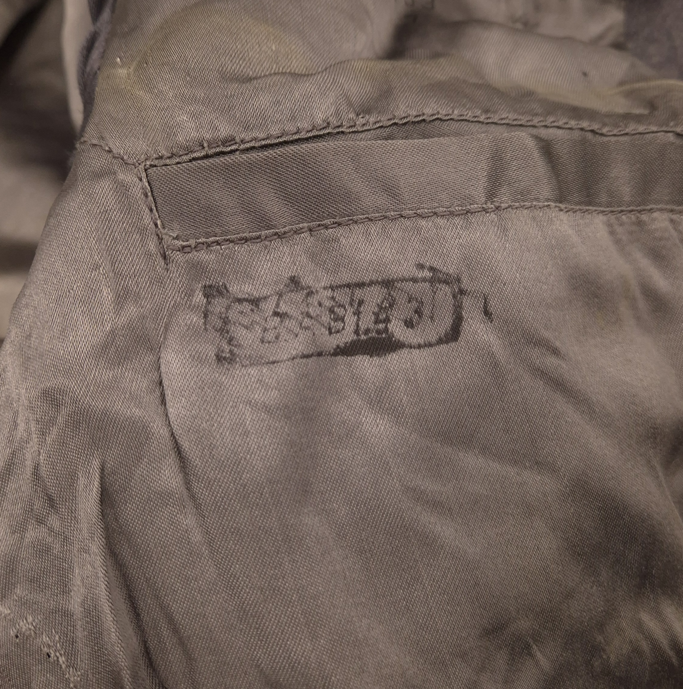 Original WWII Luftwaffe EM’s Greatcoat with detachable hood. Constructed of Luftwaffe grey wool, this greatcoat features a double-breasted front with two rows of six closure buttons, along with a single metal hook-and-eye at the neckline. The coat is made of heavy-quality material and is partially lined with grey rayon. The greatcoat is clearly size-marked with a chest size of 104 cm and bears the marking “L.B.A. 3.43” (Luftwaffe Bekleidungsamt, March 1943). It is accompanied by its rare and hard-to-find original detachable hood, which attaches beneath the collar with three buttons (see photos). Condition is good overall, showing some moth damage, and damage to the rayon lining, staining, and discoloration (see photos). A nice, original Luftwaffe greatcoat, perfect for display.