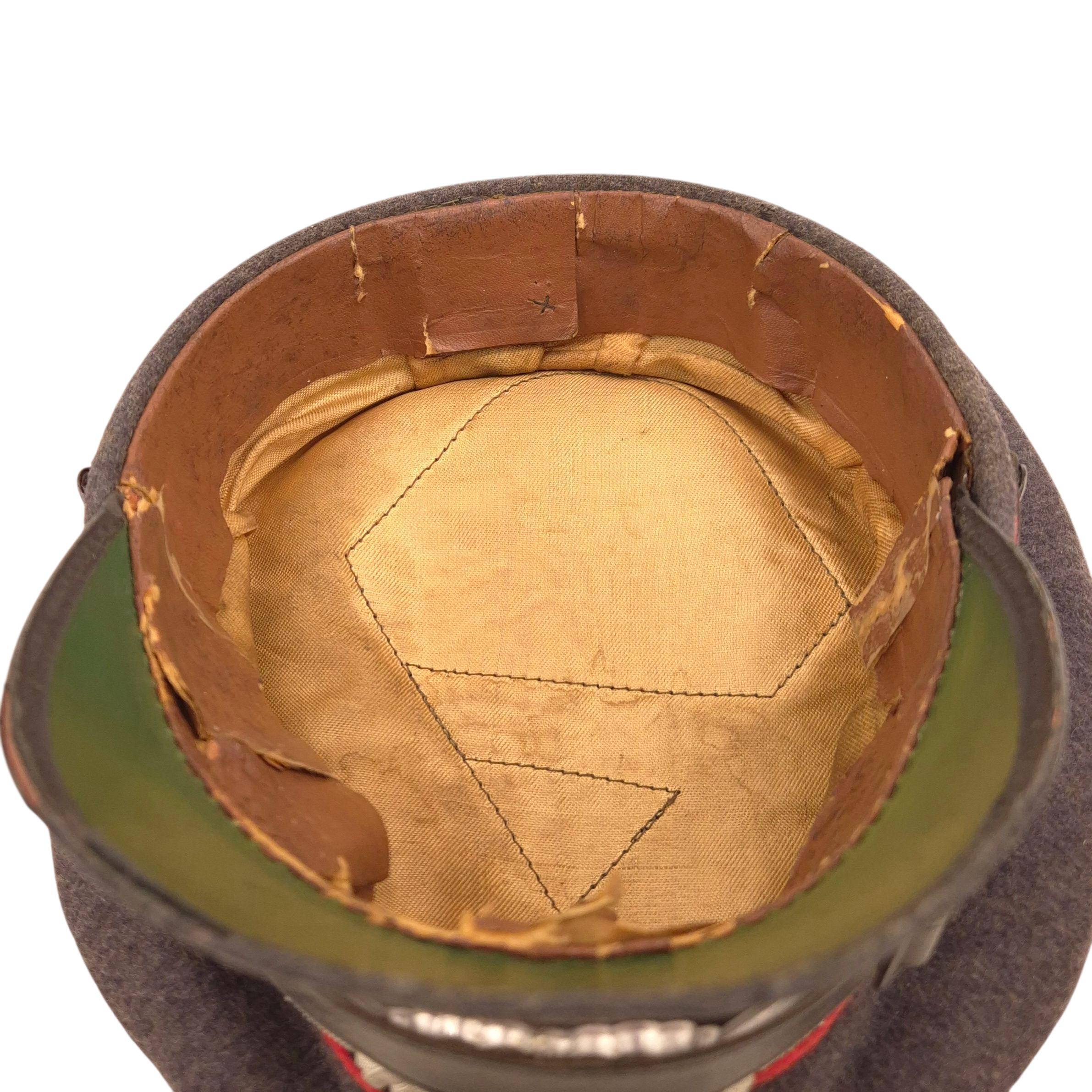 Original WWII Luftwaffe FLAK EM/NCO’s visor cap (Schirmmütze). The cap is not size-marked. It features the red branch colour for FLAK (Flakartillerie). The leather sweatband remains in heavily used condition, shows some damages, see photos. The cap is complete with its original early aluminum cap eagle and cockade. The simulated-leather chinstrap is well-preserved. The cap shows traces of wear. A good original Luftwaffe FLAK visor cap.