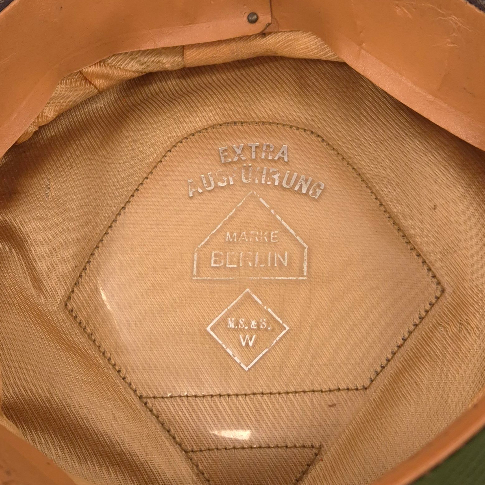 Original WWII Luftwaffe Flight/Fallschirmjäger EM/NCO’s visor cap (Schirmmütze). This is a privately purchased example, complete with its sweat diamond and clearly maker-marked: Extra Ausführung, Marke Berlin, M.S.&S. W (Marie Slama & Sohn, Wien). The cap is not size-marked. It features the yellow Truppenfarbe (branch colour) for paratrooper (Fallschirmjäger) and/or flight personnel (Fliegendes Personal). The leather sweatband remains in very good condition. The cap is complete with its original cap eagle and early aluminum cockade. The simulated-leather chinstrap is well-preserved. The cap shows minimal traces of wear and is in overall near-mint condition, with the exception of one small moth nip on the reverse. A very fine and attractive original Luftwaffe visor cap.