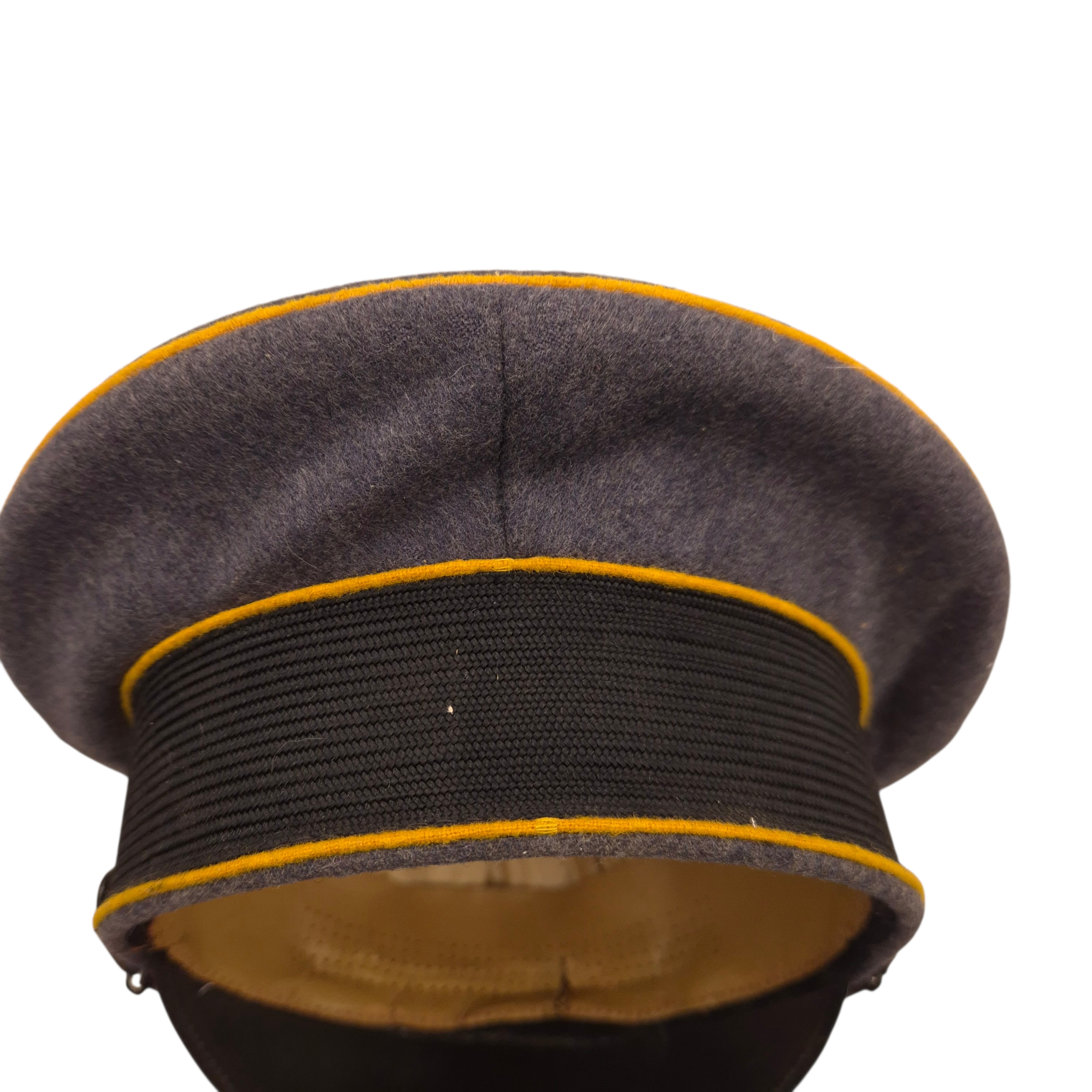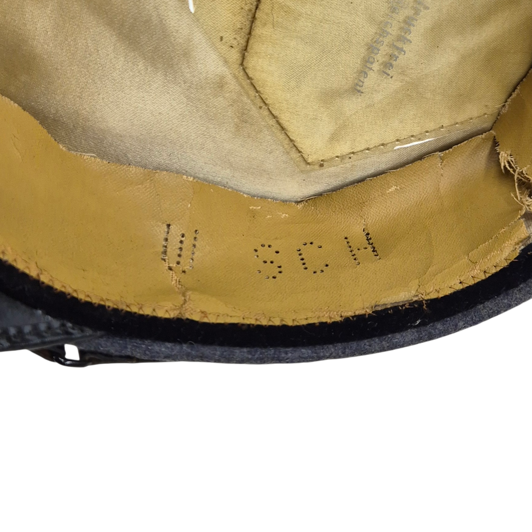 Original WWII Luftwaffe Flight or Paratrooper EM/NCO’s Visor Cap (Schirmmütze). This is privately purchased visor cap, the sweatdiamond is nicely marked by the tailor ‘Stirndruckfrei Deutsches Reichspatent’, the cap is not visible size marked. It features the yellow branch colour for Paratrooper (Fallschirmjäger) and Flight personnel, shows a damage on the top left-side. The leather sweatband shows traces of wear and minor damage, see photos. The cap is complete with its original early aluminium cap eagle and cockade. The simulated leather chinstrap remains in good condition.