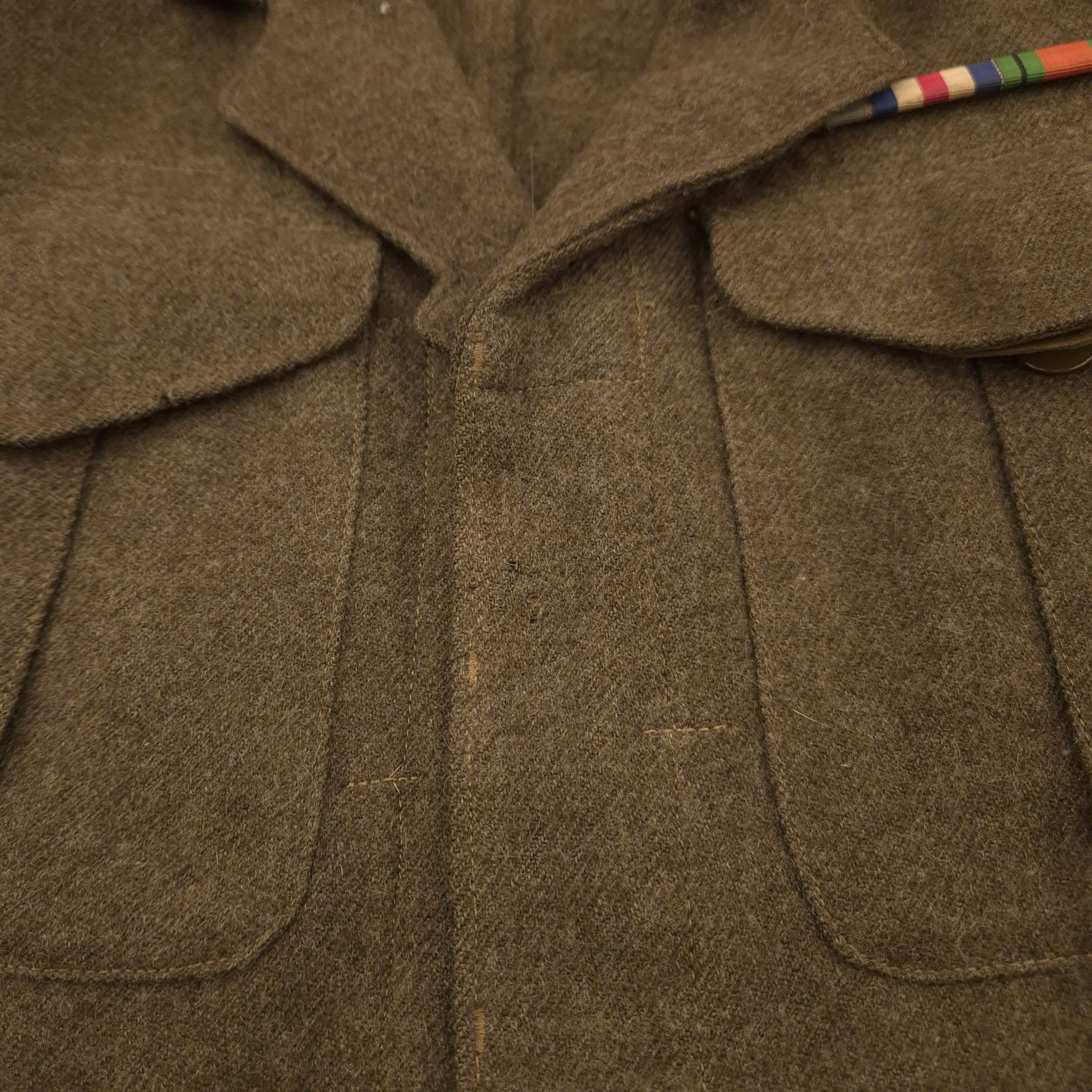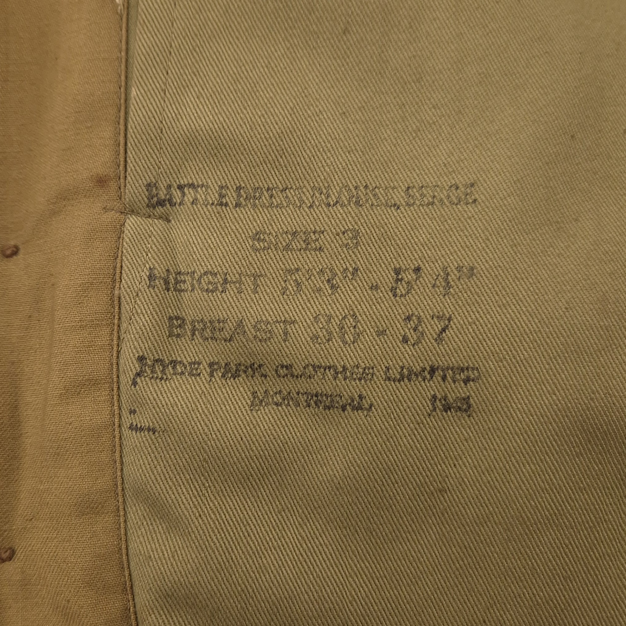 Queen’s Own Rifles of Canada (QOR) Battle Dress Jacket. Original, period-badged example featuring stunning English made embroidered “Queen’s Own Rifles” shoulder titles, CANADA shoulder titles and melton 3rd Canadian Infantry Division formation patches The insignia is nicely sunken into the fabric. The jacket is in good used condition overall, with some minor surface moth damage. Maker marked by Hyde Park Clothes Limited, date is hard to make out. Size 3 (fits a small to regular build or mannequin).The collar has been period-tailored and features a so-called ‘plated’ backside. A desirable example from a hard-to-find regiment.