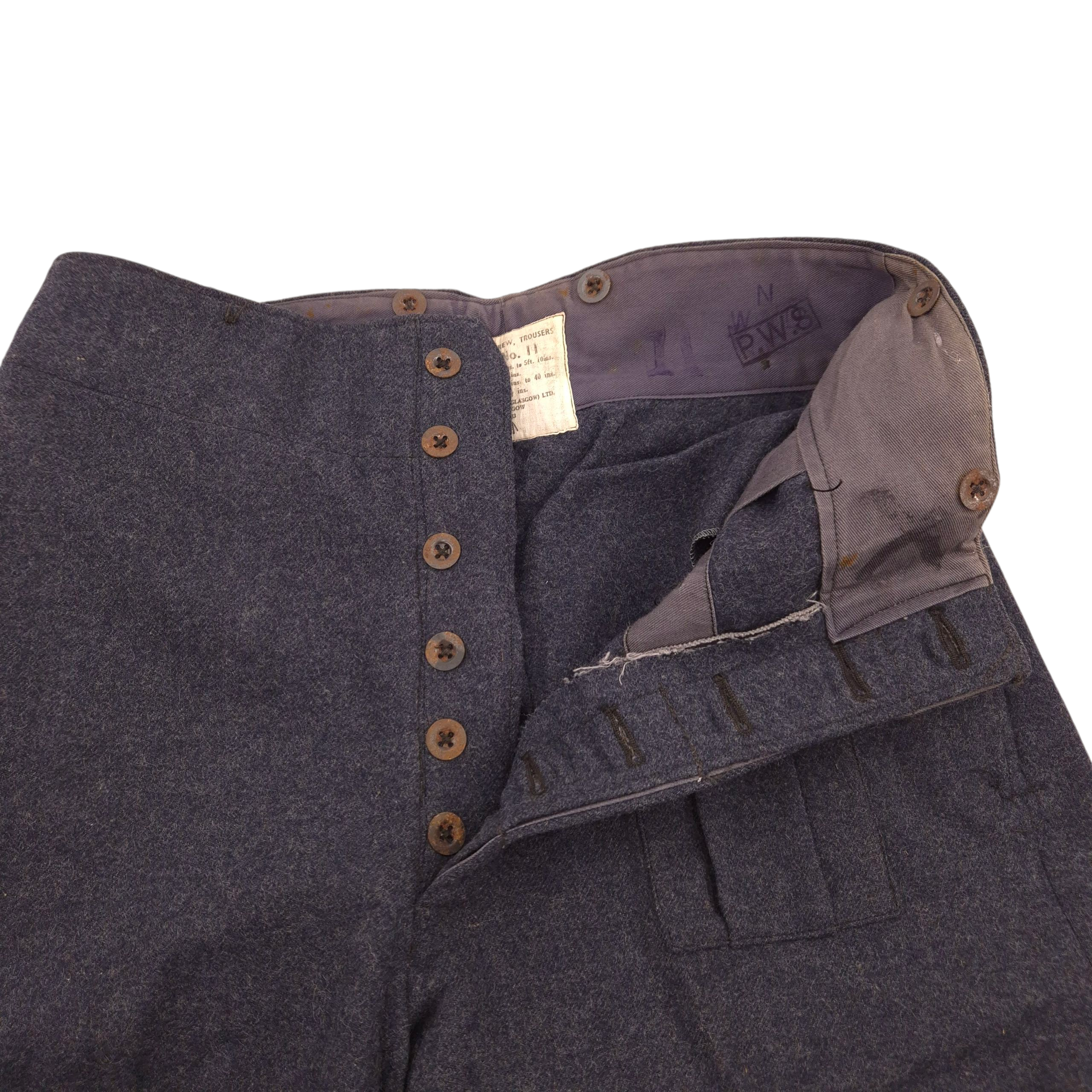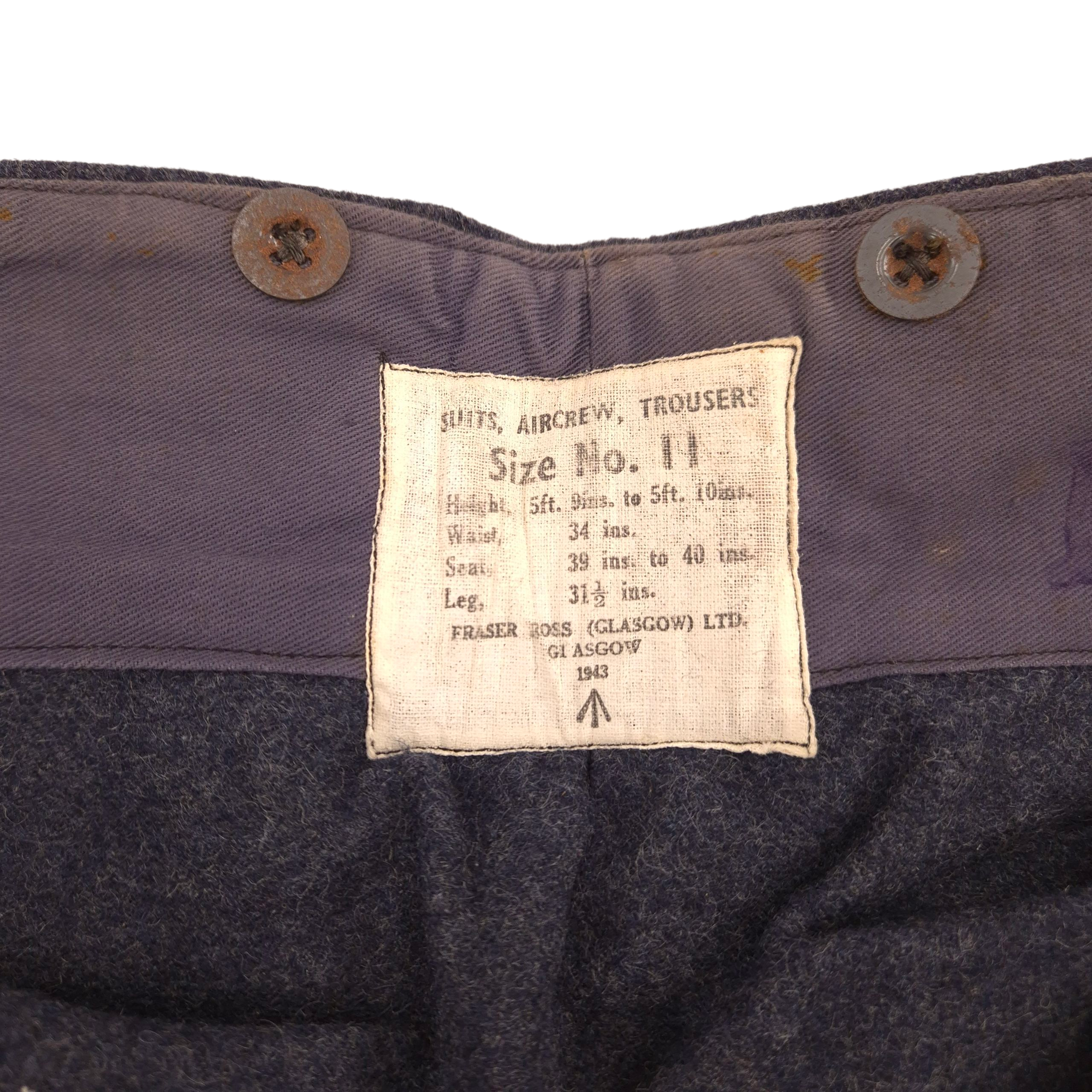 Original WWII R.A.F. Aircrew Trousers. These trousers are in good condition, with some minor wear and small damages (please see photos). They retain their original label: Suits, Aircrew, Trousers, size 11, manufactured by Fraser Ross Ltd, Glasgow, and dated 1943.