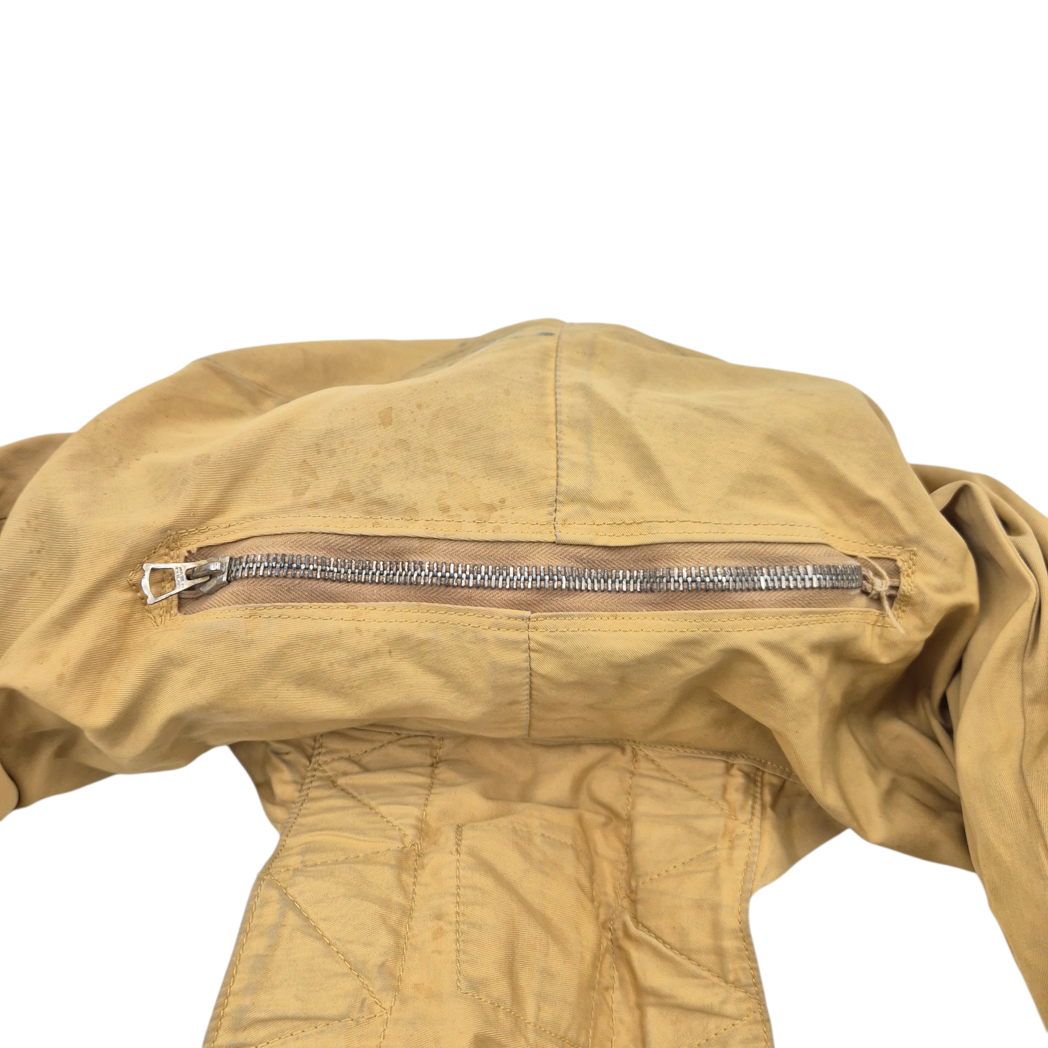 Original 1941 Pattern RAF Mae West life preserver in very good, used condition. Early in the war, production ceased to include the physical flap, although the “Type Flap” designation continued to appear on the factory label. Later wartime examples were issued with a revised label omitting the “Type Flap” marking. Air Ministry Contract No. 6042/C34, size Medium. The life preserver retains strong colour and is free from damage, showing only light staining consistent with service wear. The original label is present, clear, and fully legible. All components are intact, including the leg straps, grab handles, tying tapes, and fluorescence flap/strap (fluorescent material no longer active). The flotation lamp pocket is present, and all press-studs and buttons remain complete. The original brass zip is intact and in good working order.