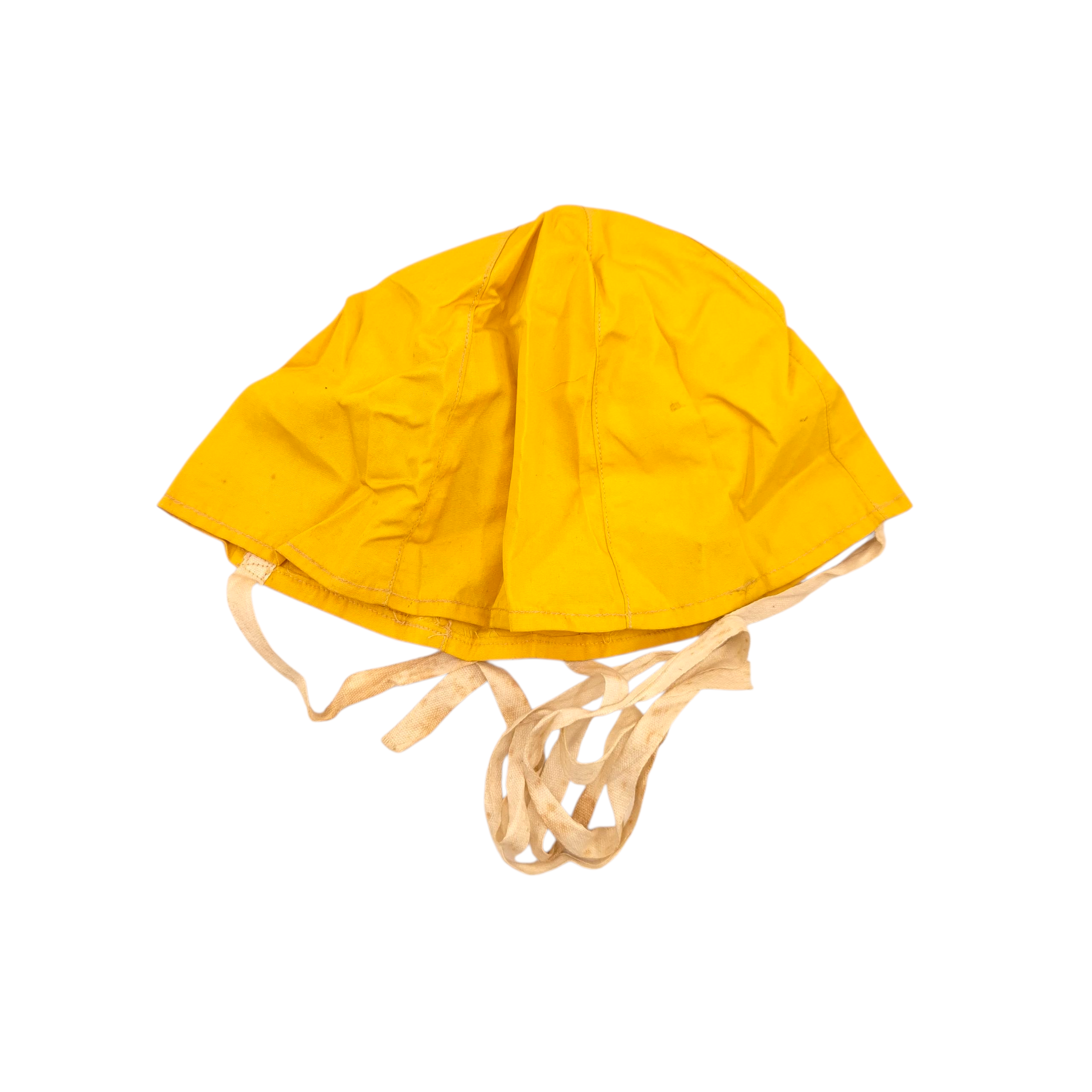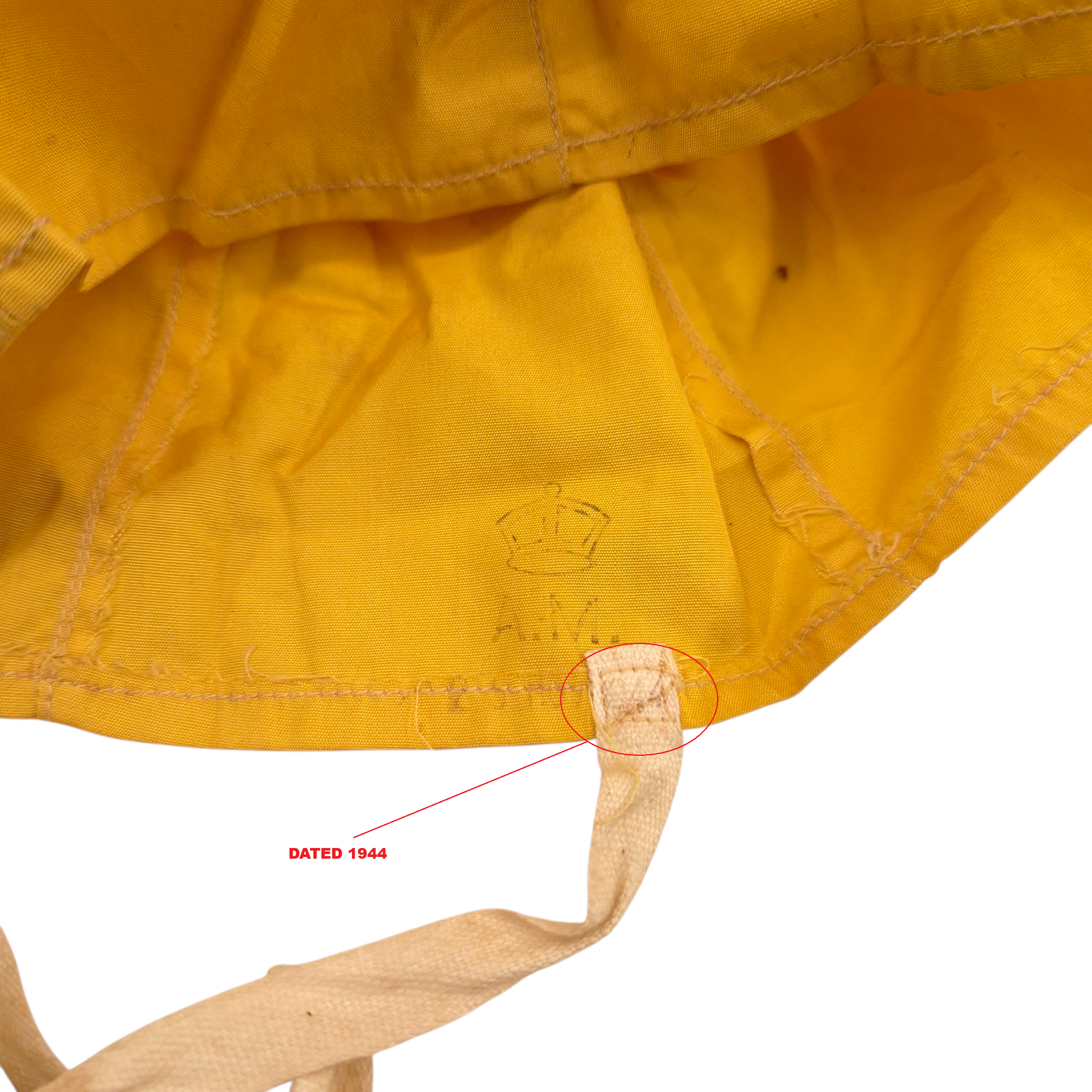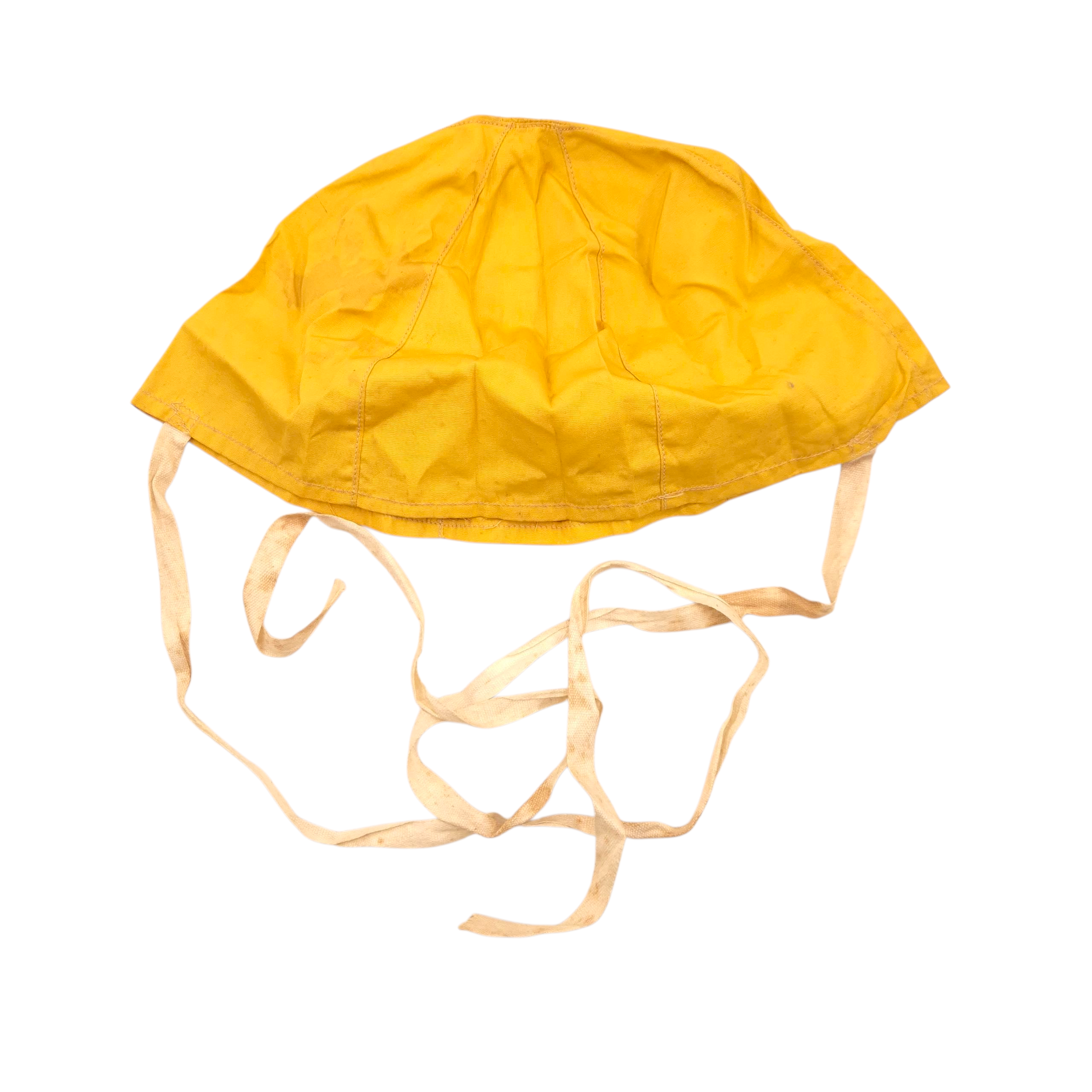 Original RAF 1941 pattern Mae West skull cap. Yellow cotton skull cap with white tying tapes. A.M stamped, dated 1944. In very good condition. Fits in the front pocket of the 1941 pattern Mae west.