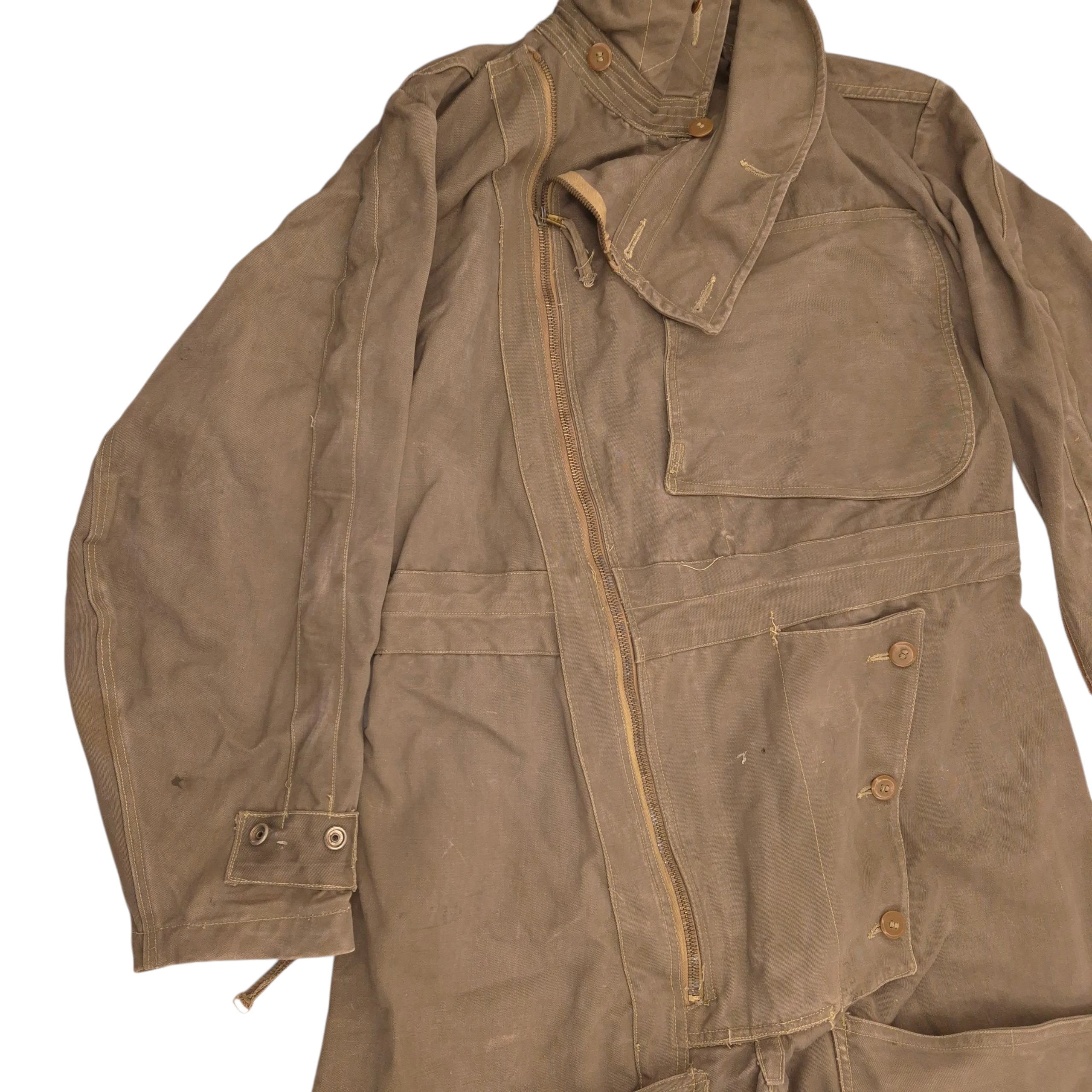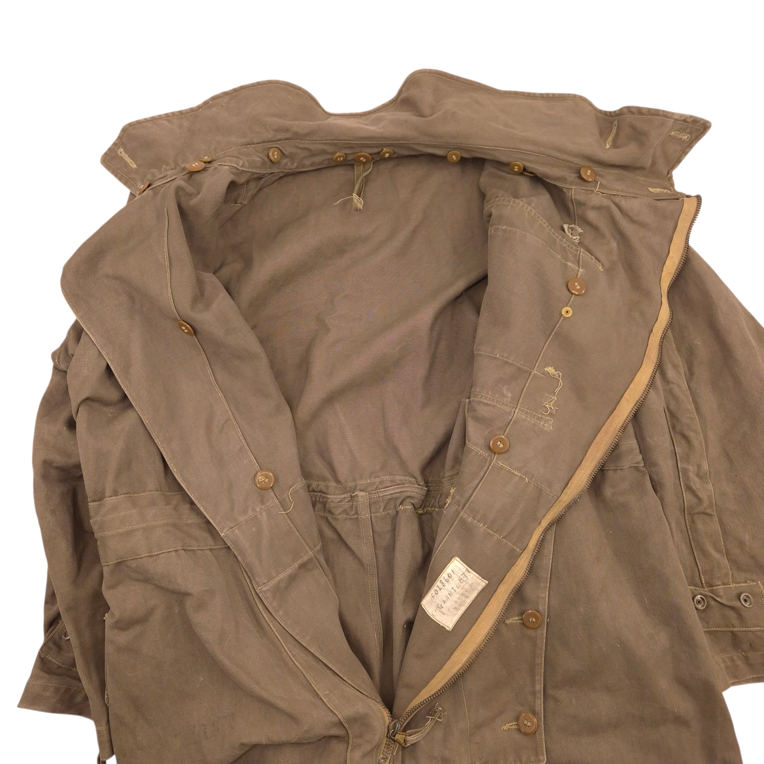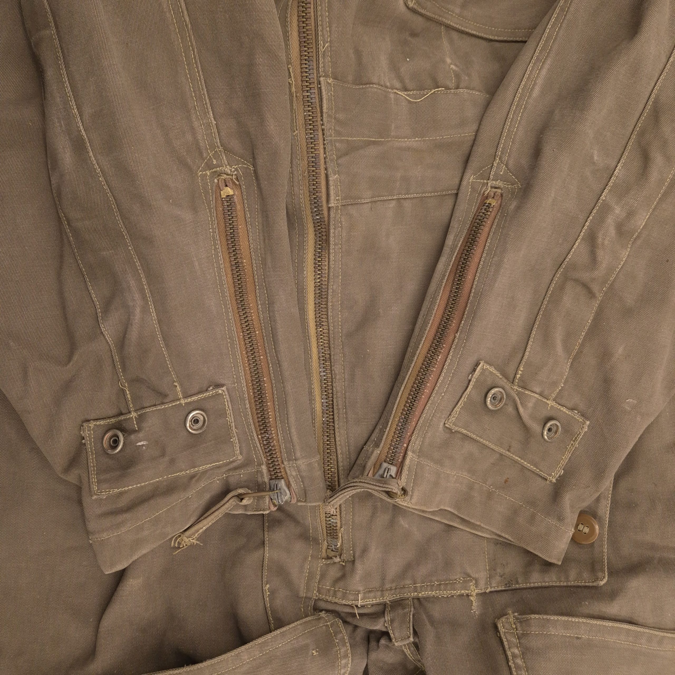 Original WWII RAF 1941 Pattern Sidcot Flying Suit, named to C. Gauntlett. This brown electrically wired version of the Sidcot appears in good used condition. The wiring is complete, as are the press-stud connector panels for use with heated gloves and boots. All zips are in good working condition; one back-side zipper is missing the slider, which does not affect because the zipper is closed now. The suit is complete with cloth puller tags, cloth hanger, belt, and a label that is not clearly readable.