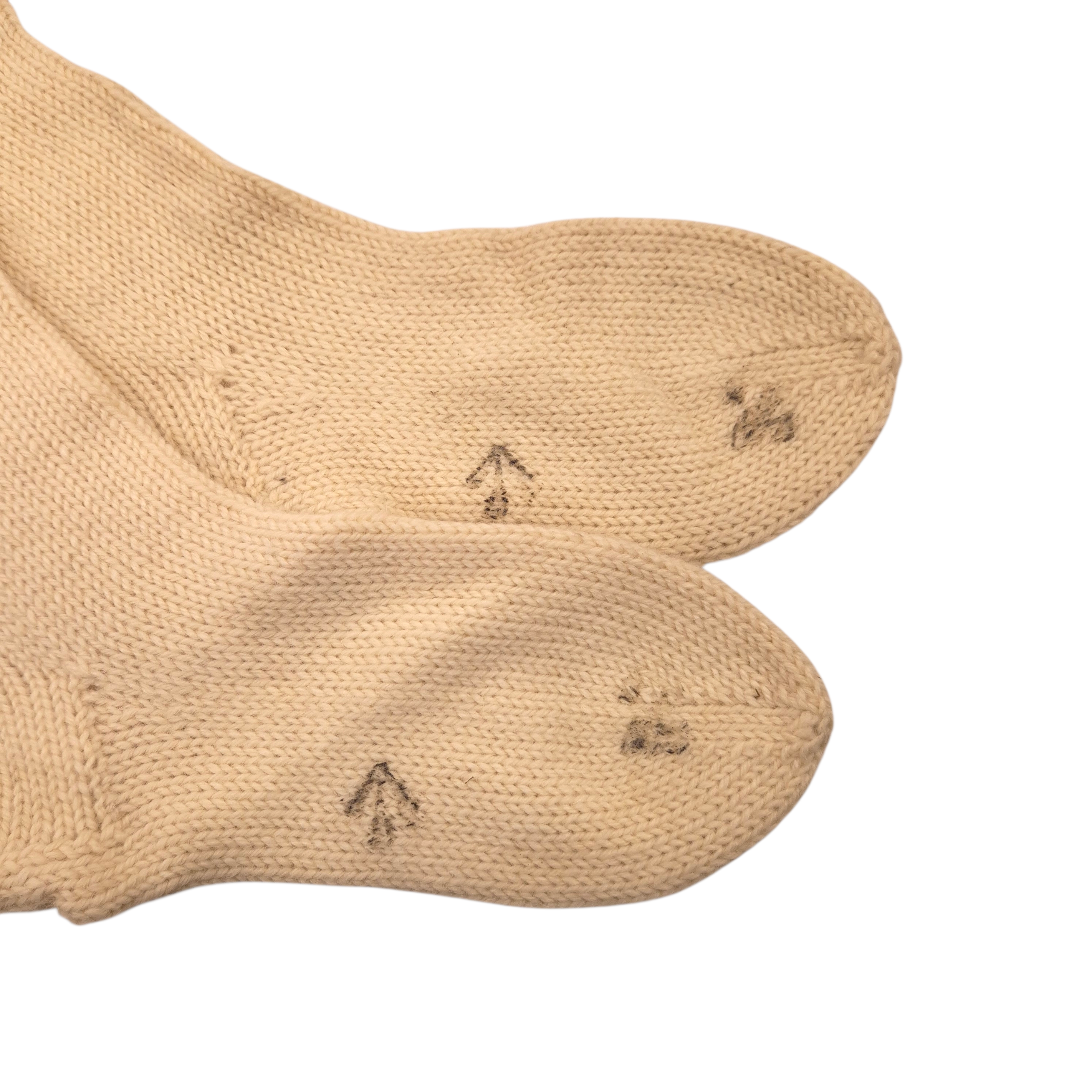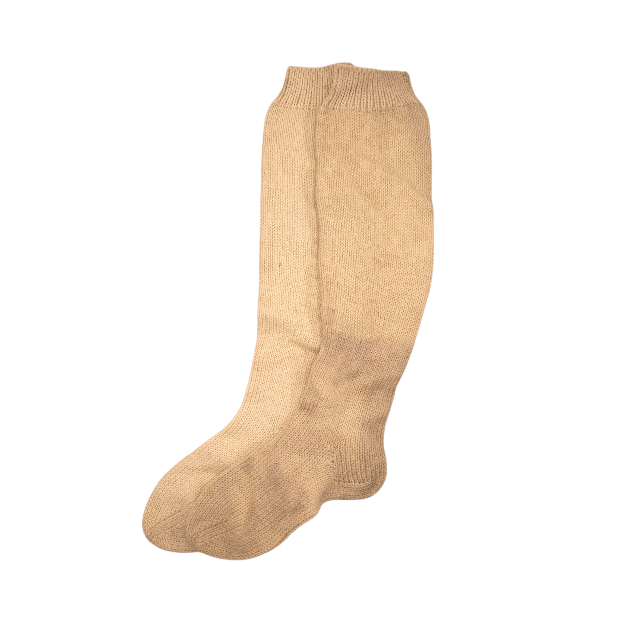 Original WWII RAF Aircrew and Dispatch Rider boot socks in a creamy white shade, worn with most flying boots and motorcycle riders. They are in excellent unused condition with only storage wear. The sock are Broad Arrow and size 2 stamped. Very hard to find!