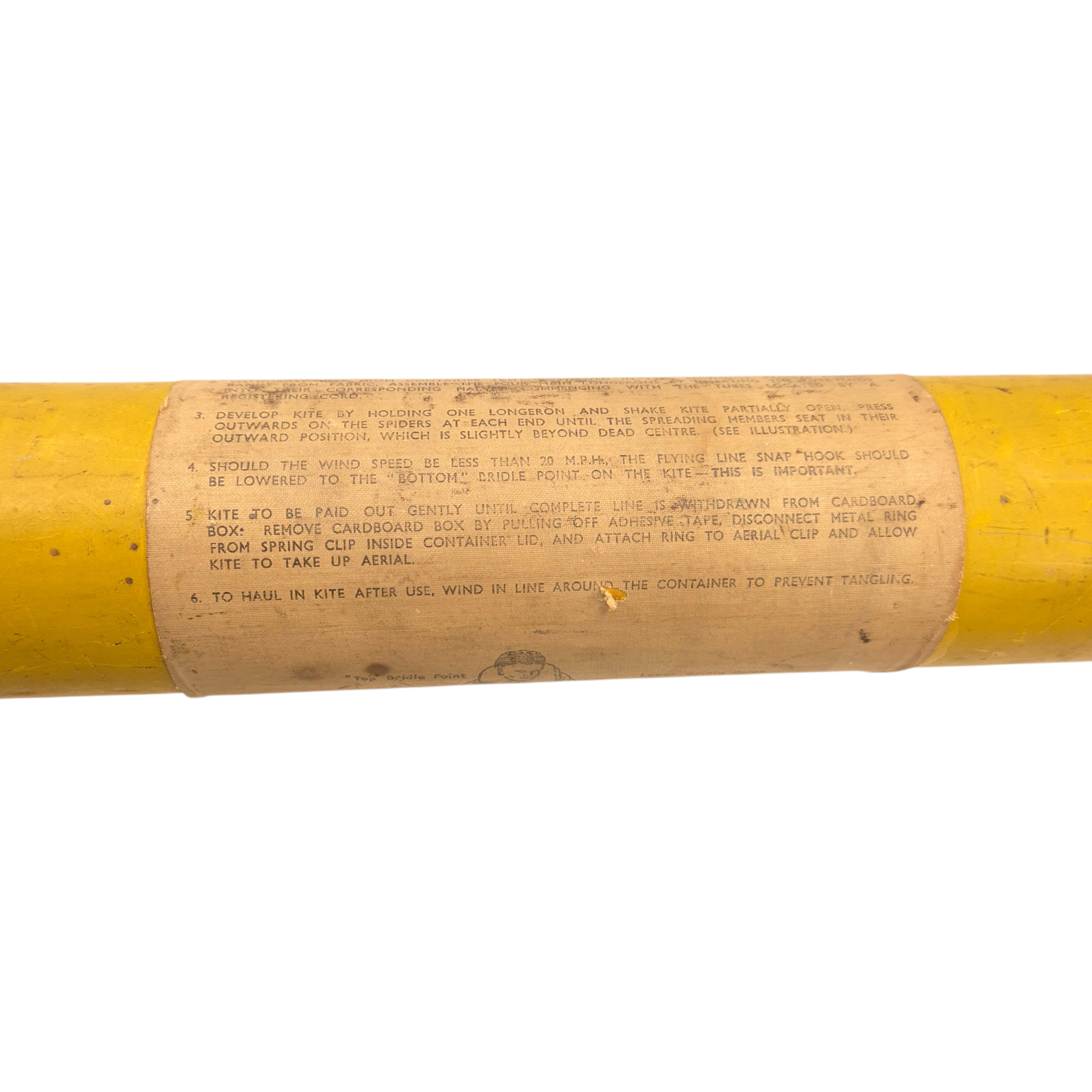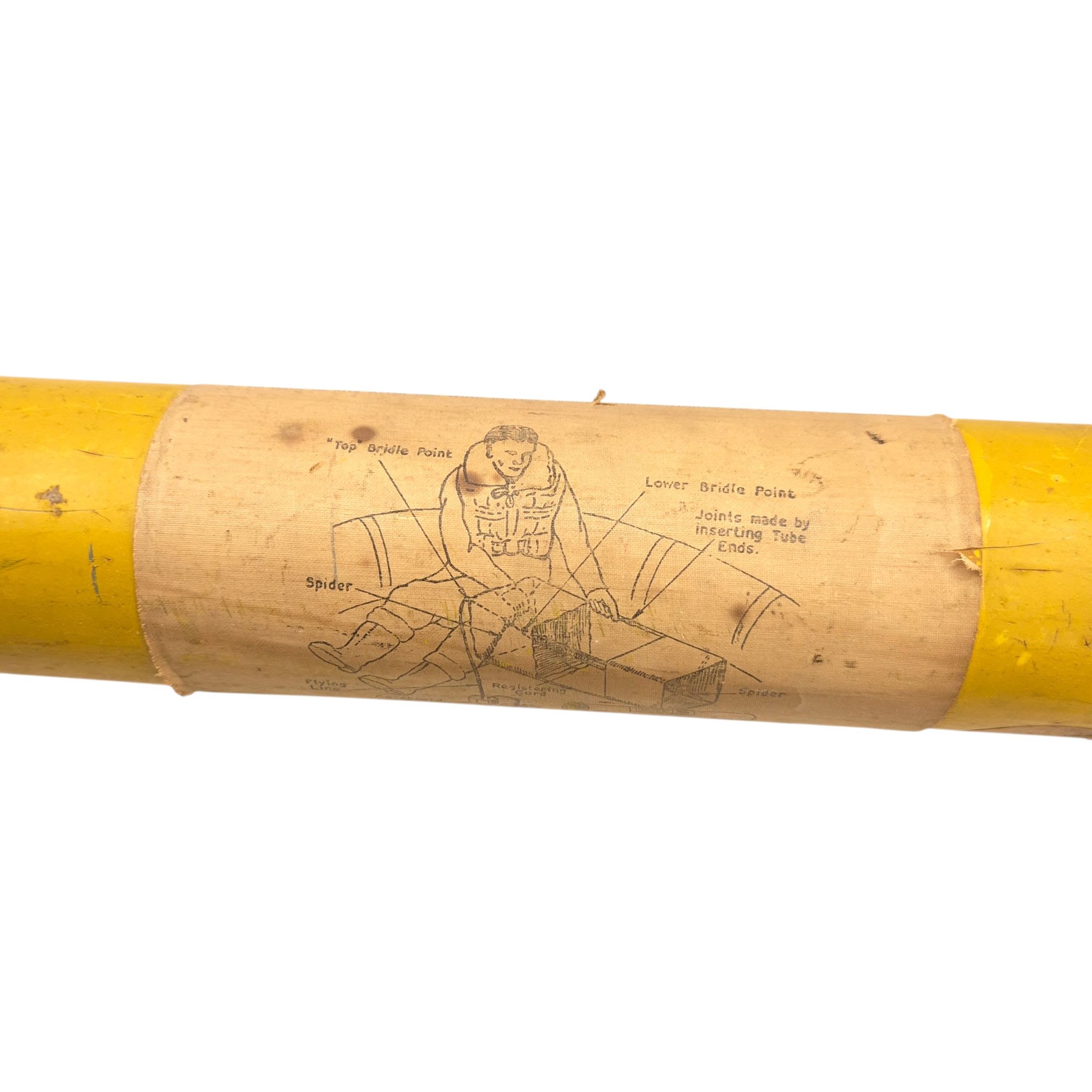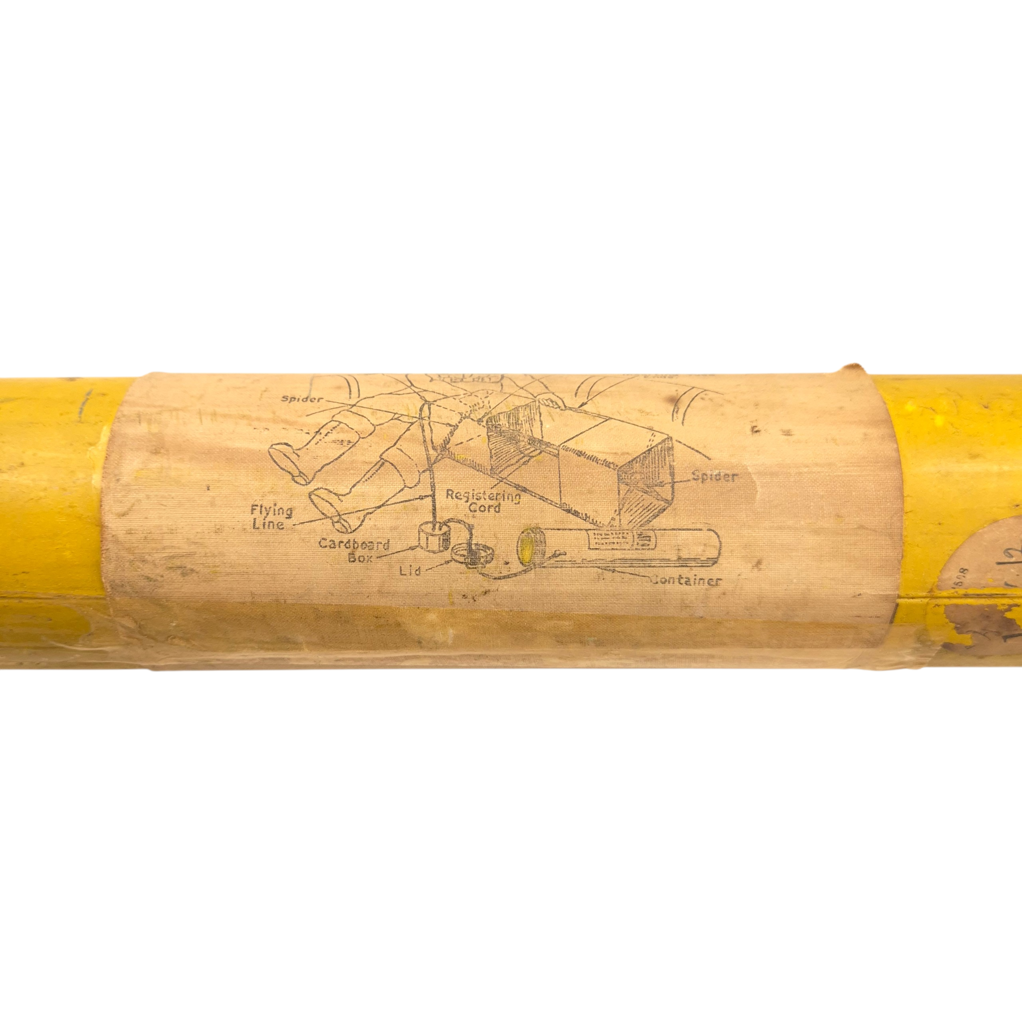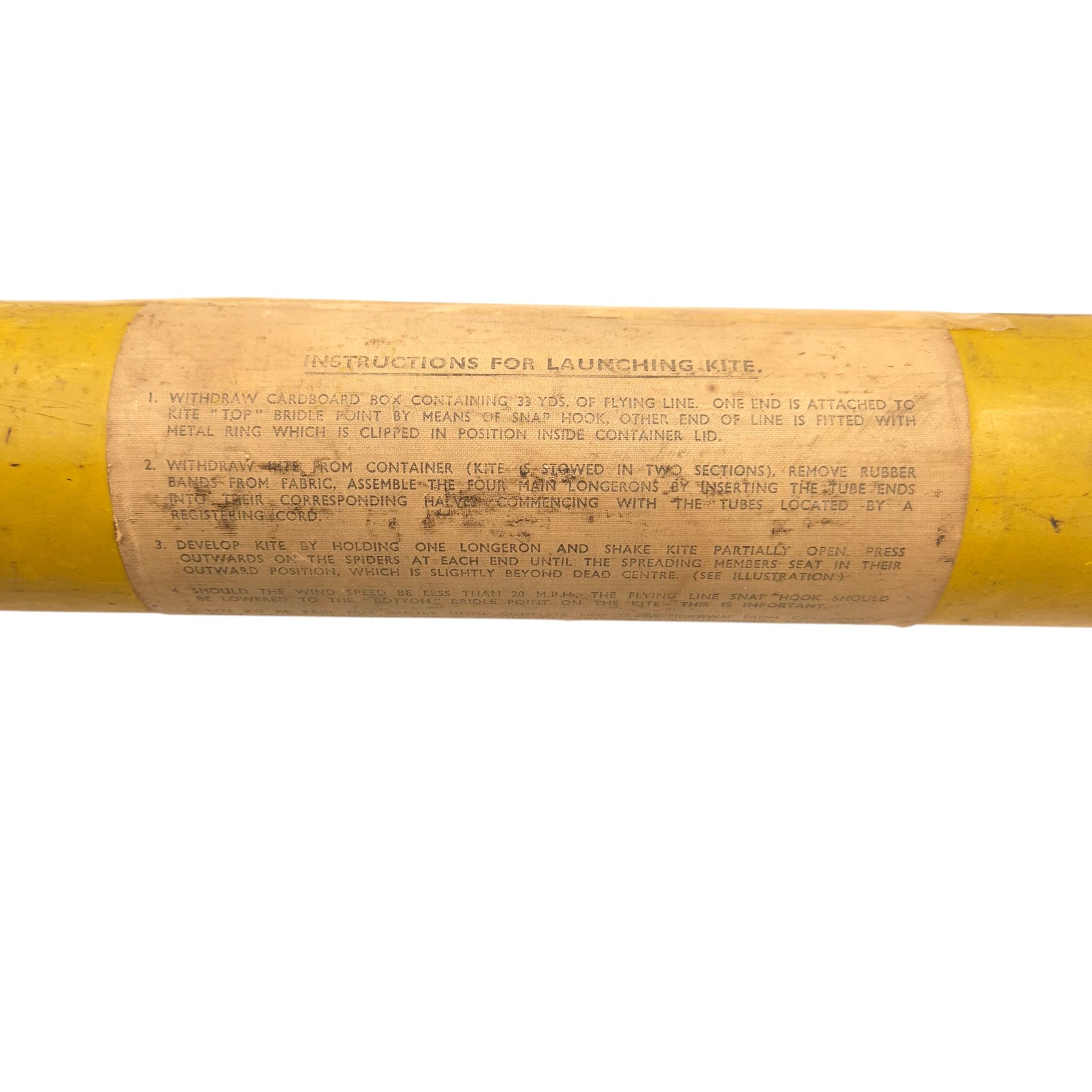 Original WWII RAF “Gibson Girl” Radio Aerial Launching Kite. This was an emergency radio transmitter used in Royal Air Force (RAF) aircraft and lifeboats. It required a kite to lift its antenna—this is one of those kites. It comes in two sections for assembly. The metal tube includes instructions and a diagram. The kite has yellow/orange fabric with printed instructions. The tube is in good condition and includes the original screw-top lid. Dimensions (assembled): 94 × 43 × 43 cm, Tube: 56 × 7.5 cm.