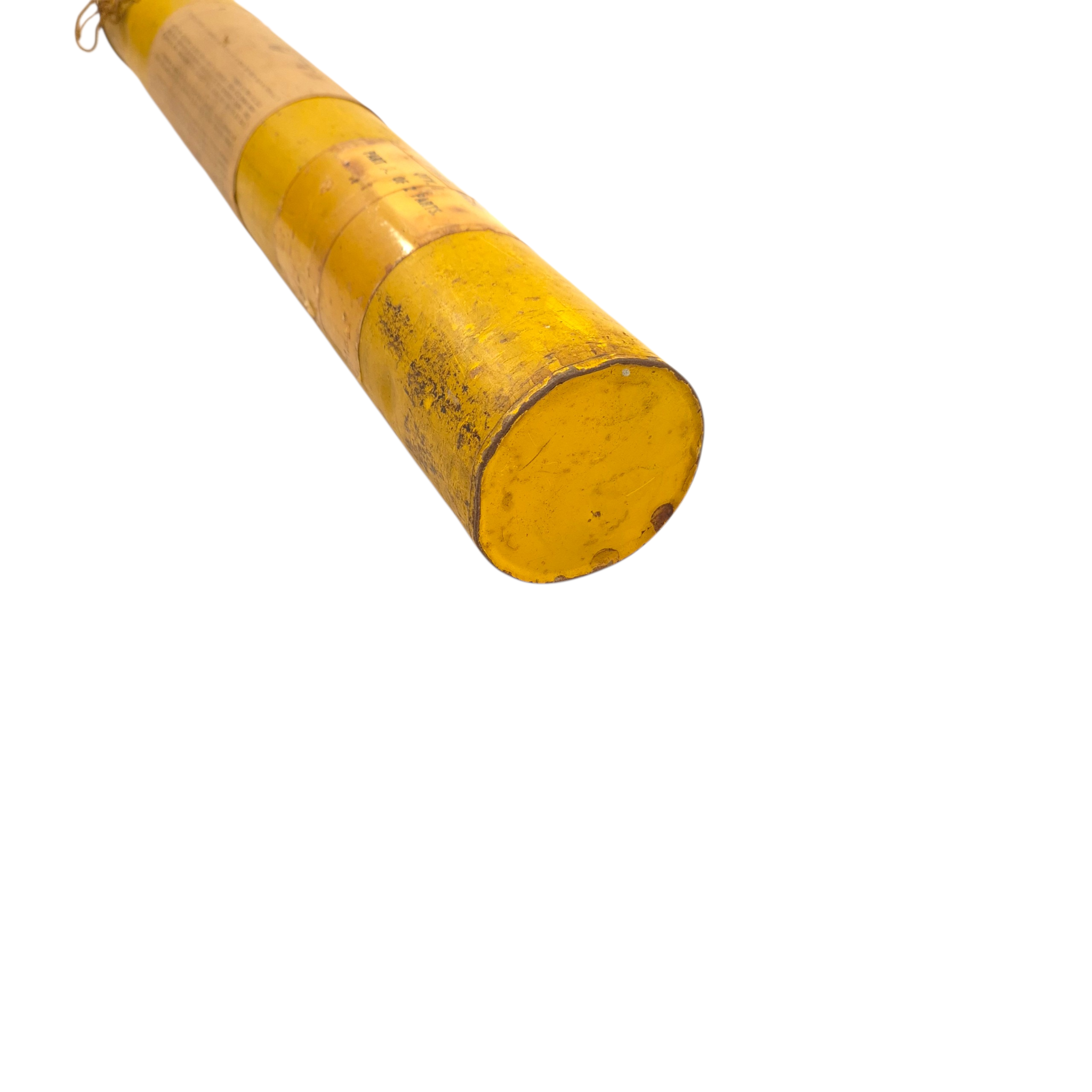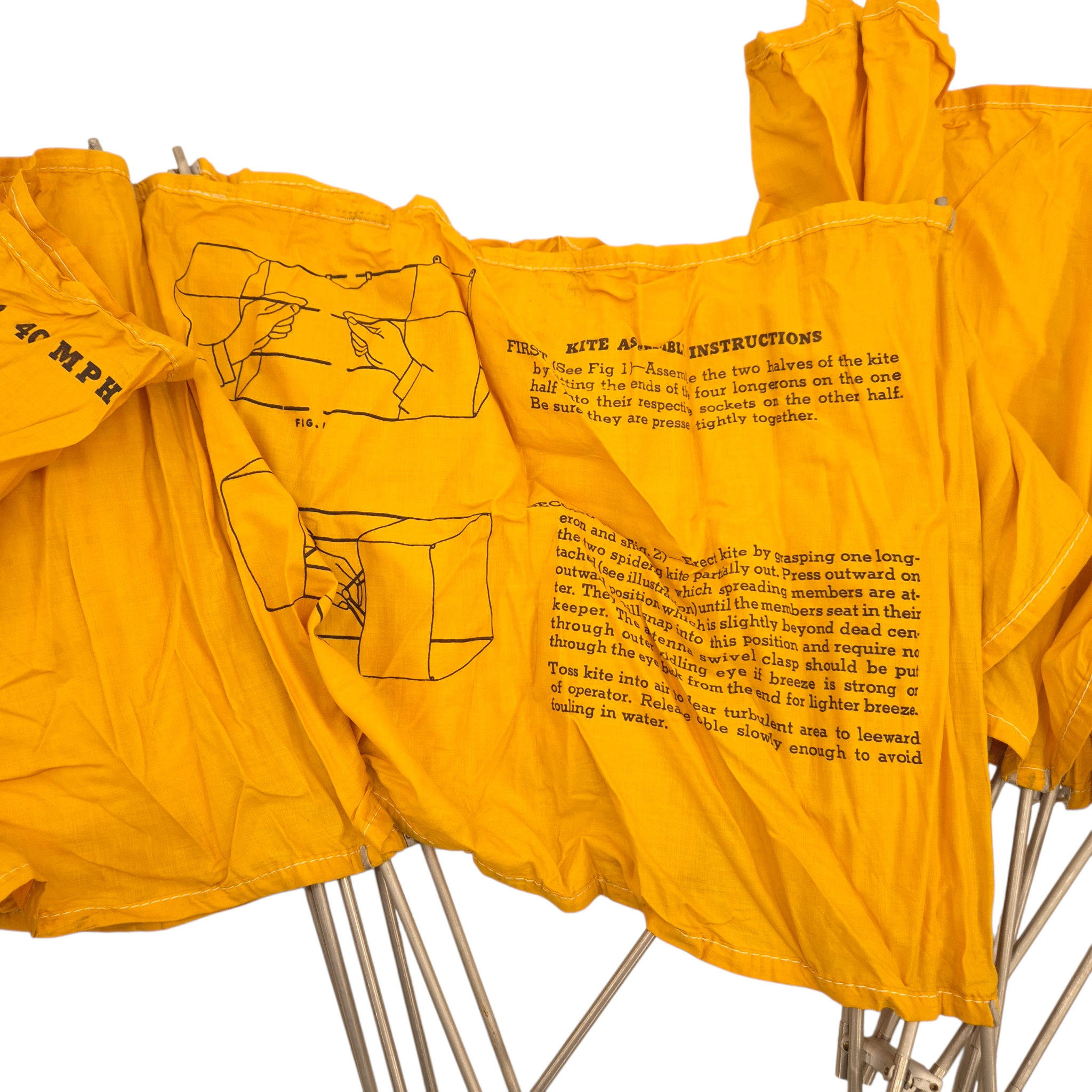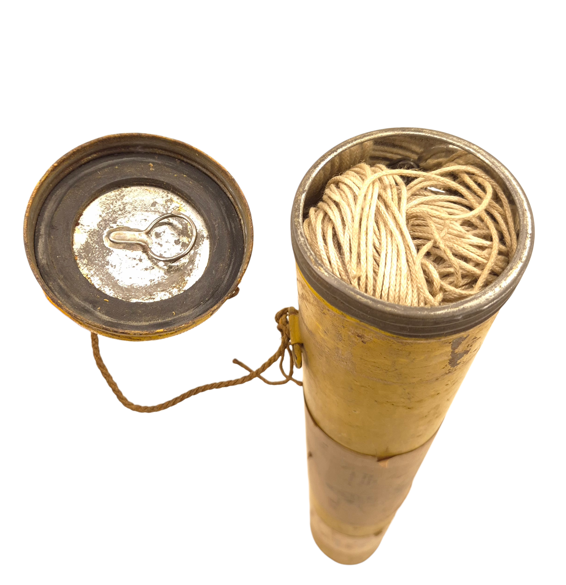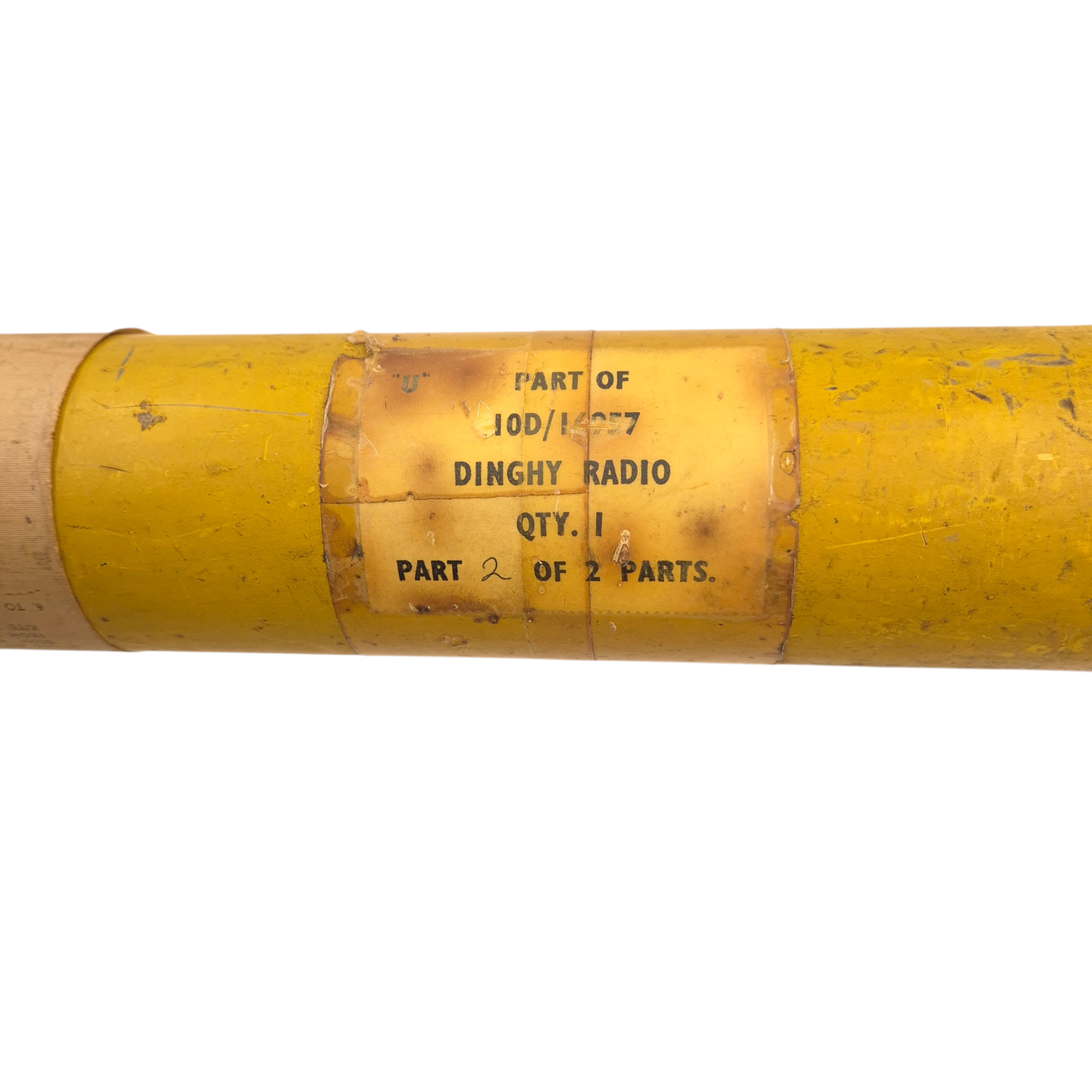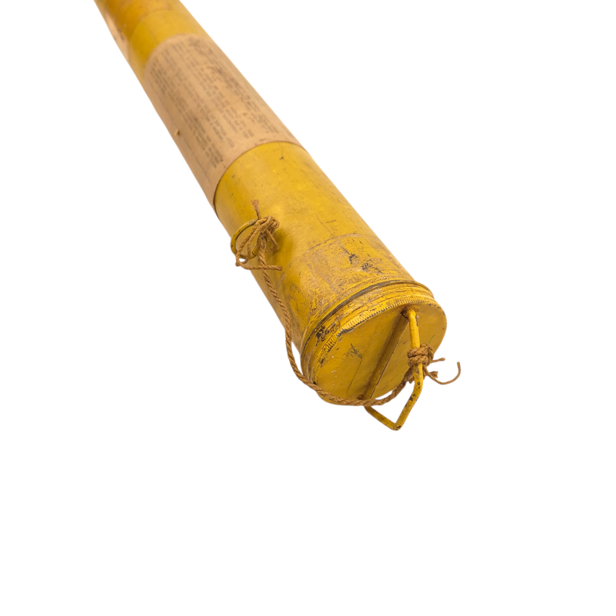 Original WWII RAF “Gibson Girl” Radio Aerial Launching Kite. This was an emergency radio transmitter used in Royal Air Force (RAF) aircraft and lifeboats. It required a kite to lift its antenna—this is one of those kites. It comes in two sections for assembly. The metal tube includes instructions and a diagram. The kite has yellow/orange fabric with printed instructions. The tube is in good condition and includes the original screw-top lid. Dimensions (assembled): 94 × 43 × 43 cm, Tube: 56 × 7.5 cm.