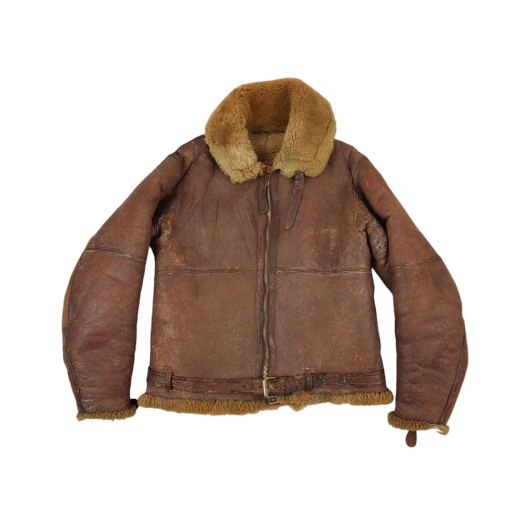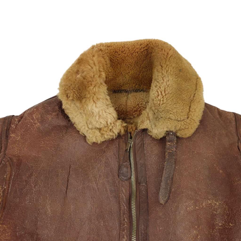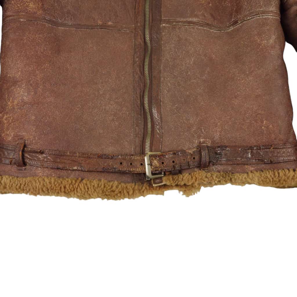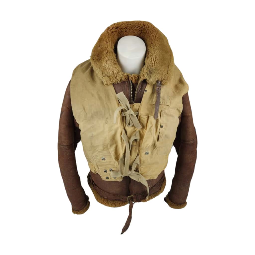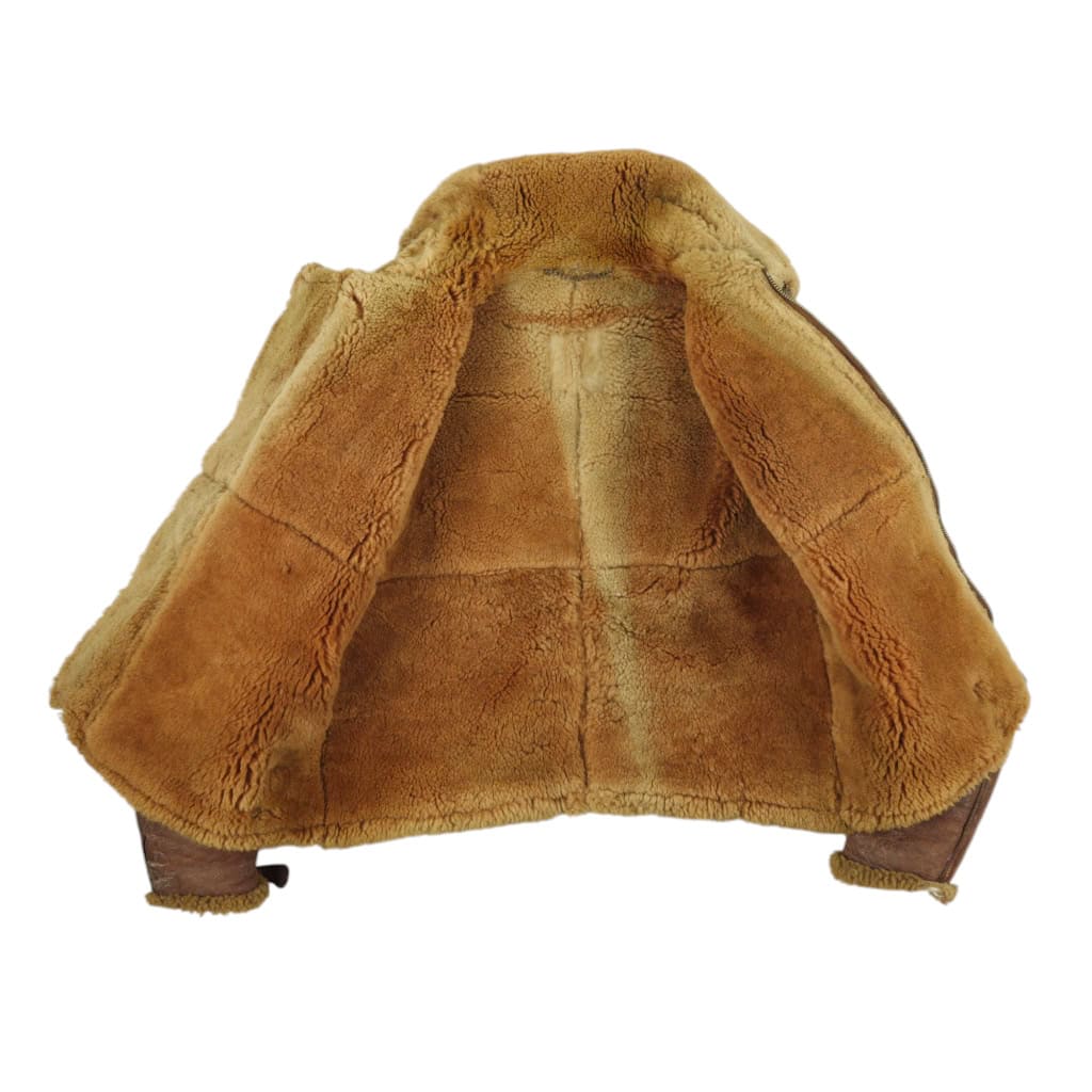 Original WWII RAF Irvin flying jacket ‘Thermally Insulated Flying Suit. This example is of a wartime multiple panel construction “Stores reference 22c/321, size 5”. The leather is generally in good overall condition, normal traces of wear. Both cuffs and waist retain reasonable amounts of fur trim. All zips are original with their original leather pulls, they are all three funtional. The belt, collar strap and rings and leather hanger (hanger has loose stitching) are complete and in good condition. Labelled with its original label. Irvin flying jackets are getting hard to find in this condition!