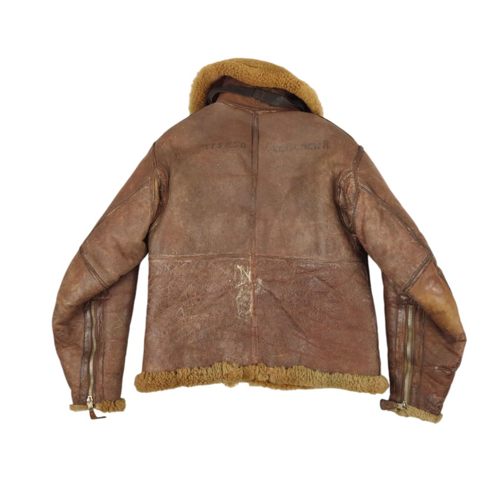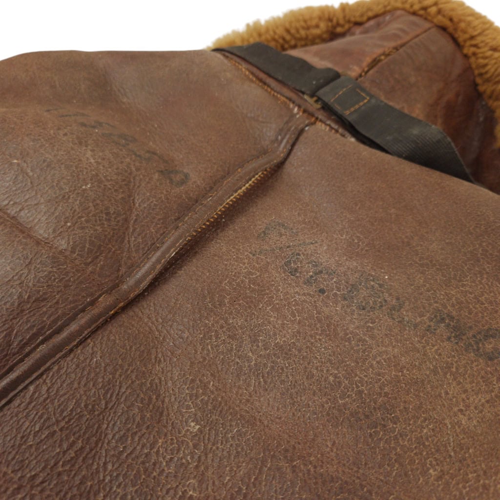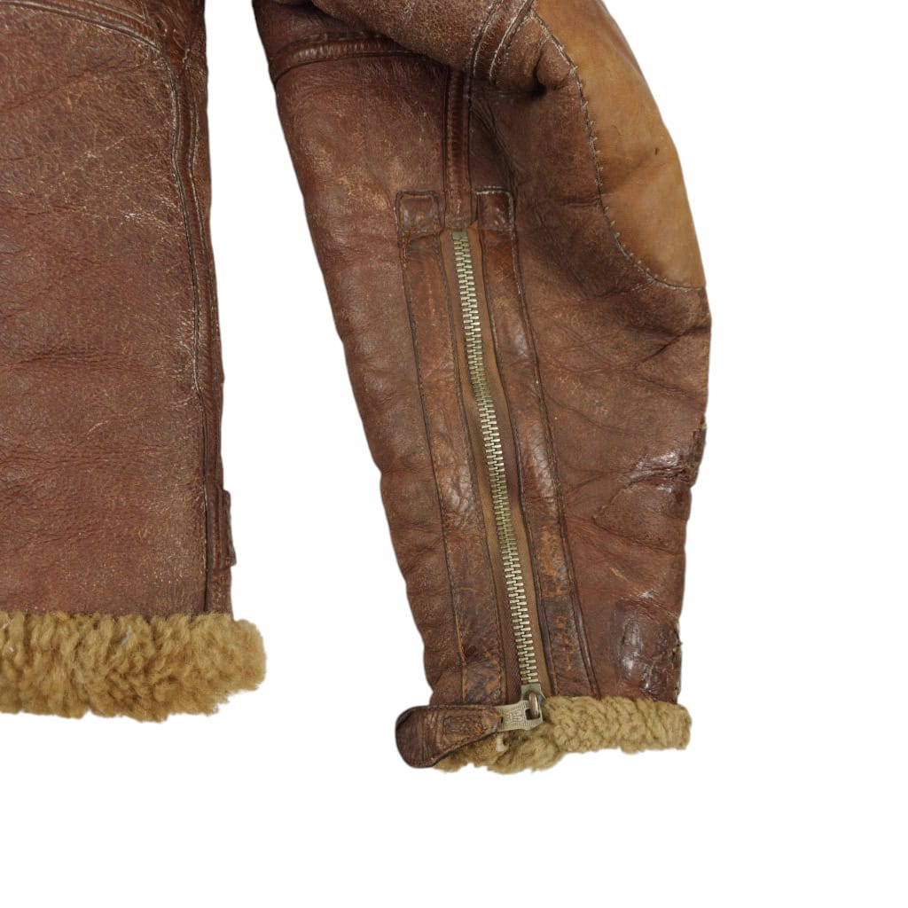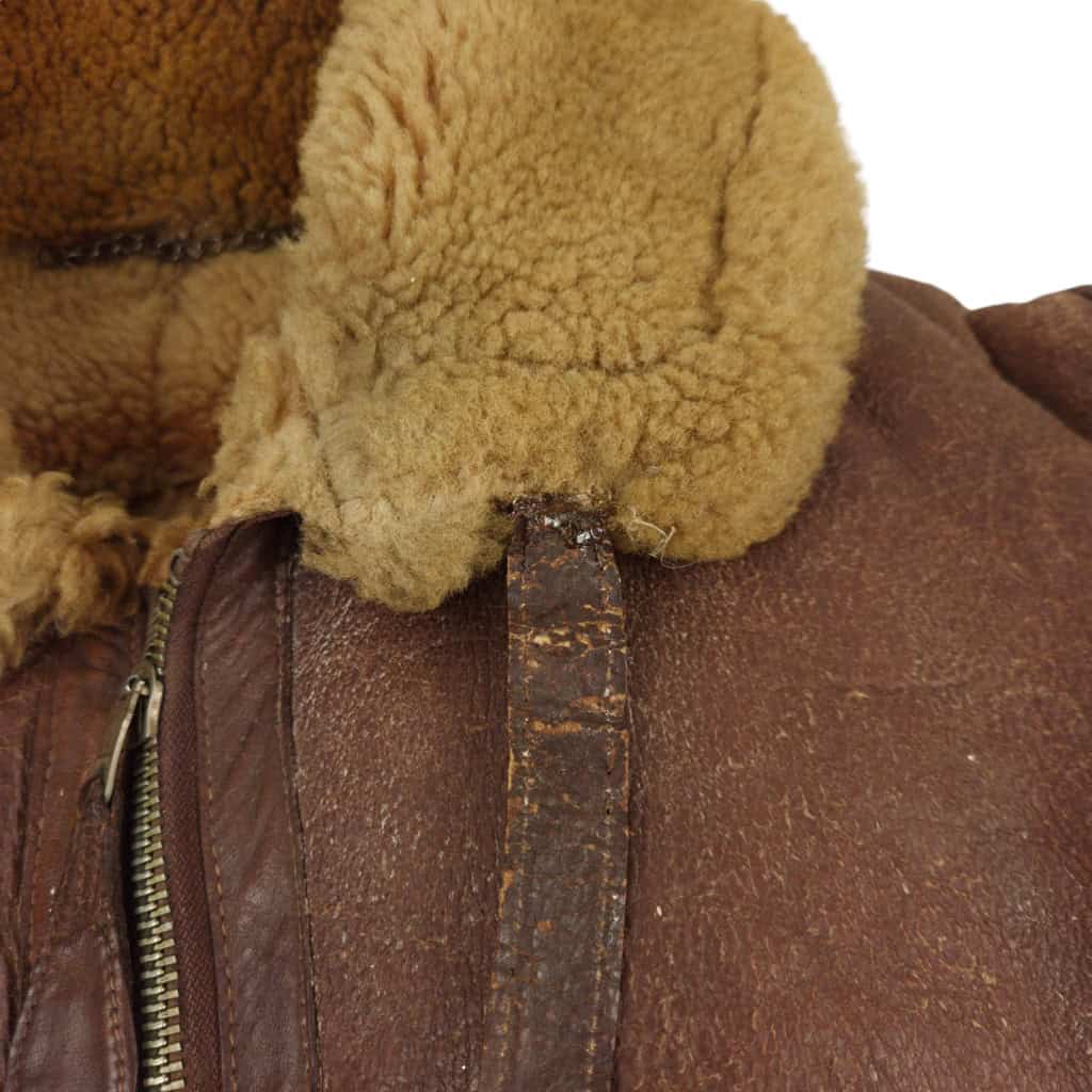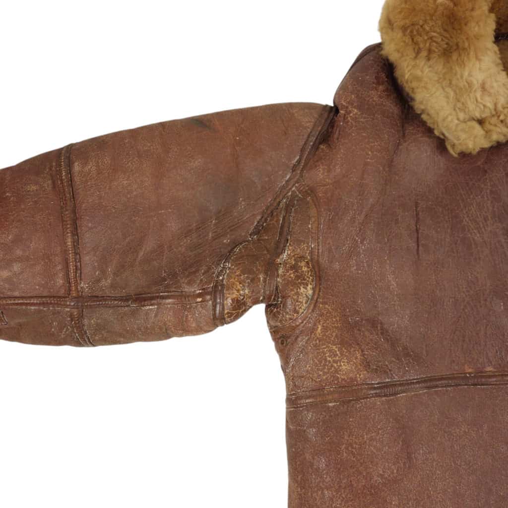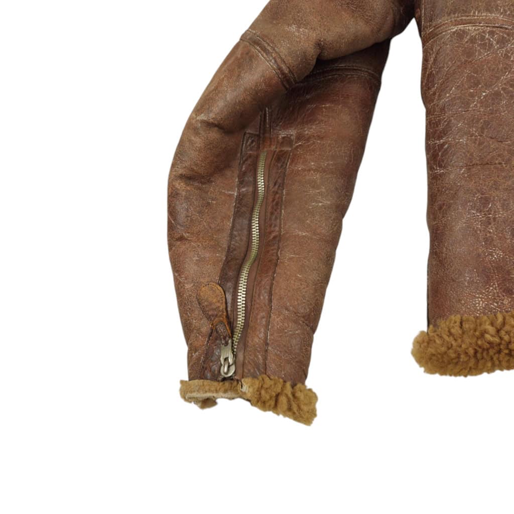 Original WWII RAF Irvin flying jacket ‘Thermally Insulated Flying Suit. This example is of a wartime multiple panel construction “Stores reference 22c/321, size 5”. The leather is generally in good overall condition, normal traces of wear. Both cuffs and waist retain reasonable amounts of fur trim. All zips are original with their original leather pulls, they are all three funtional. The belt, collar strap and rings and leather hanger (hanger has loose stitching) are complete and in good condition. Labelled with its original label. Irvin flying jackets are getting hard to find in this condition!