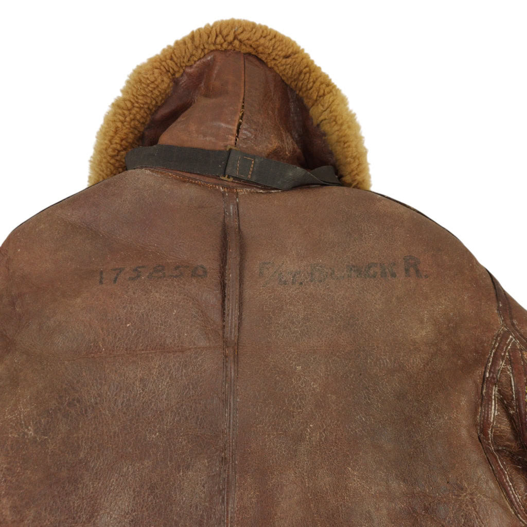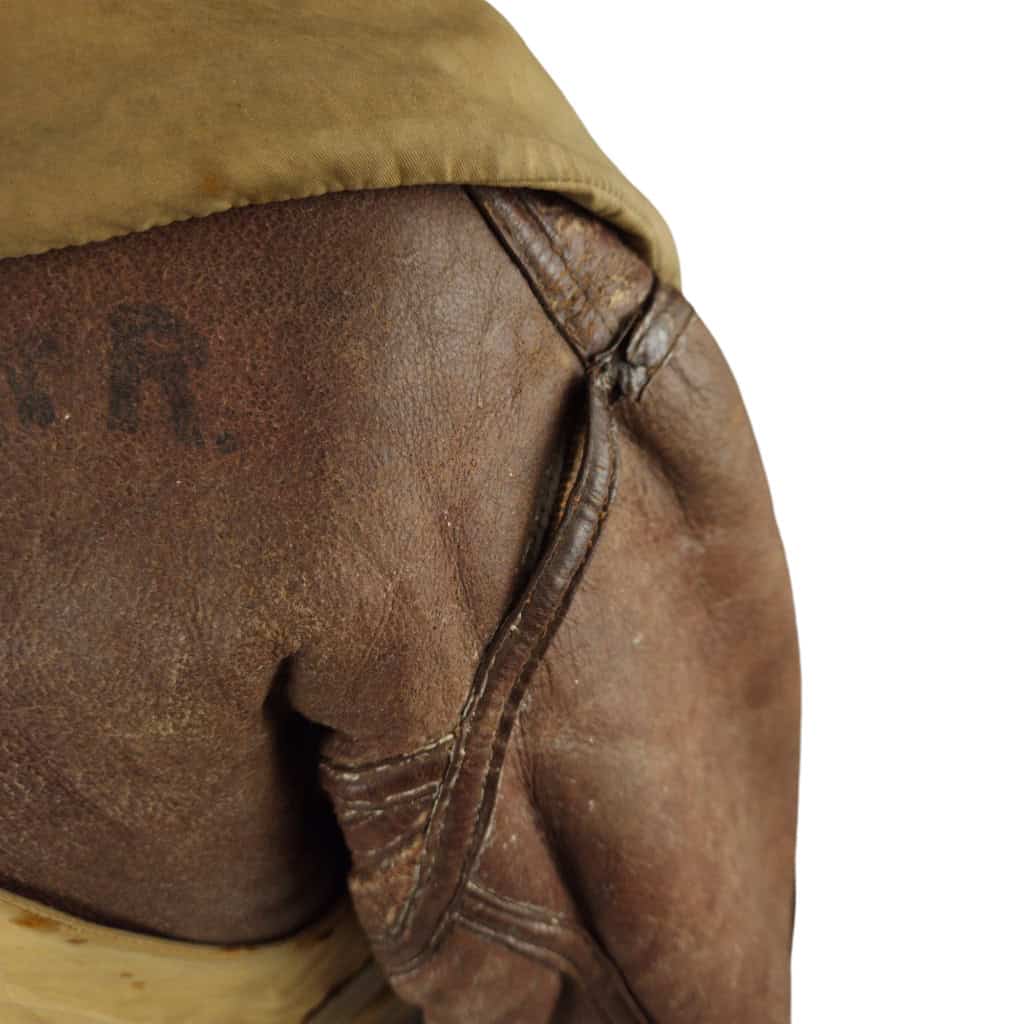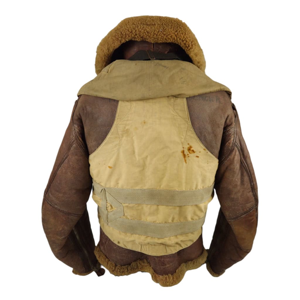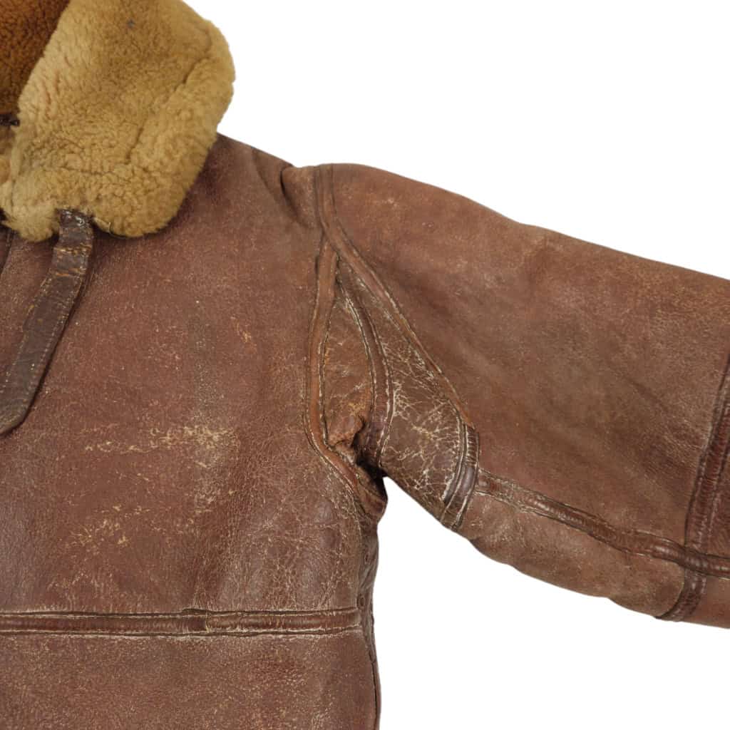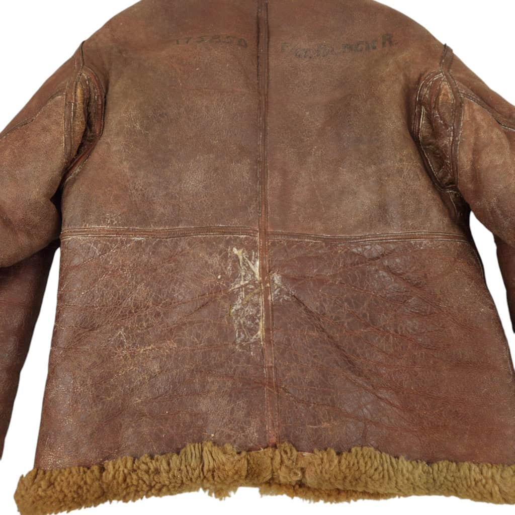 Original WWII RAF Irvin flying jacket ‘Thermally Insulated Flying Suit. This example is of a wartime multiple panel construction “Stores reference 22c/321, size 5”. The leather is generally in good overall condition, normal traces of wear. Both cuffs and waist retain reasonable amounts of fur trim. All zips are original with their original leather pulls, they are all three funtional. The belt, collar strap and rings and leather hanger (hanger has loose stitching) are complete and in good condition. Labelled with its original label. Irvin flying jackets are getting hard to find in this condition!
