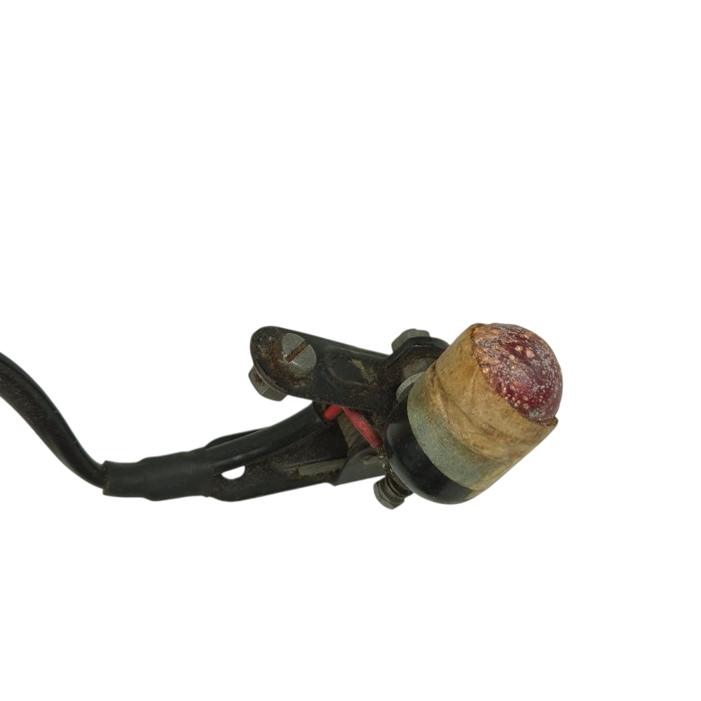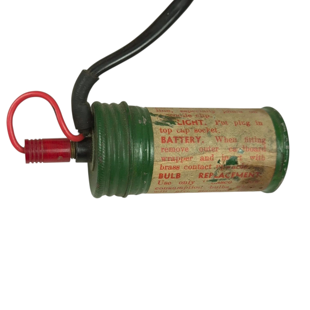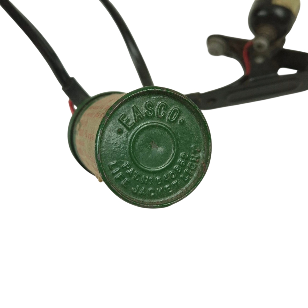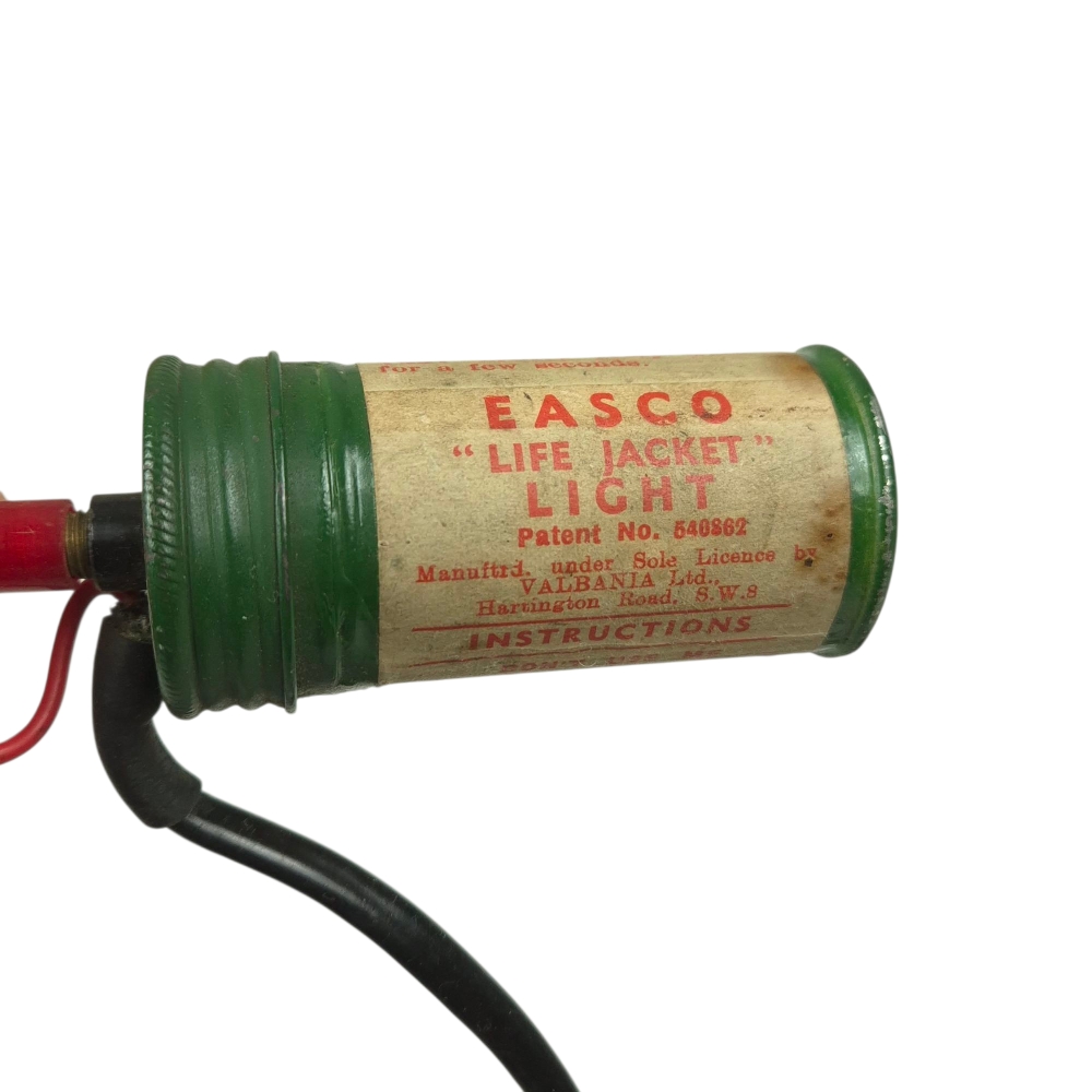 Original WWII RAF Mae West life jacket ditching light. EASCO made lamp . Red bulb housing (red bulb is hold in place by tape). Wiring with lower battery box complete with makers details . Shows wear.