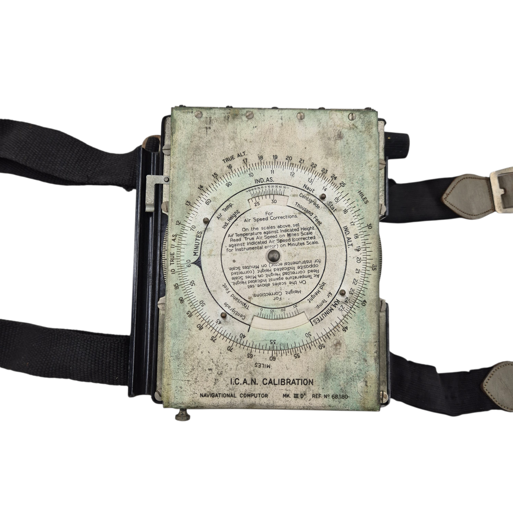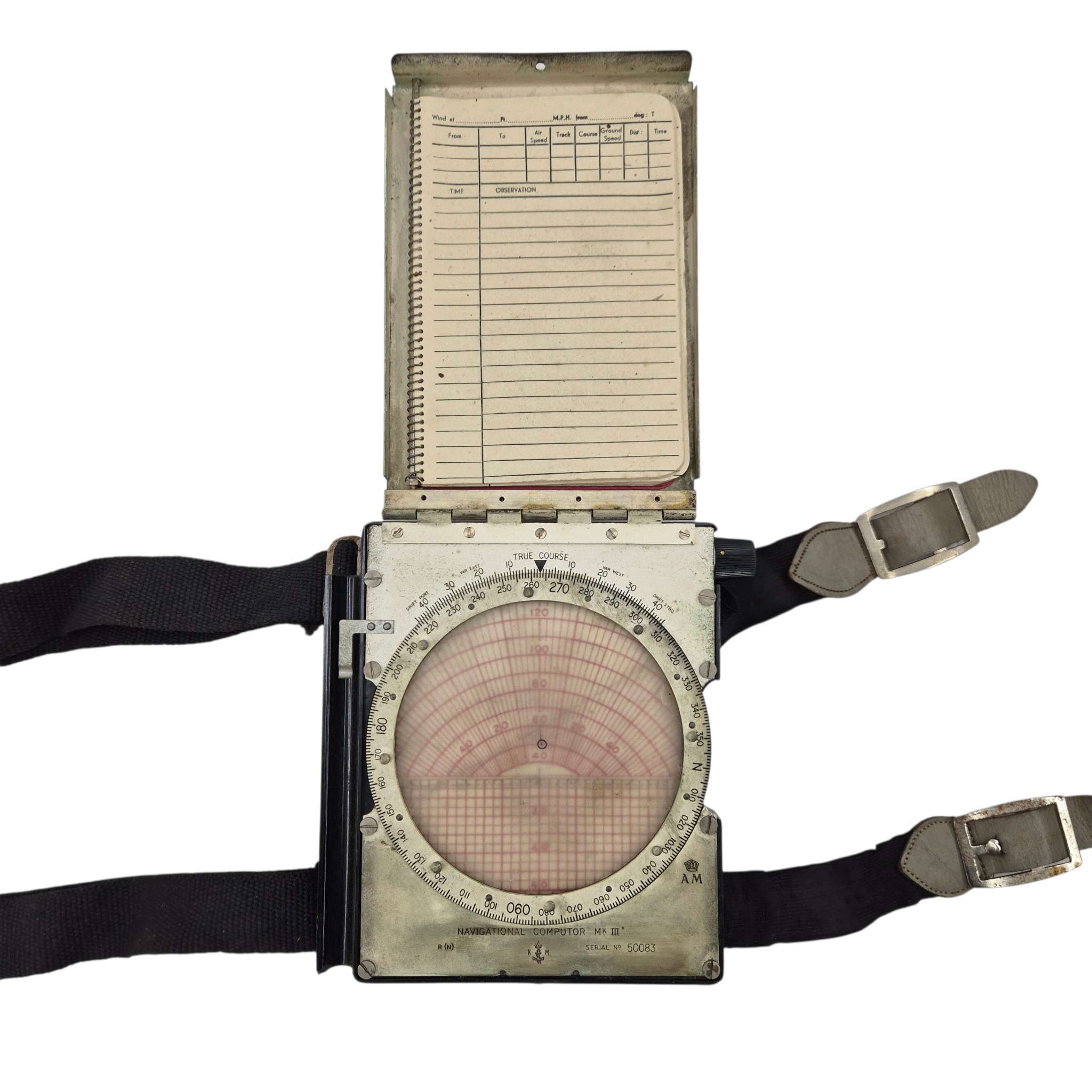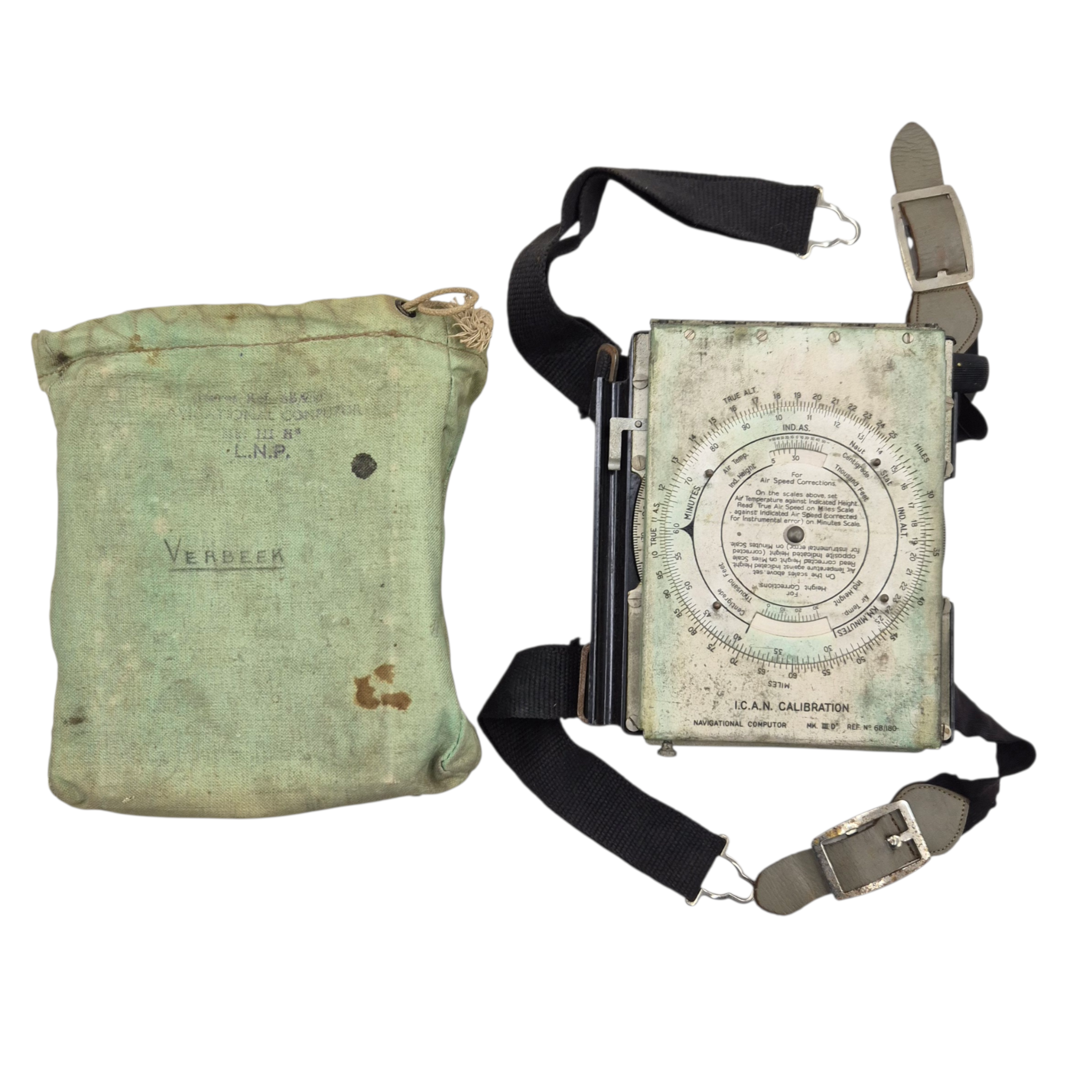 Original WWII RAF Navigation Computer Mk IIID, complete with its original storage bag. The computer retains the adjustable straps for attachment to the upper leg and is Air Ministry marked. It is additionally marked “KM”, indicating use by the Dutch Koninklijke Marine. The storage bag is also stamped and bears two period names. The original notebook remains present. A well-preserved and complete set.
