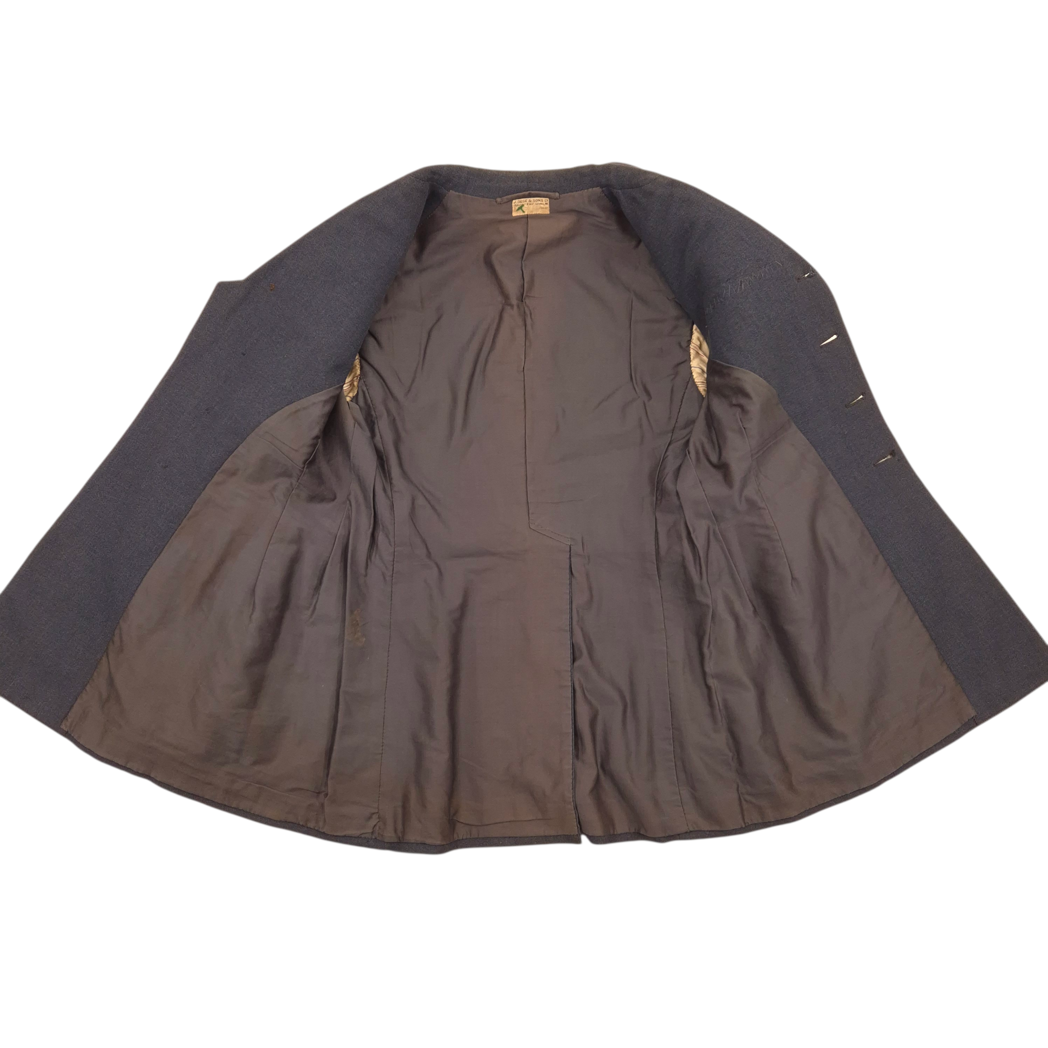 Original WWII RAF Service Dress jacket worn by Group Captain Richard Erskine Bain (b. 26-10-1900). Bain began his career as a Squadron Leader in 1936, was promoted to Wing Commander in 1940, and became Group Captain in January 1944. In 1939, he served as Commanding Officer of the 43rd Squadron RAF. The jacket is made by J. Dege & Sons Ltd, London, with the maker’s label dated 10-5-1931 or 1936 and marked Squadron Leader R.E. Bain. It is in good condition, showing traces of wear. Complete with ribbons.