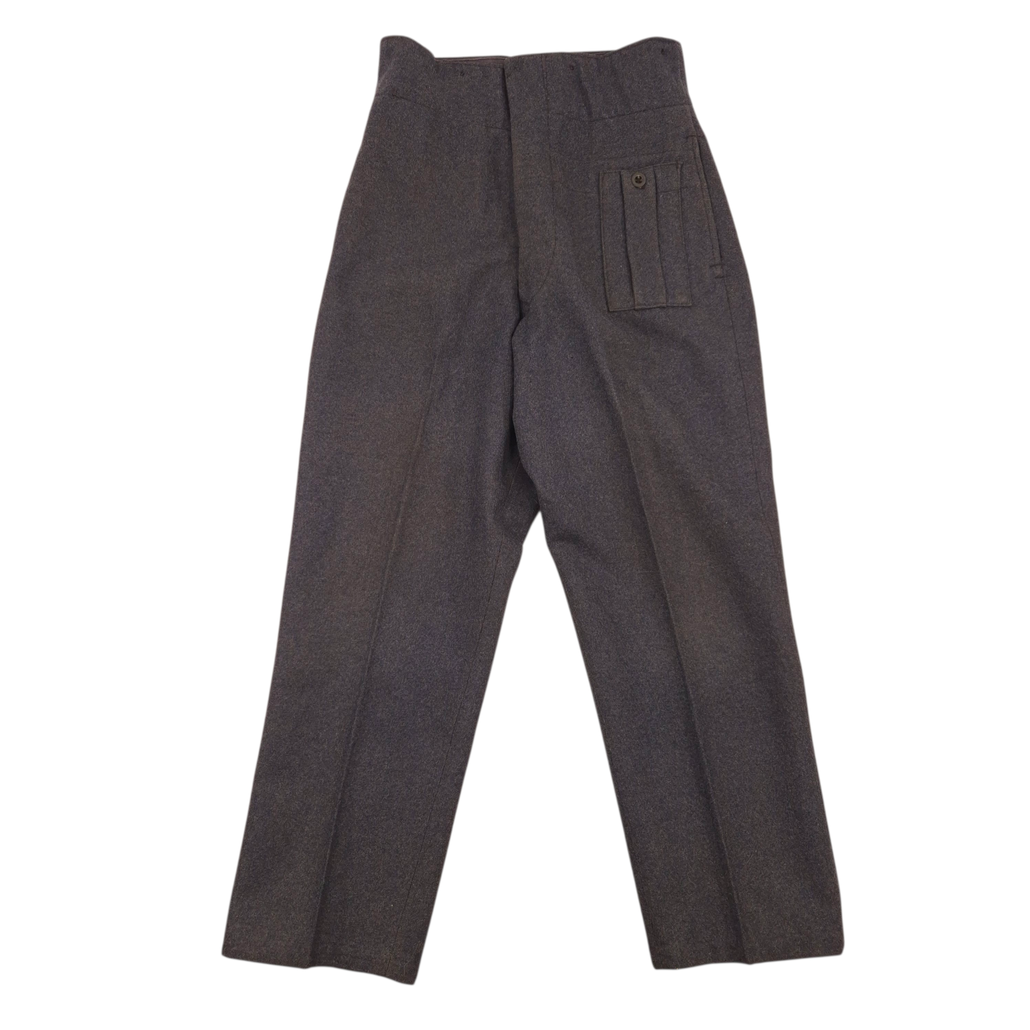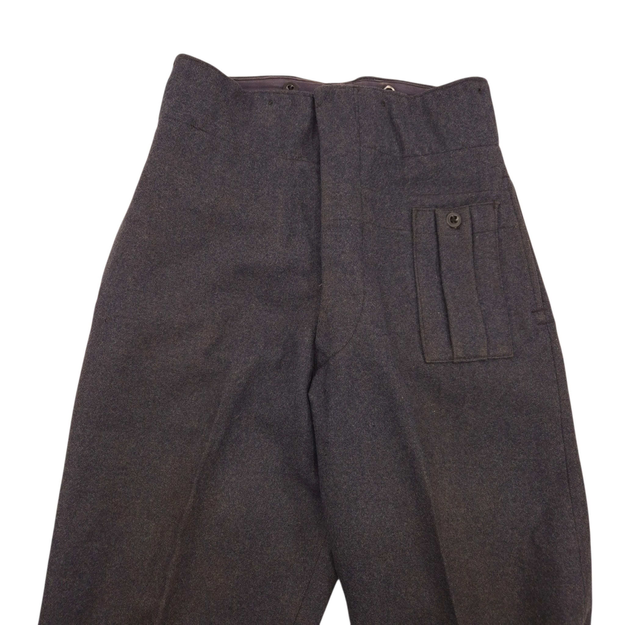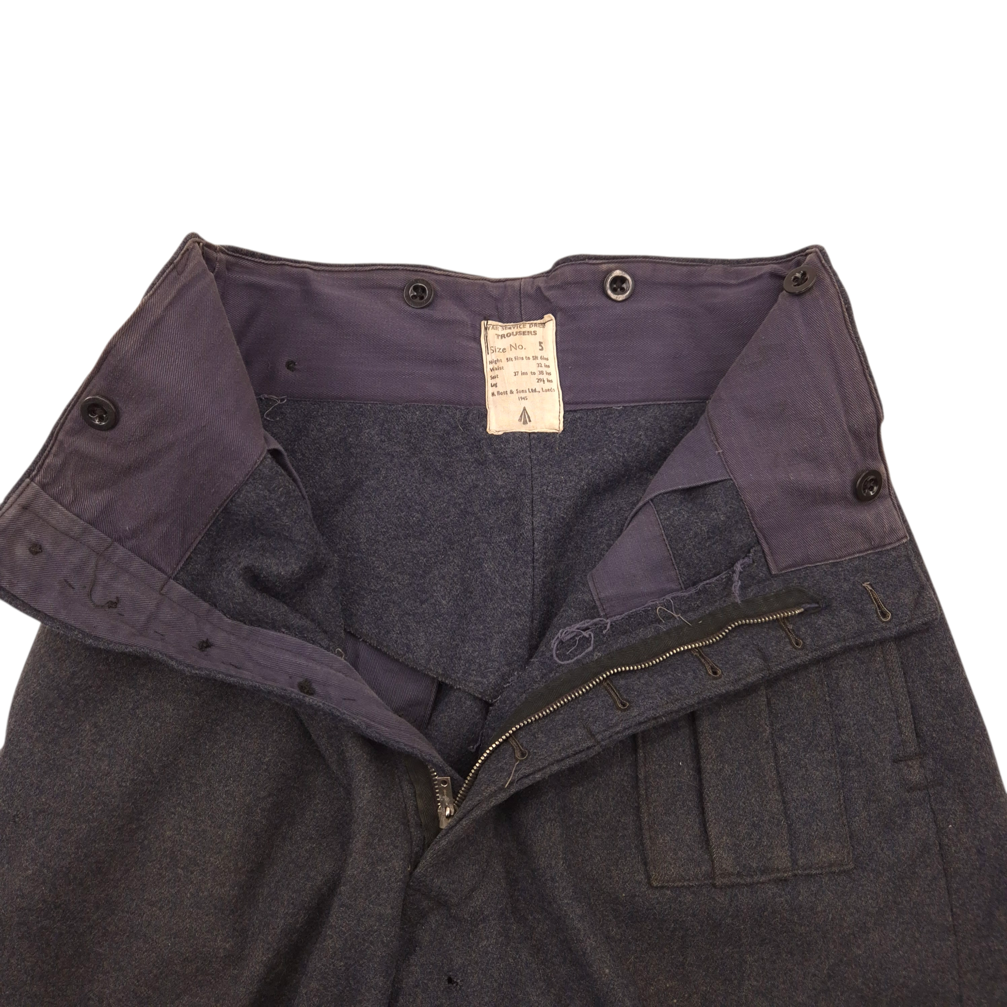 Original WWII RAF War Service Dress trousers. These trousers are in good condition, with some minor wear and two tiny moth damages. They retain their original label: War Service Trousers, size 5, manufactured by H BotT & Sons Ltd, and dated 1945. Broad arrow ‘Z’ stamped for 1945. Original buttons have been period-replaced with a zipper, functioning smoothly, swfit marked.