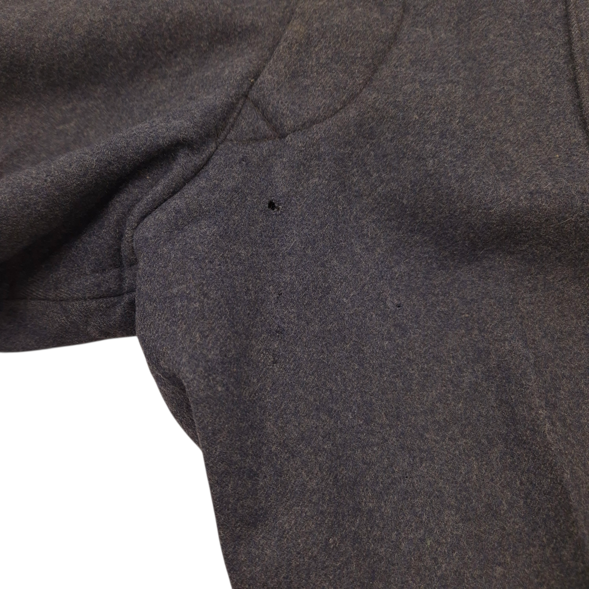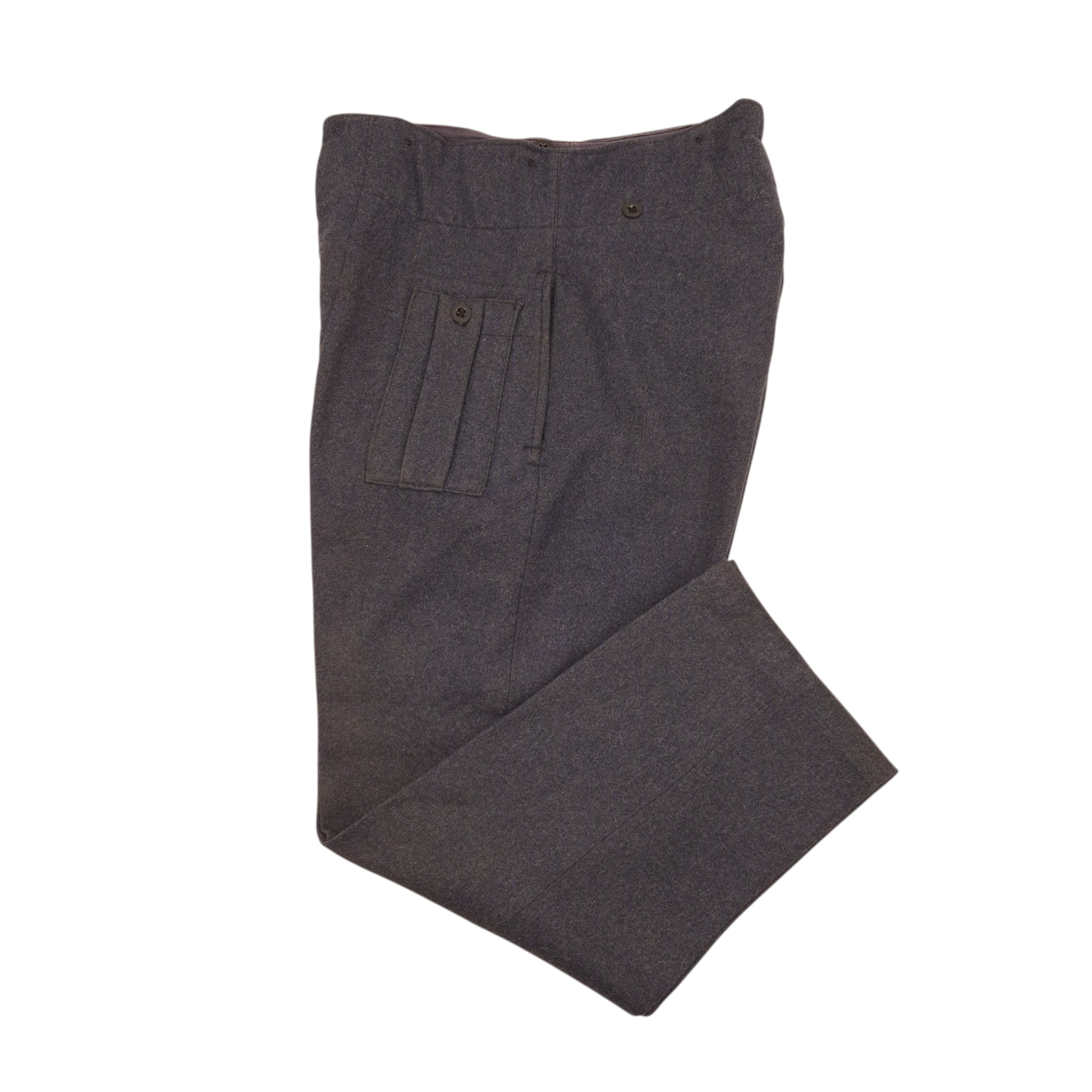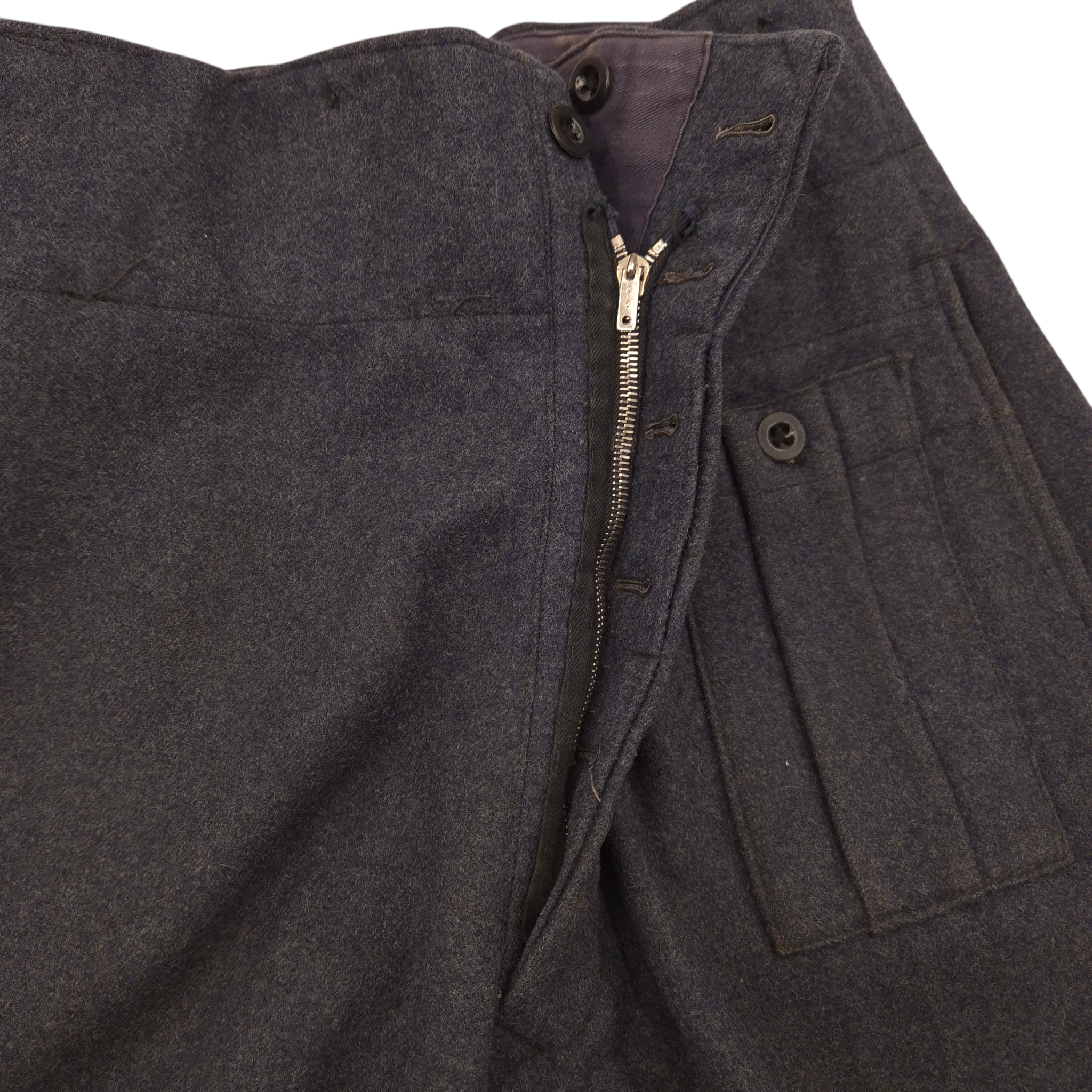 Original WWII RAF War Service Dress trousers. These trousers are in good condition, with some minor wear and two tiny moth damages. They retain their original label: War Service Trousers, size 5, manufactured by H BotT & Sons Ltd, and dated 1945. Broad arrow ‘Z’ stamped for 1945. Original buttons have been period-replaced with a zipper, functioning smoothly, swfit marked.