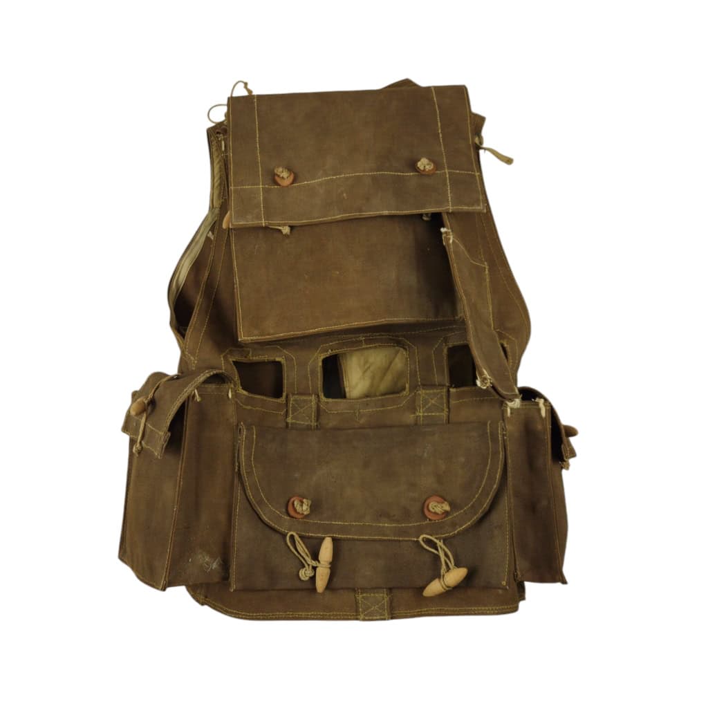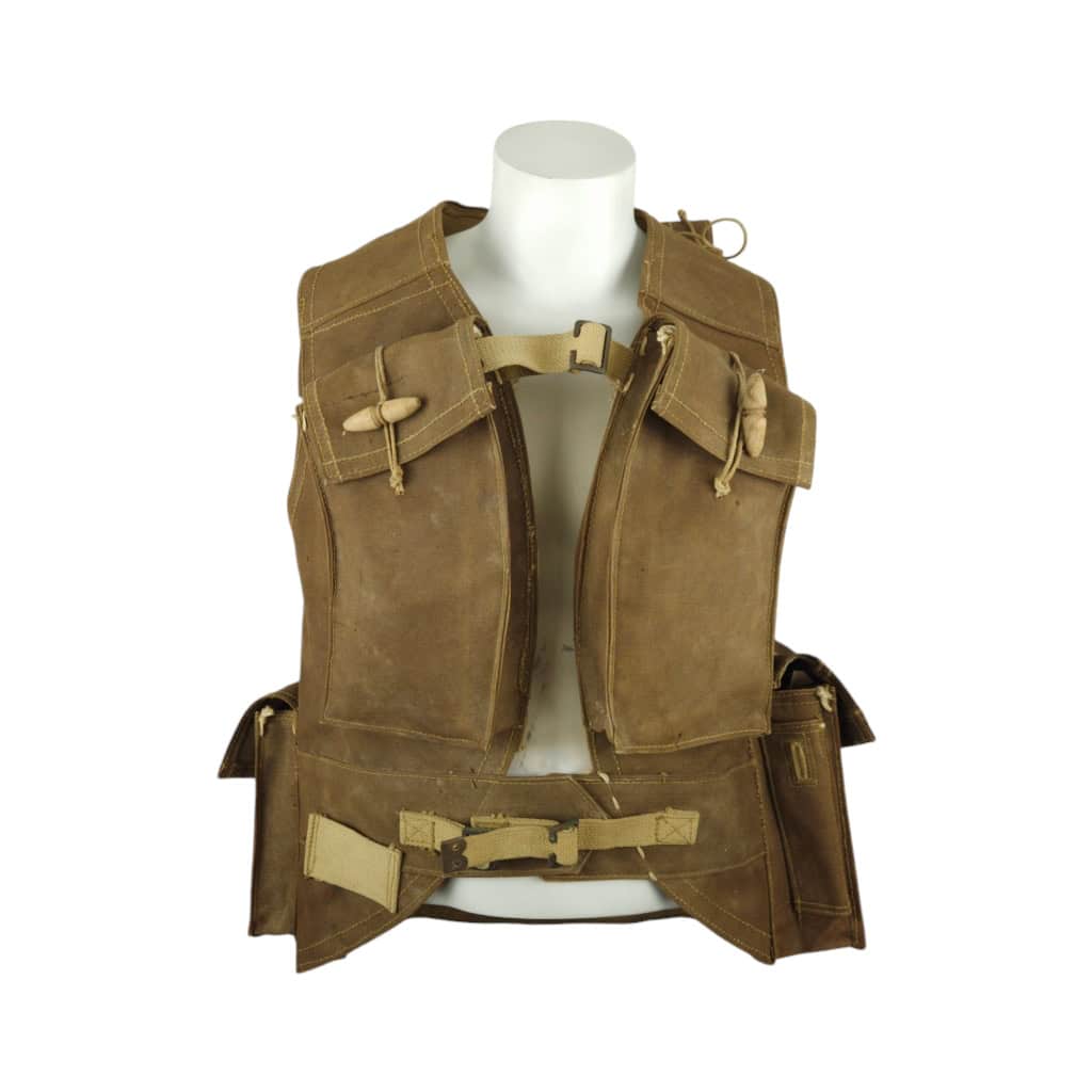 RARE original WWII British ‘Battle Jerkin’, also known as ‘Assault Jerkin’. The Battle Jerkin was developed in 1942 by Colonel Rivers-MacPherson for the British Army and introduced in 1943. History has it that he disliked the Pattern 37 web gear in common use at the time and took the opportunity to design something he thought more efficient. Typically made of heavy-duty canvas or similar materials, providing durability in combat conditions. It had multiple sewn-in pouches and pockets for carrying ammunition, grenades, and other essential equipment, making it more efficient than the belt-based webbing systems. The brown Battle-Jerkins were heavily issued to British and Canadian assault troops of the 21st Army Group. This Battle-Jerkin is in good and field worn condition, uncleaned, there is still sand on the closing-strap buckle (see photo). Maker marked by W&G and dated 1943 in size Medium. Strings for gascape are also present to both shoulders. All strings and toggles are present.