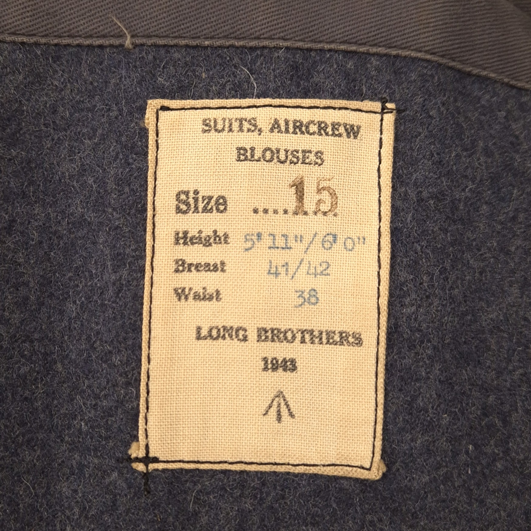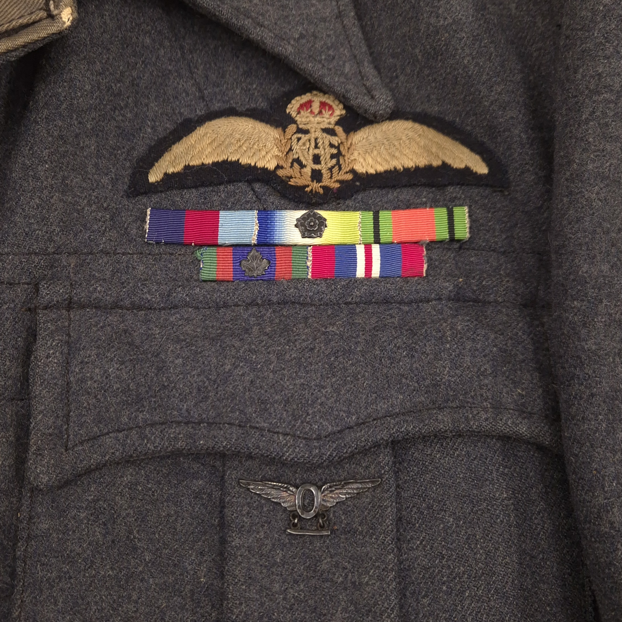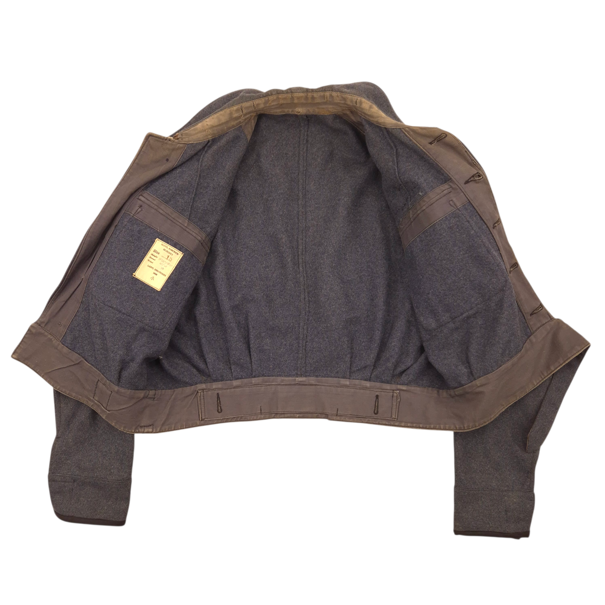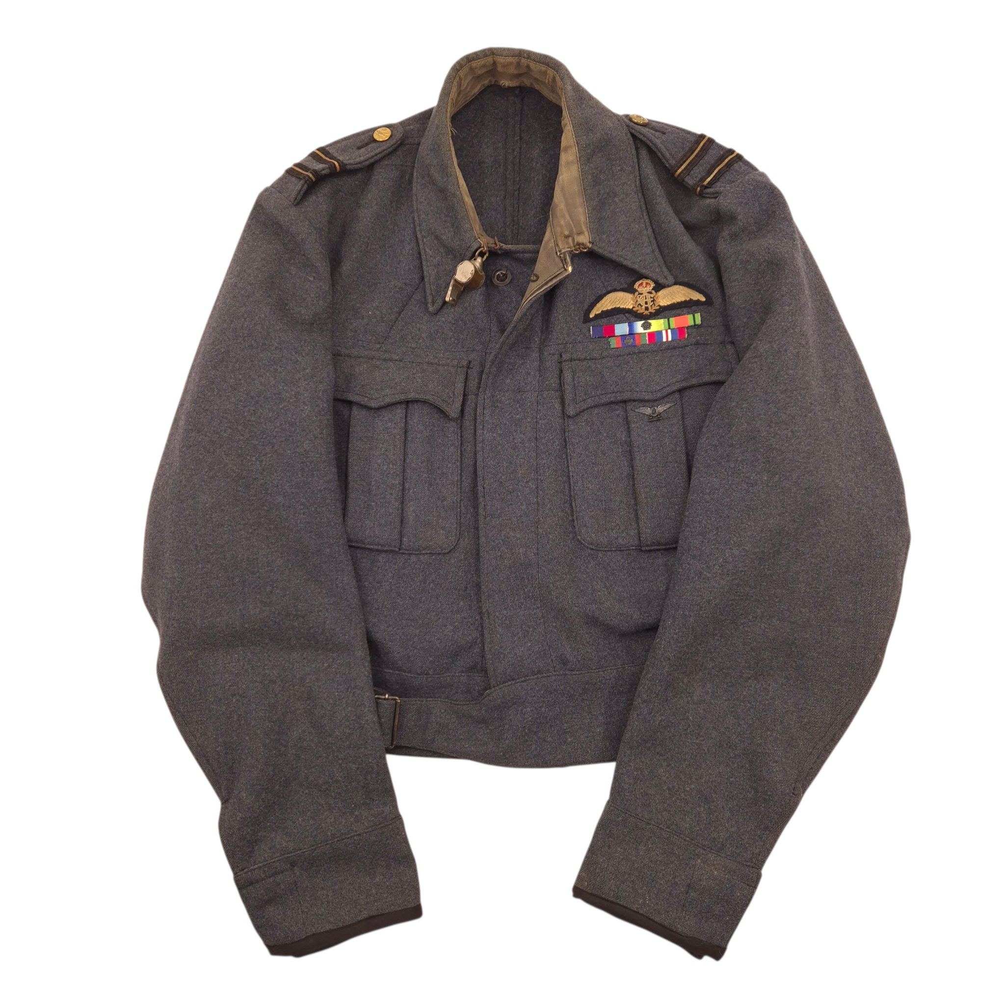 Original WWII Royal Canadian Air Force (RCAF), Flight Lieutenant, Suits Aircrew battledress blouse. This is a British early manufactured jacket and retaining its original maker’s label: Suits, Aircrew Blouses, Size 15, made by Long Brothers and dated 1943. Flight Lieutenant rank on both shoulder straps, a nicely applied pilot wing, and period medal ribbons. The jackets comes with an original whistle attached to the collar. The jacket shows no damage or repairs, only honest traces of wear. An attractive WWII RCAF aircrew blouse.