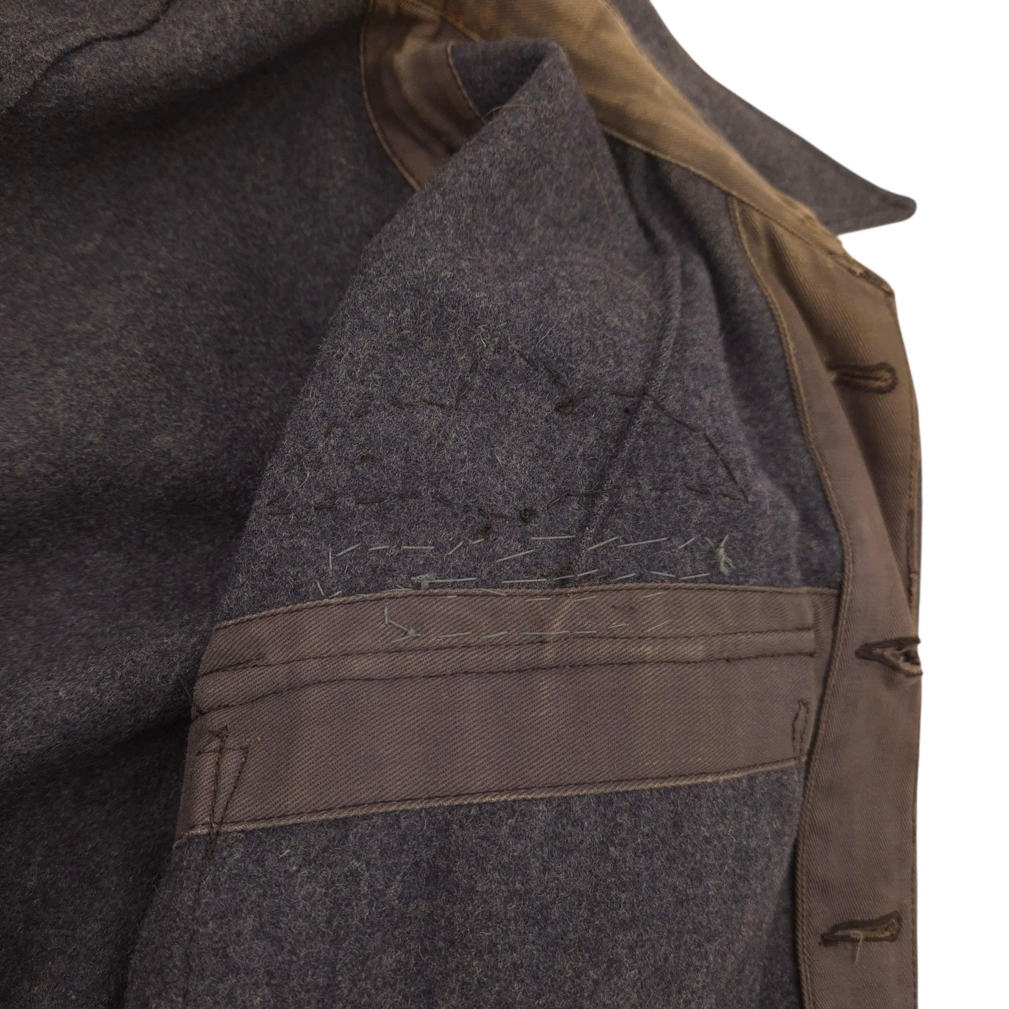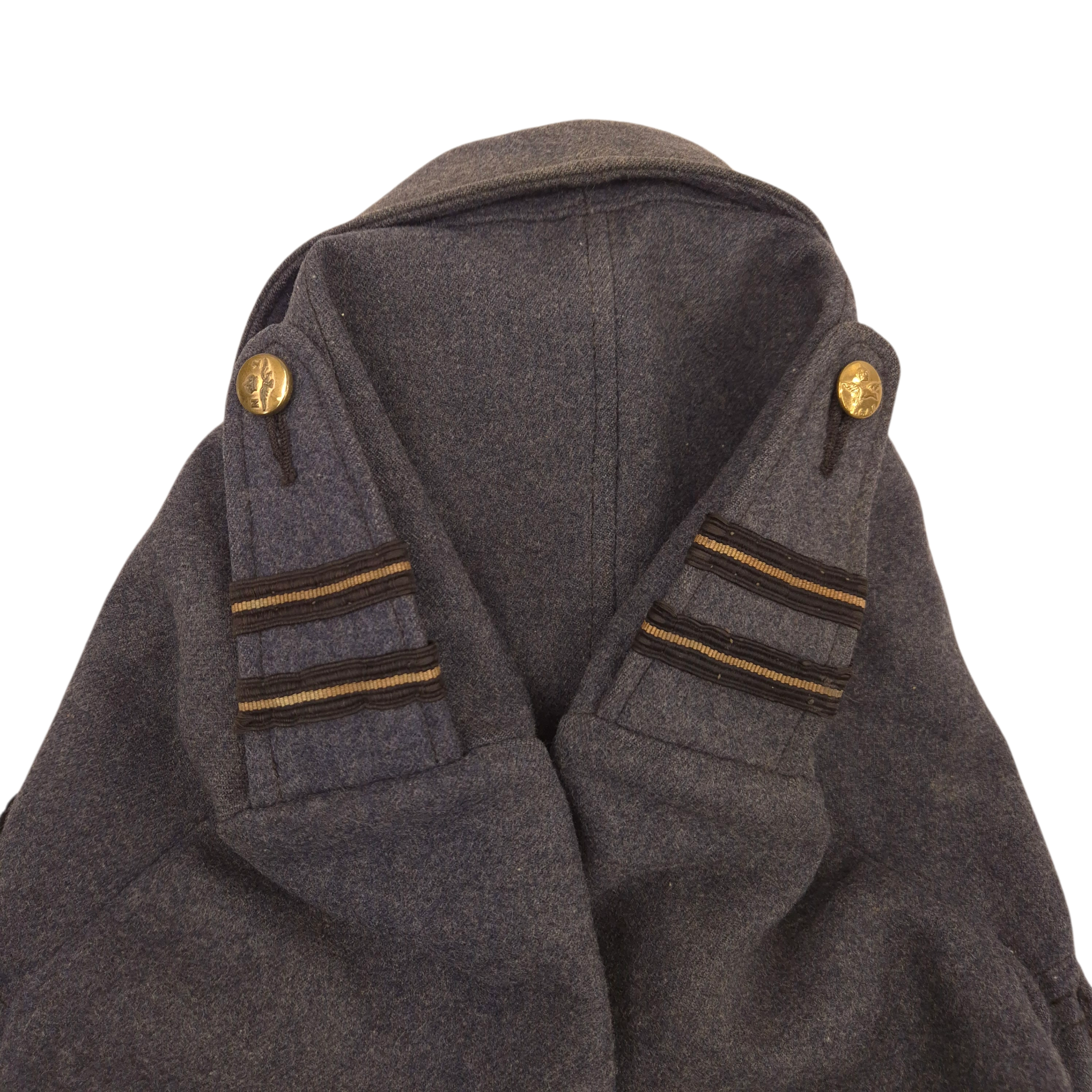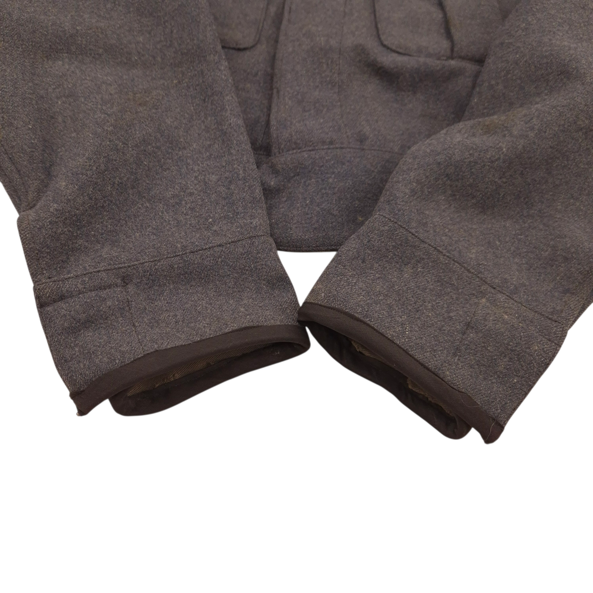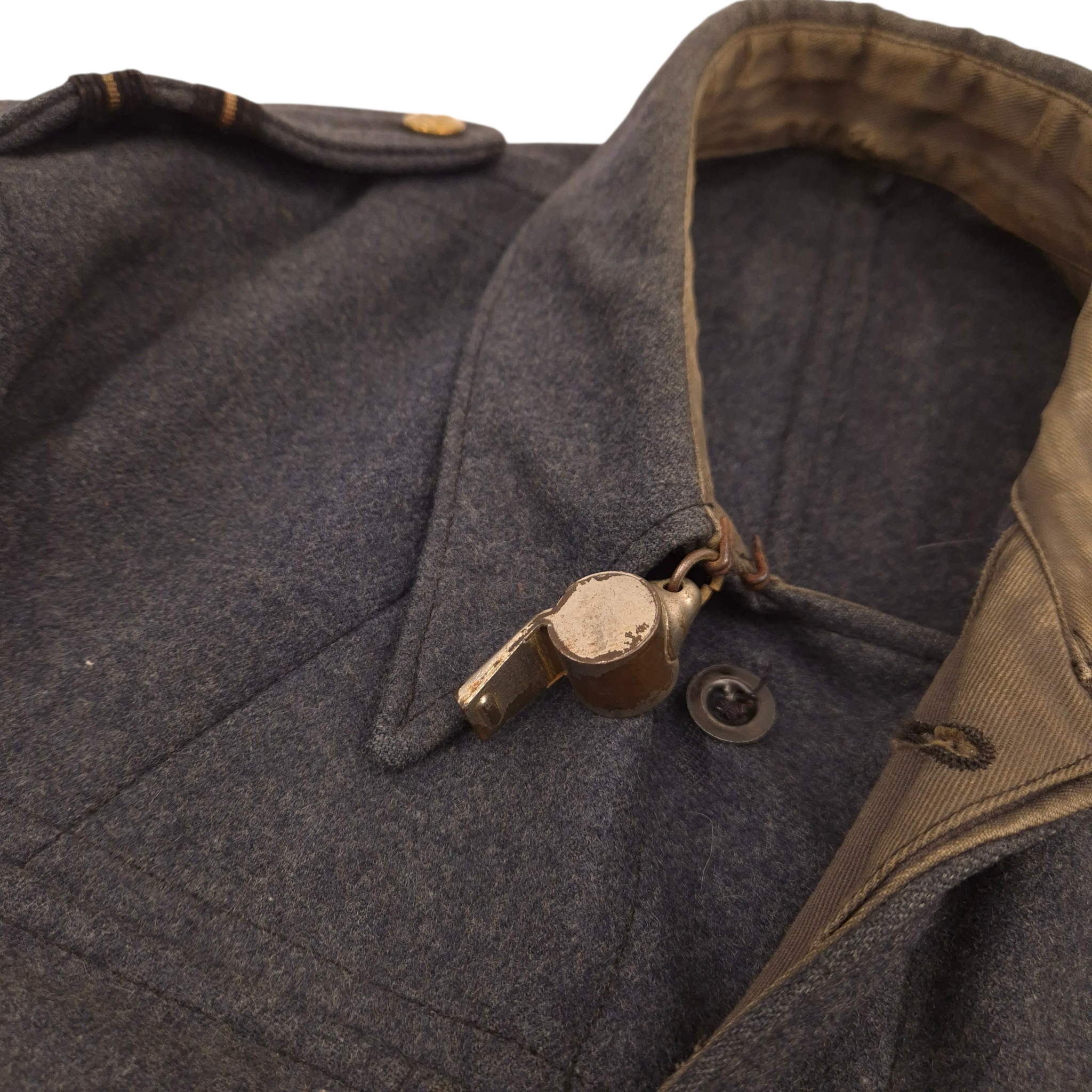 Original WWII Royal Canadian Air Force (RCAF), Flight Lieutenant, Suits Aircrew battledress blouse. This is a British early manufactured jacket and retaining its original maker’s label: Suits, Aircrew Blouses, Size 15, made by Long Brothers and dated 1943. Flight Lieutenant rank on both shoulder straps, a nicely applied pilot wing, and period medal ribbons. The jackets comes with an original whistle attached to the collar. The jacket shows no damage or repairs, only honest traces of wear. An attractive WWII RCAF aircrew blouse.