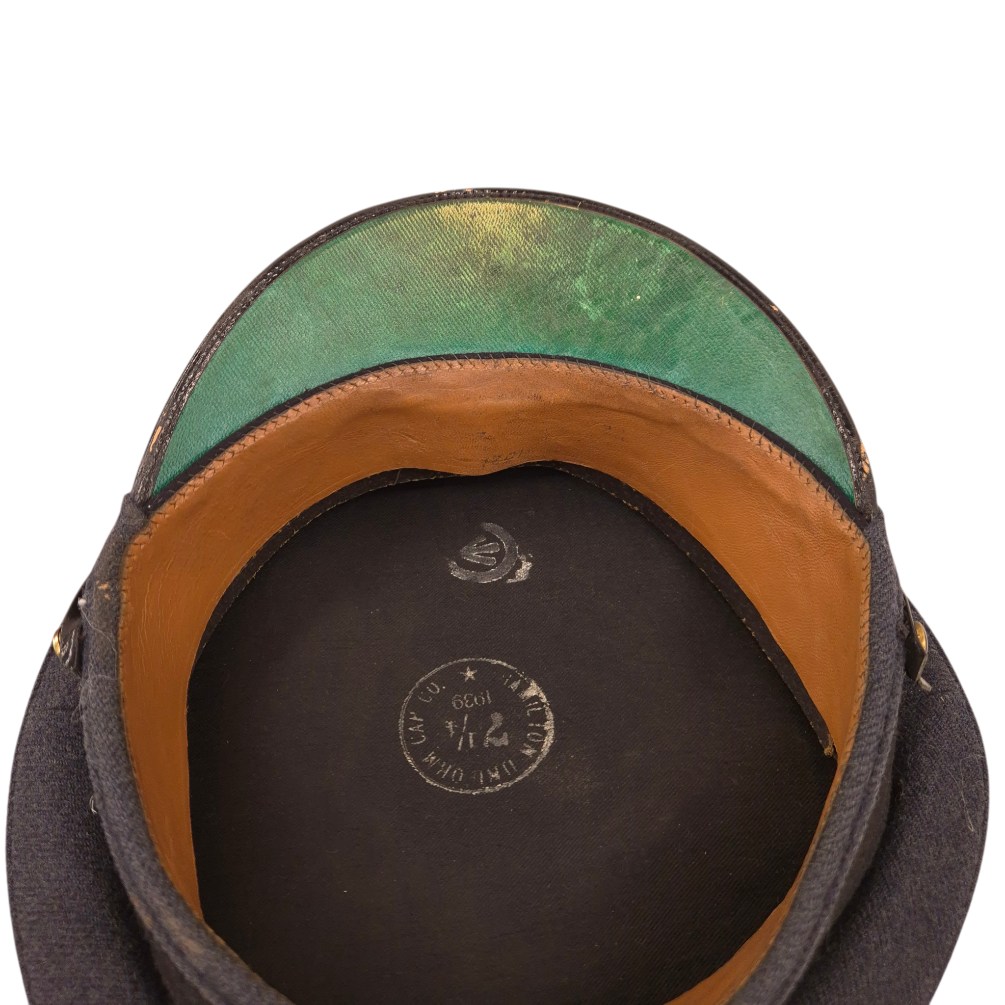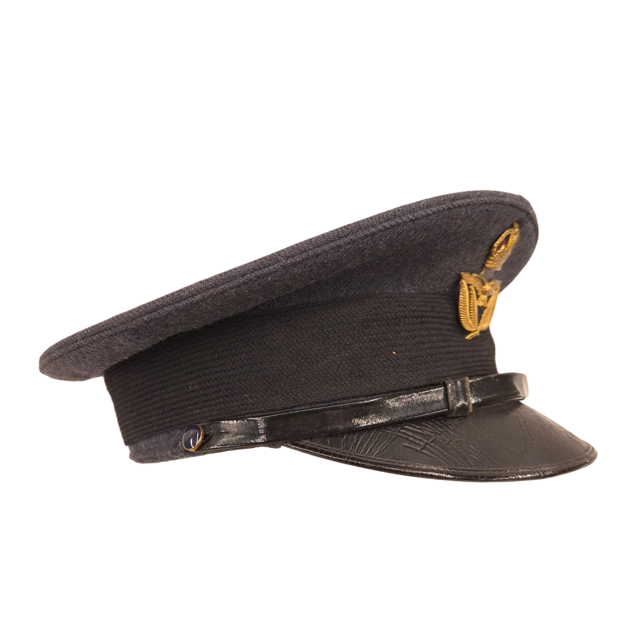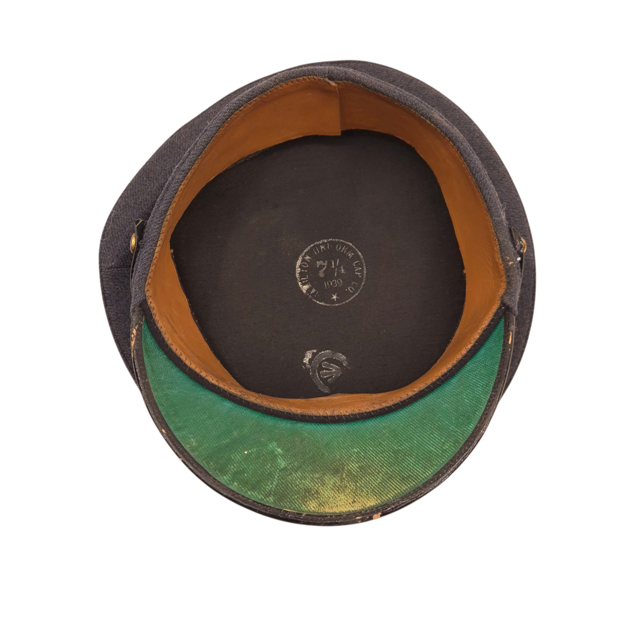 Original WWII Royal Canadian Air Force, Warrant Officer, service dress cap. The cap was worn by Thomas C. SISMAN with service number R-51021.Authentic 1939-dated RCAF Warrant Officer cap featuring the correct blue-grey crown and body, black mohair band, black patent leather peak, and black chinstrap secured by plain buttons. Complete with King’s Crown gilt RCAF Warrant Officer cap badge. Made by Hamilton Uniform Cap Co., dated 1939, size 7 1/4, with C Broad Arrow stamp. Clean, well-preserved condition with strong shape.