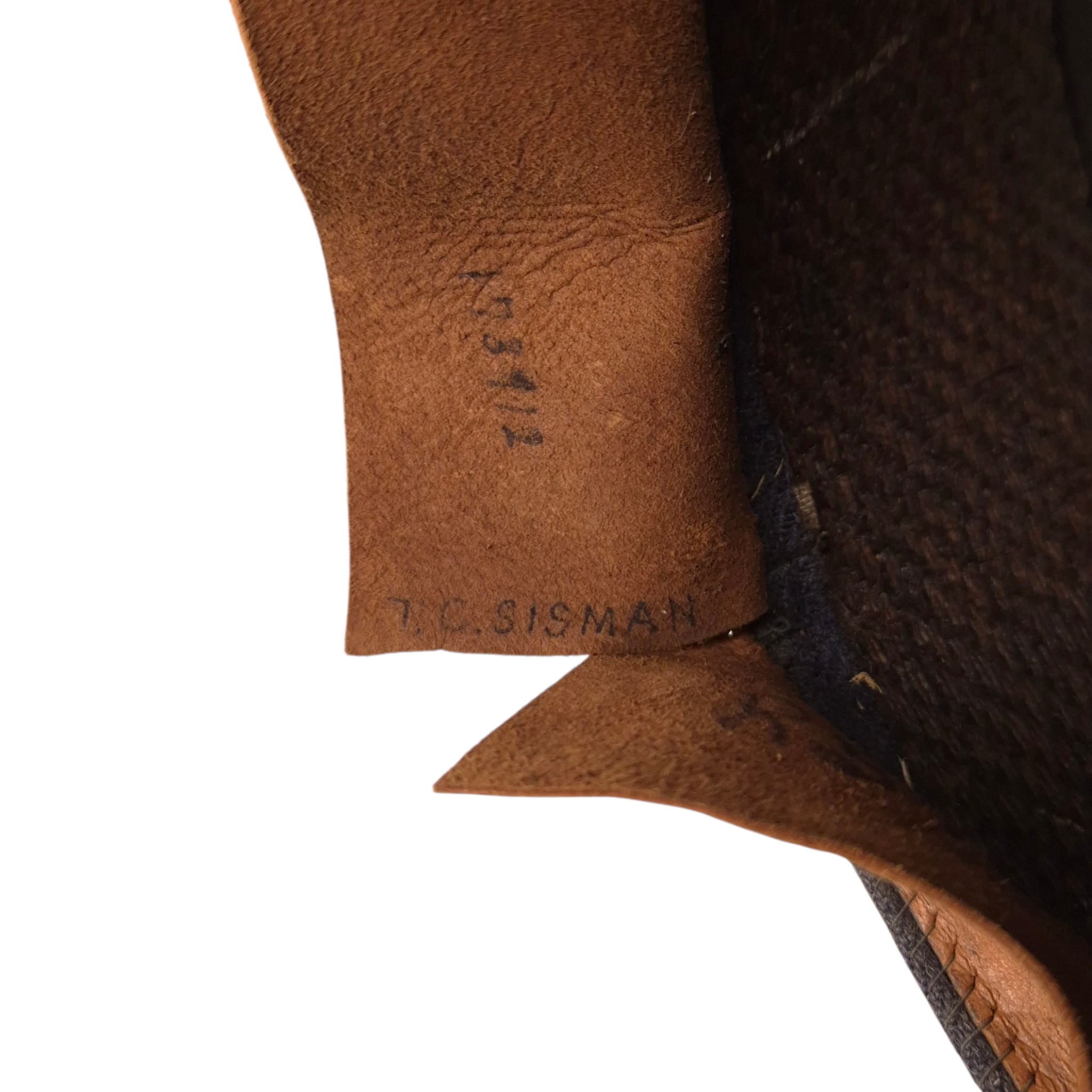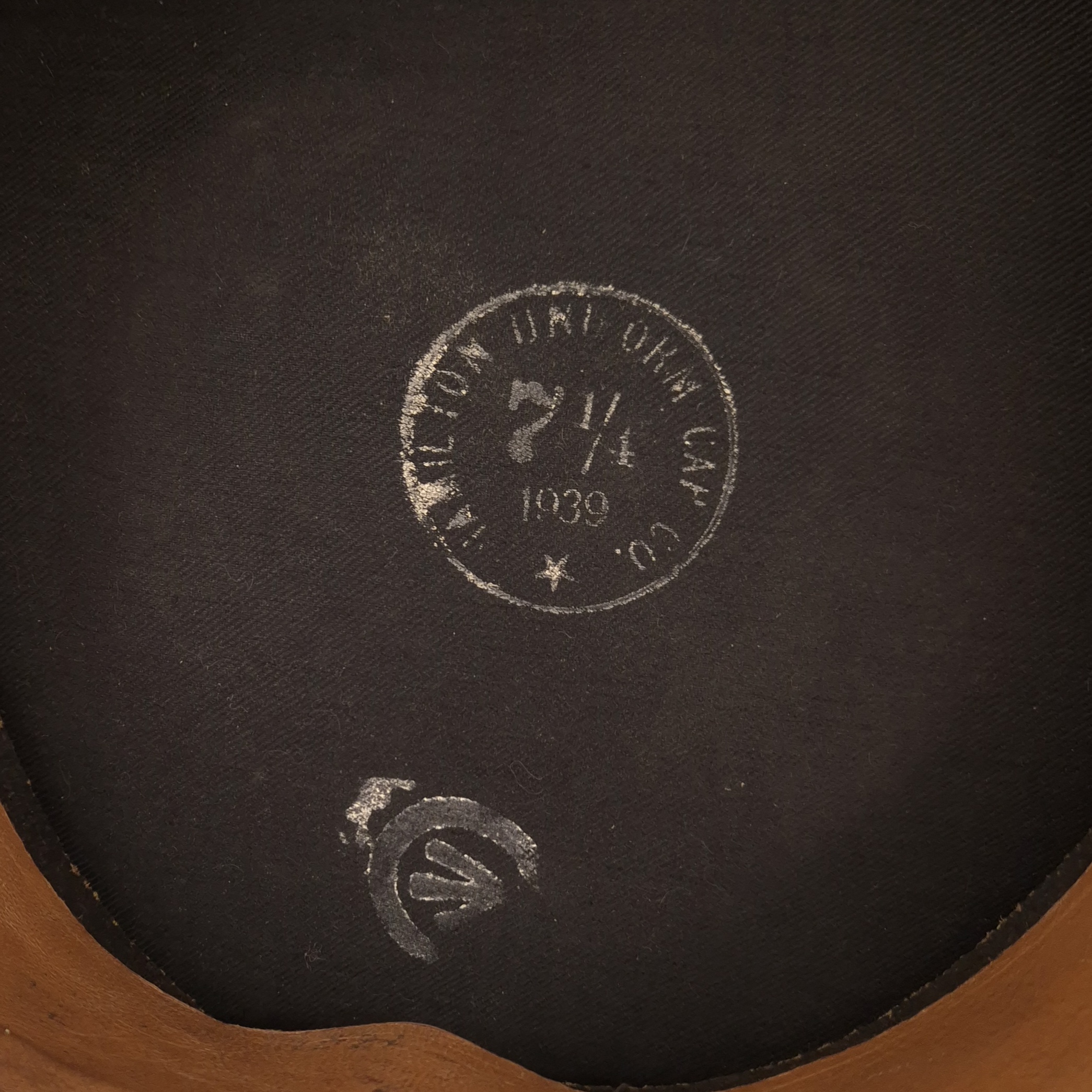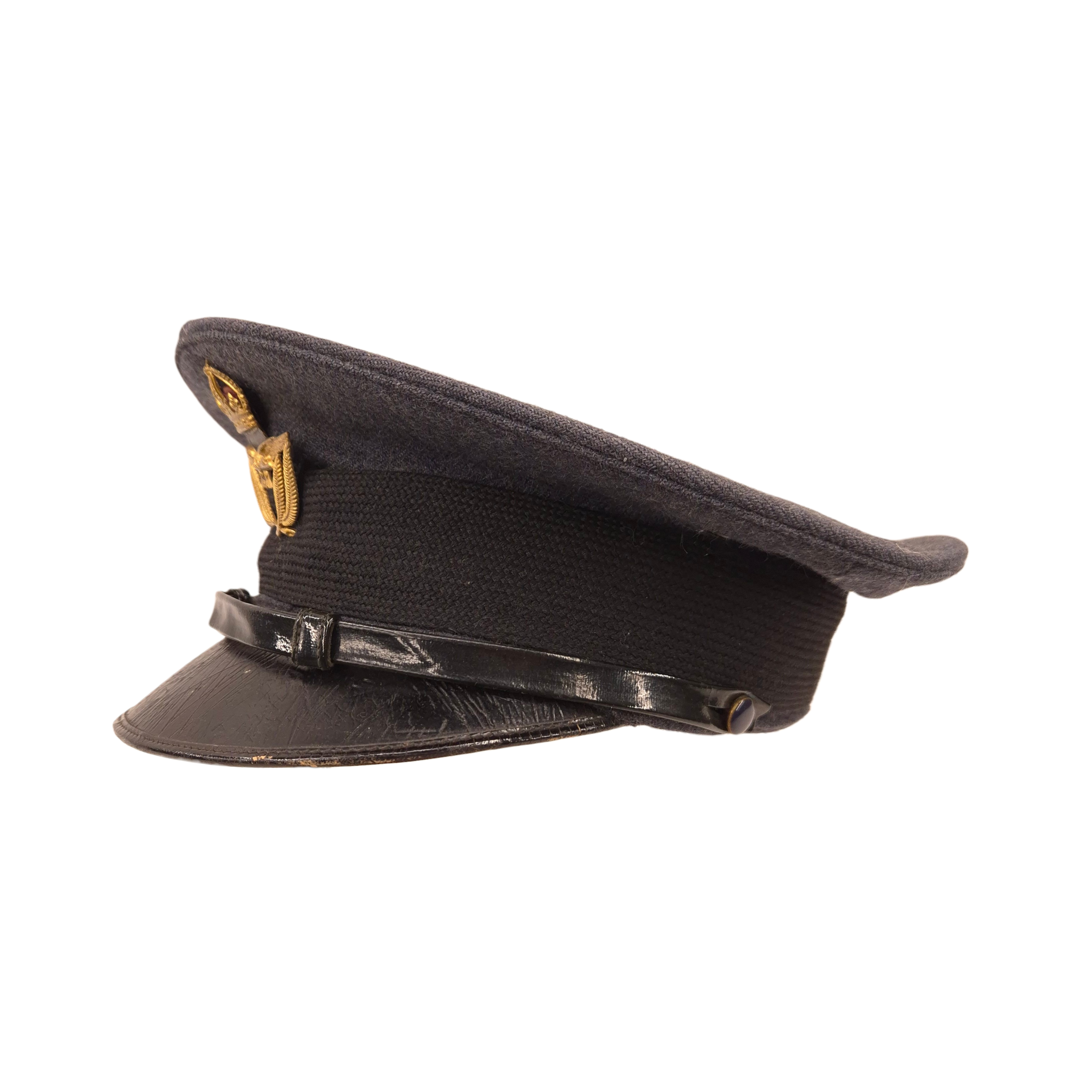 Original WWII Royal Canadian Air Force, Warrant Officer, service dress cap. The cap was worn by Thomas C. SISMAN with service number R-51021.Authentic 1939-dated RCAF Warrant Officer cap featuring the correct blue-grey crown and body, black mohair band, black patent leather peak, and black chinstrap secured by plain buttons. Complete with King’s Crown gilt RCAF Warrant Officer cap badge. Made by Hamilton Uniform Cap Co., dated 1939, size 7 1/4, with C Broad Arrow stamp. Clean, well-preserved condition with strong shape.