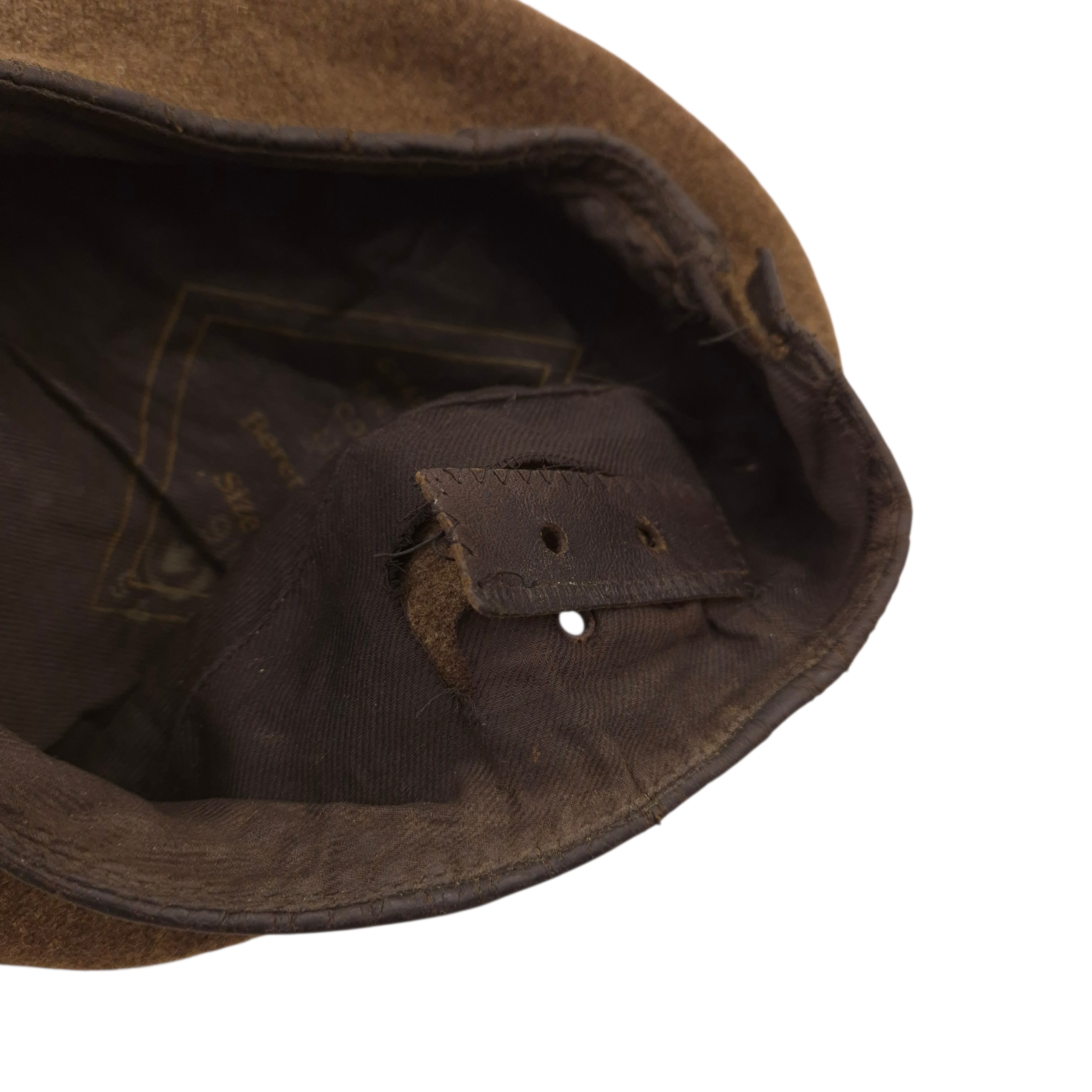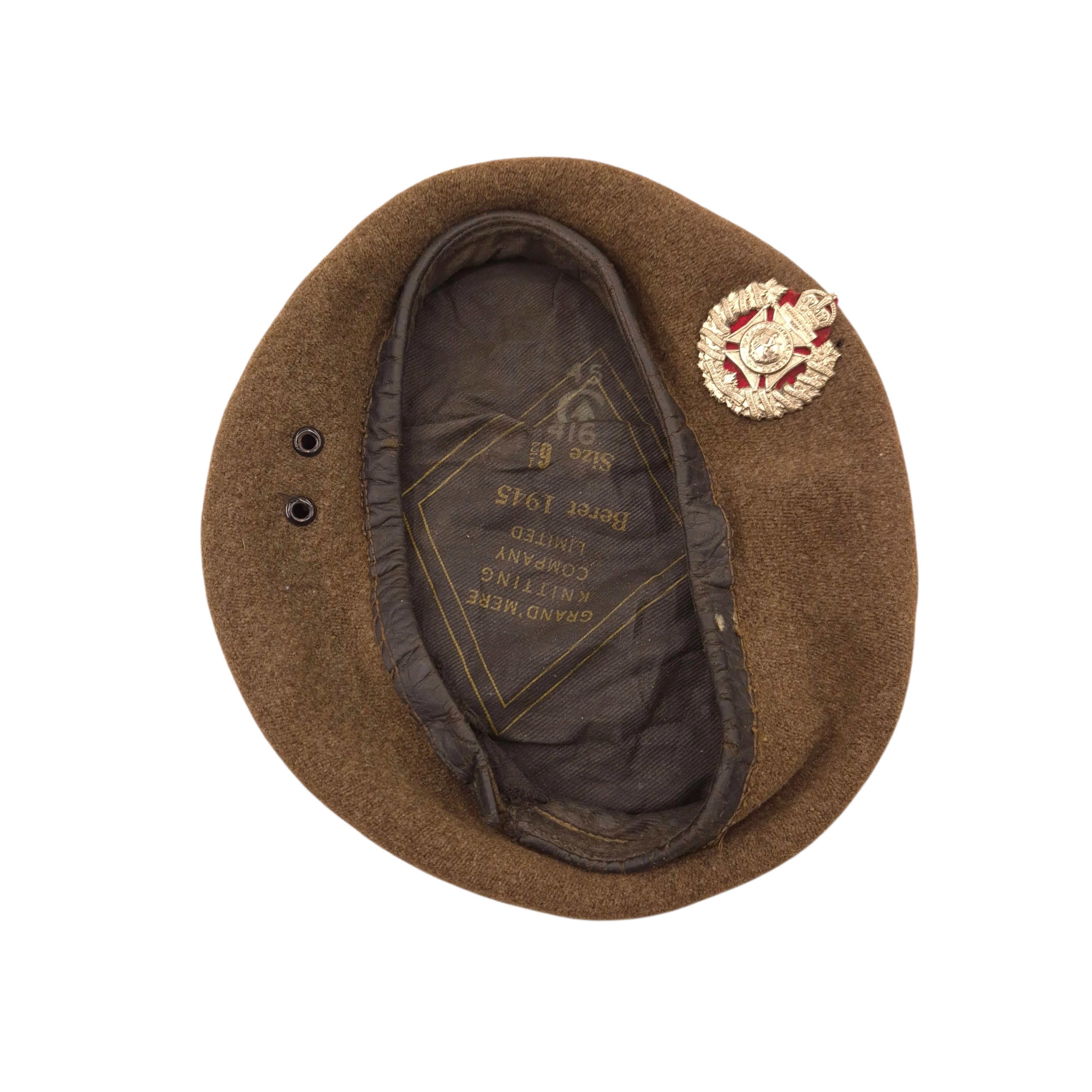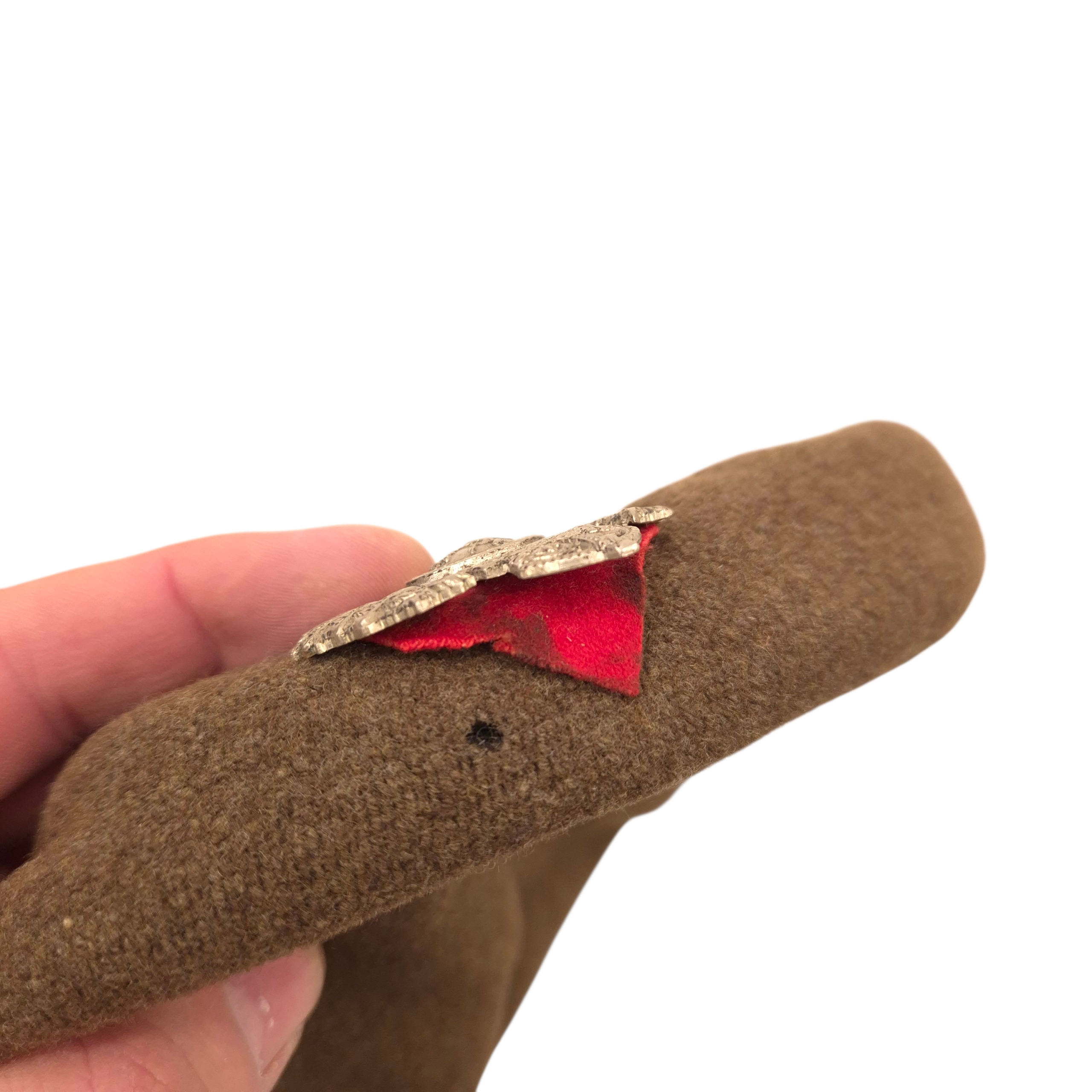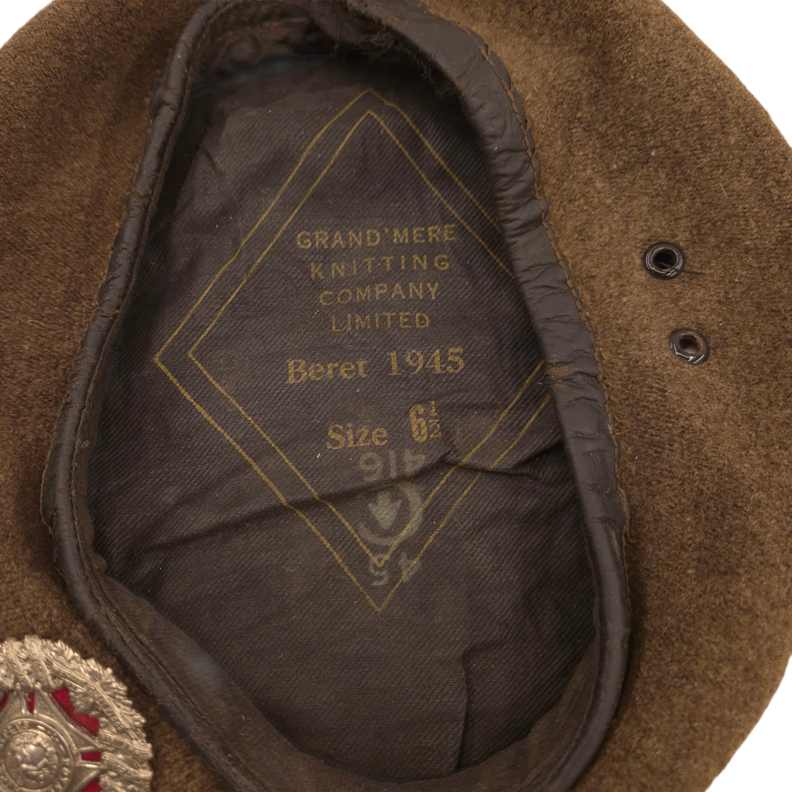 Original WWII Royal Winnipeg Rifles beret with its original applied cap badge. The beret is heavily used and shows clear traces of wear, shows damages. The cap badge and its red backing remain original and firmly in place. Of particular interest is the red backing, as Rifles units normally used green backing; it is clearly original and not a later addition. On the inside, behind the cap badge, is a protective cloth pad used to keep the badge secure and prevent wear to the beret, a common practice among soldiers at the time. The beret was manufactured by Grand’Mère Knitting Company, dated 1945, size 6½.