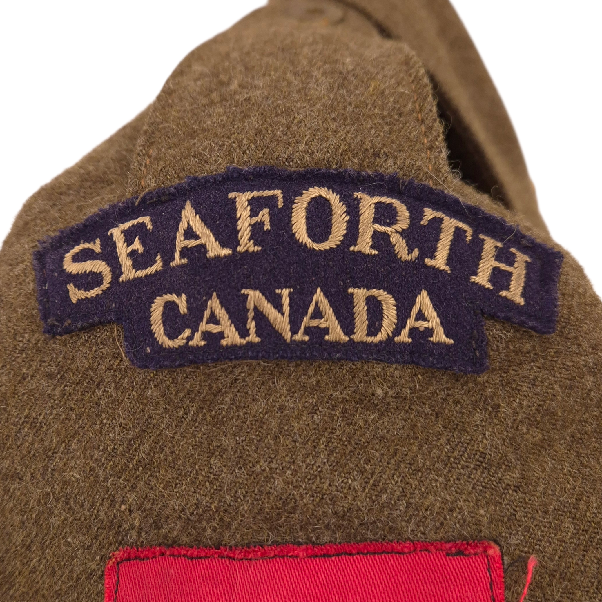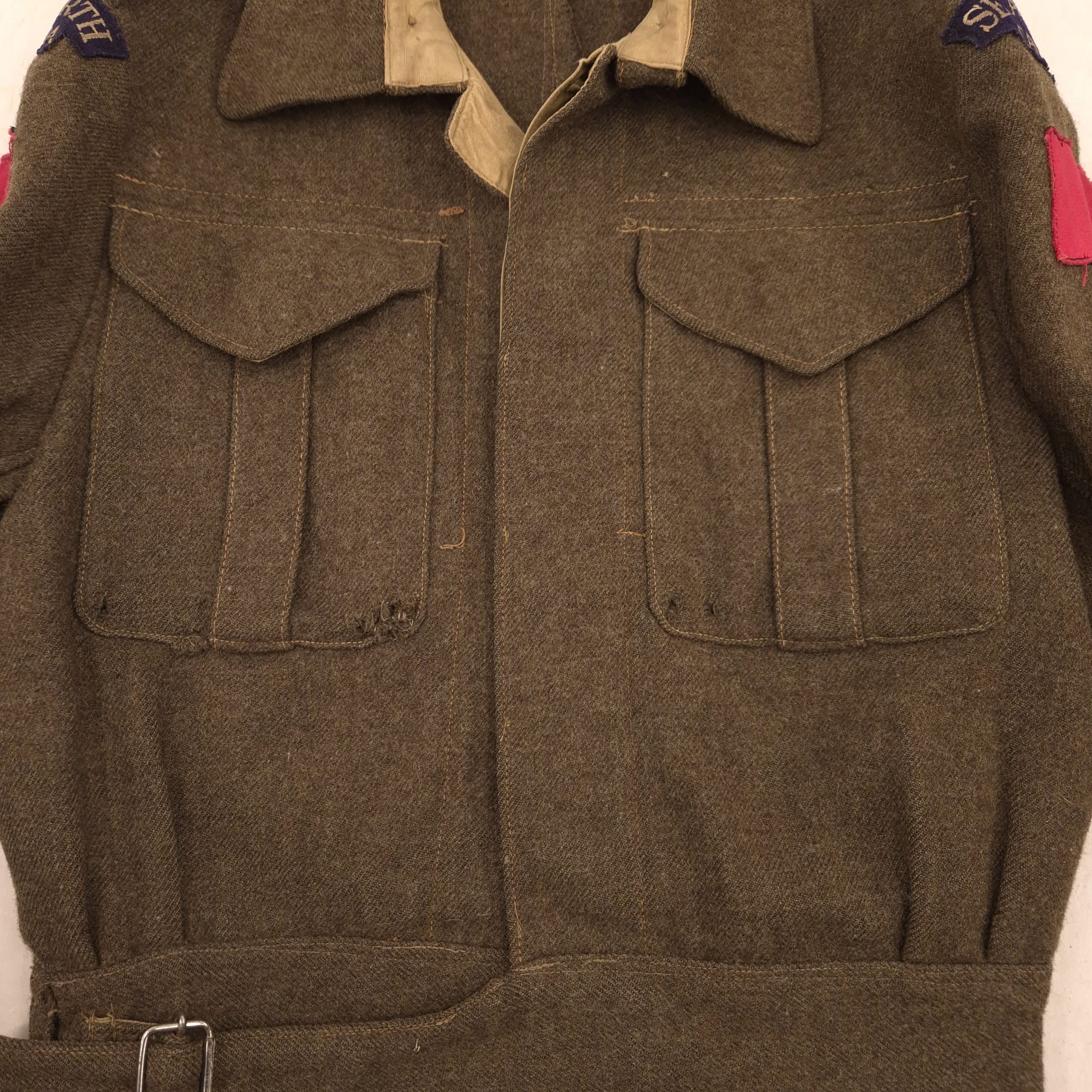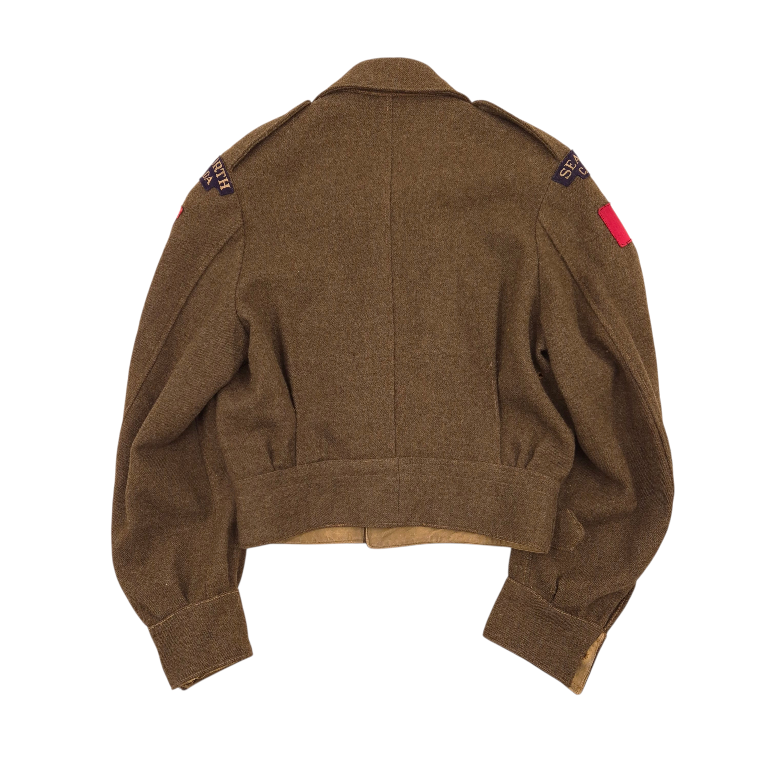 Original WWII Seaforth Highlanders of Canada battle dress jacket worn by Private James Stuart Ross, a steelworker from Vancouver, B.C. (Service Number: K-51667). He was awarded the 1939–1945 Star, Italy Star, France & Germany Star, Canadian Volunteer Service Medal & Clasp, and War Medal 1939–1945. Ross served in the United Kingdom, Italy, and Europe, arriving in the UK on November 23, 1943, with D-Company, Seaforth Highlanders of Canada. He arrived in Italy on January 13, 1944, serving there until March 14, 1945, and subsequently in the Netherlands from March 15, 1945. He was wounded in action on December 26, 1944. The jacket is in worn condition, with some damage to pocket corners and minor wear, and features a stunning pair of British-made embroidered “Sheriff” shoulder titles and printed 1st Canadian Infantry Division formation patches. Ross’s name and service information are written inside the jacket. Maker markings are faded, with the date 1944 barely visible upon close inspection. A fascinating piece of Canadian military history, with stunning shoulder titles and accompanied by his service records from the Canadian archives.